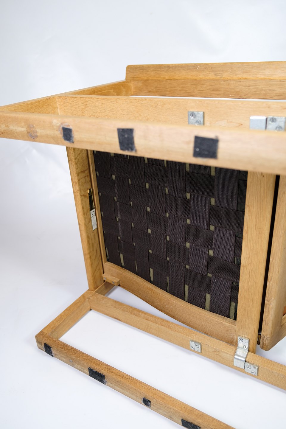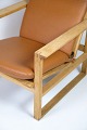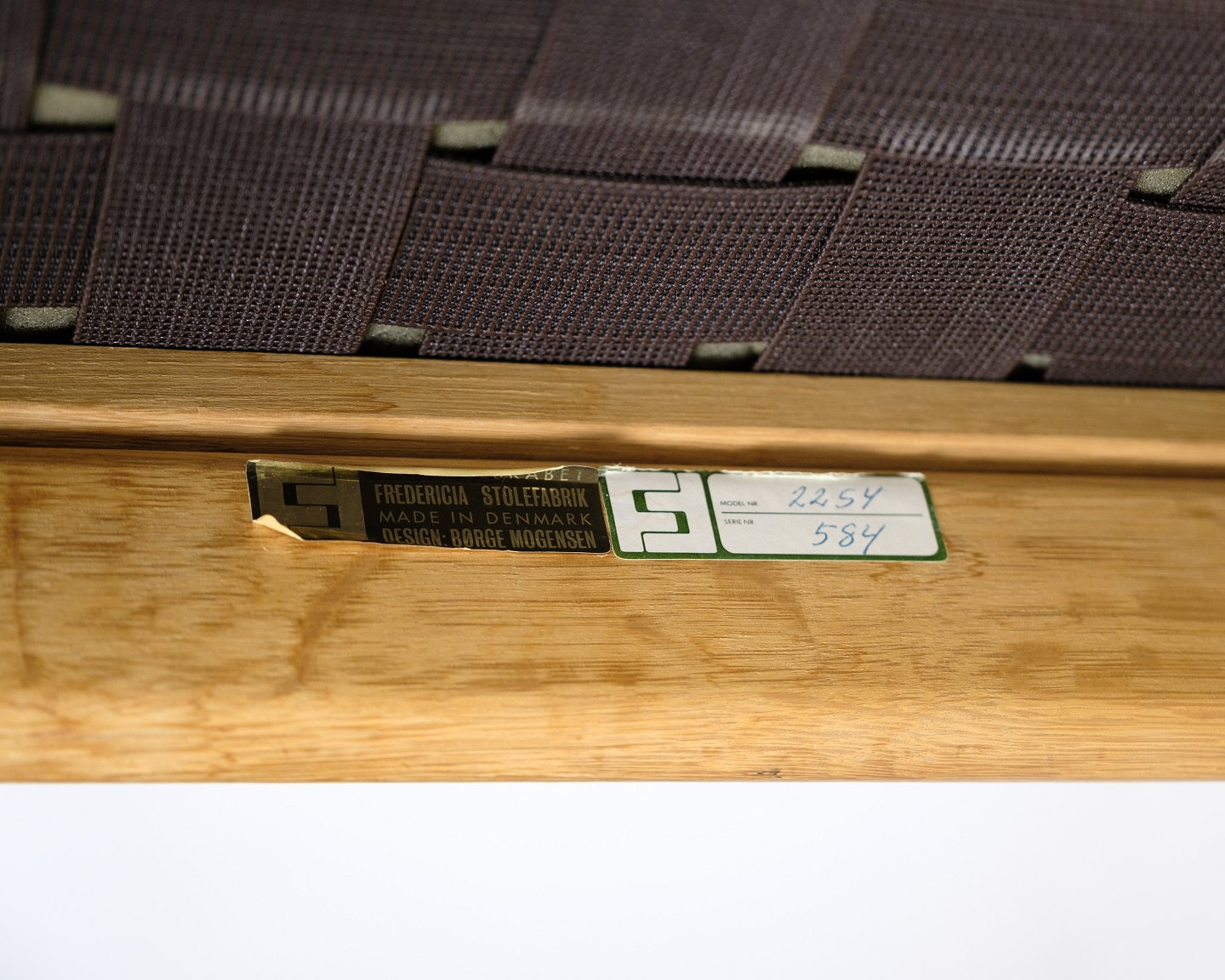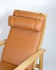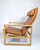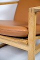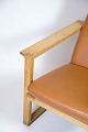 SolgtSlædestolen, model BM2254, designet af Børge Mogensen og fremstillet af Fredericia Stolefabrik. Stolen er udført i lys eg med sæde og ryglæn polstret i cognacfarvet Elegance læder, som giver et varmt og klassisk udtryk. Det karakteristiske slædeformede stel understreger både stabilitet og lethed i designet, samtidig med at det sikrer god komfort.