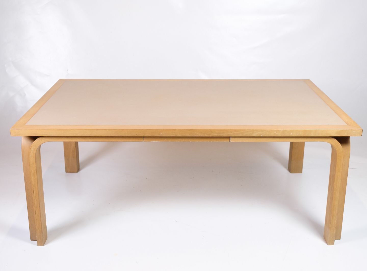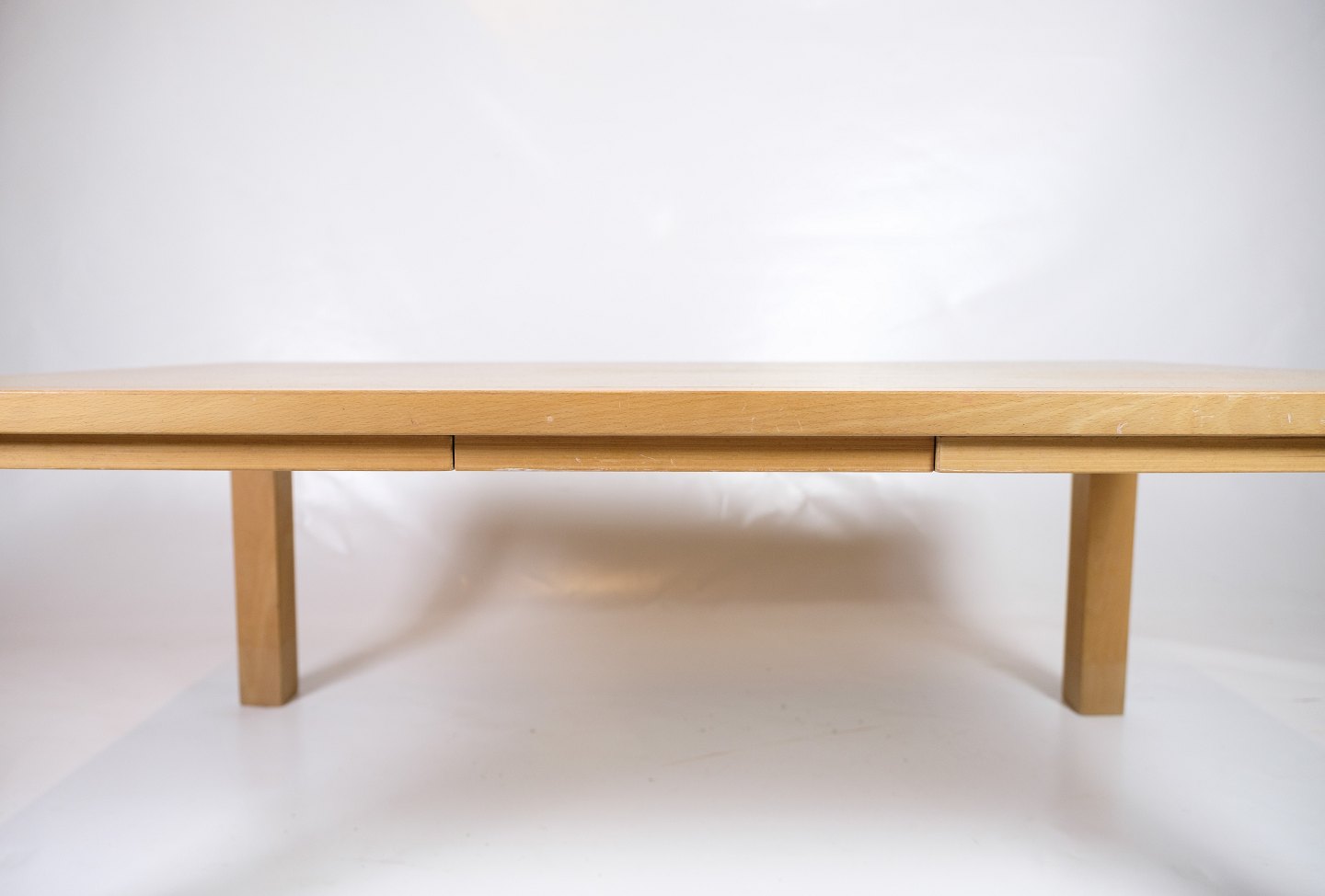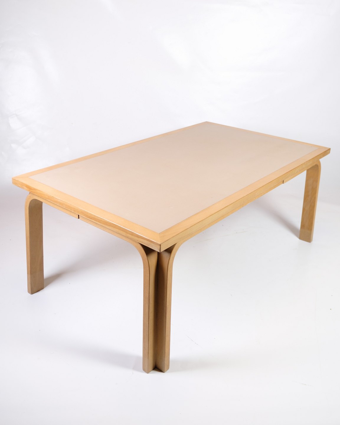 Sofabord udført i bøgetræ med linoleumsoverflade, designet af Magnus Olesen. Bordet kombinerer en solid ramme i lyst bøgetræ med en praktisk linoleumsoverflade, der gør det modstandsdygtigt over for daglig brug. De buede hjørner og ben tilføjer et blødt og harmonisk udtryk, som er typisk for Magnus Olesens design.