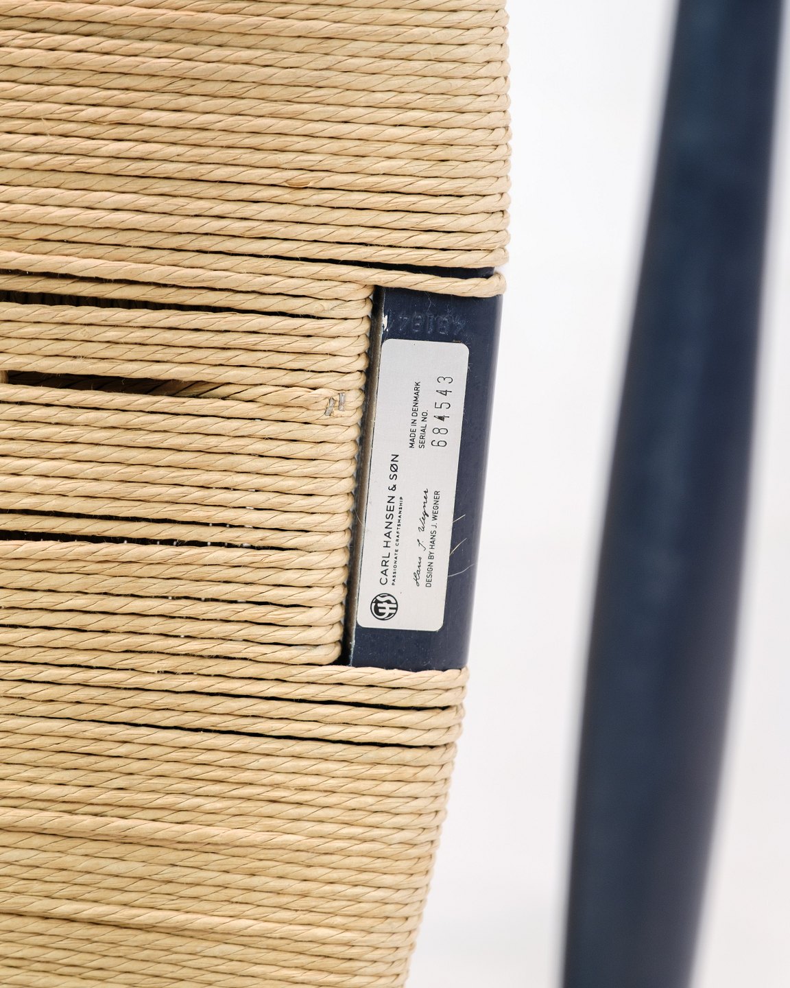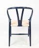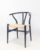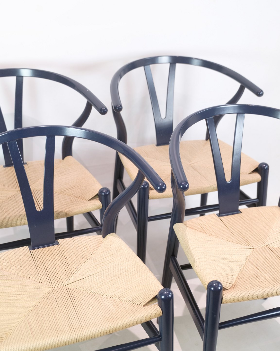 Sæt af 4 Y-stole, model CH24, Designet af Hans J. Wegner og produceret af Carl Hansen & Søn. Stolene er malet i en navy blå farve og sædet er udført i det klassiske naturflet.