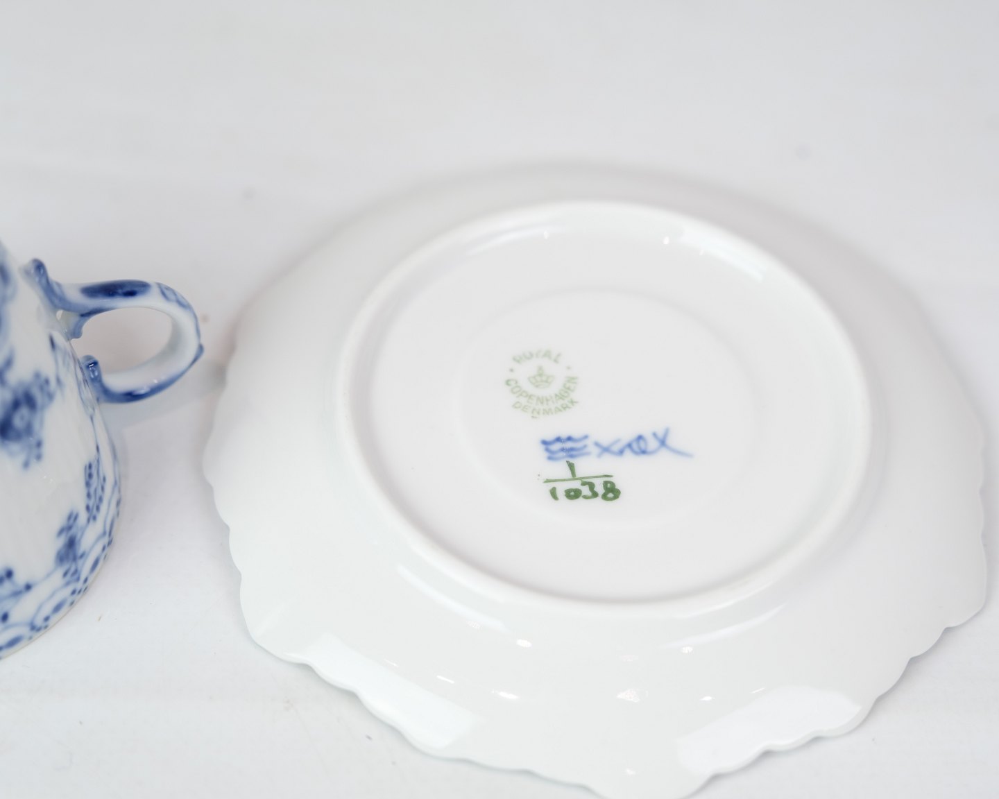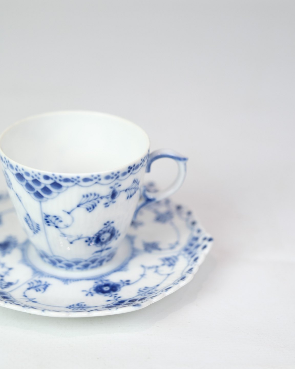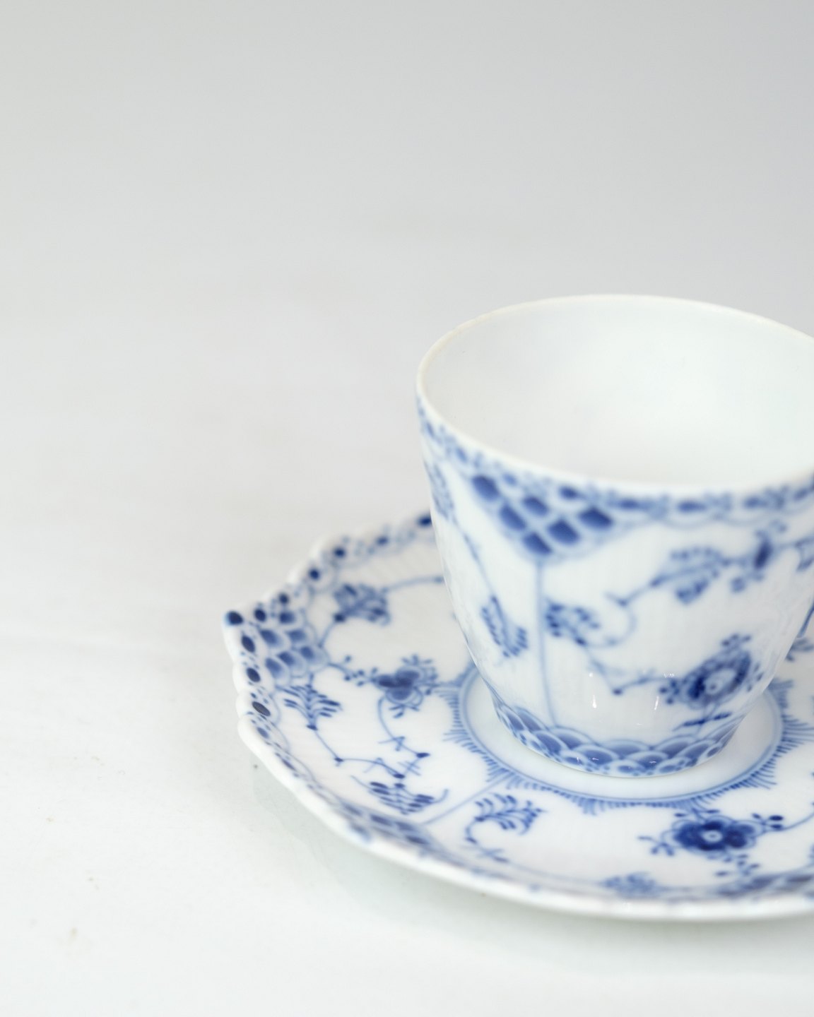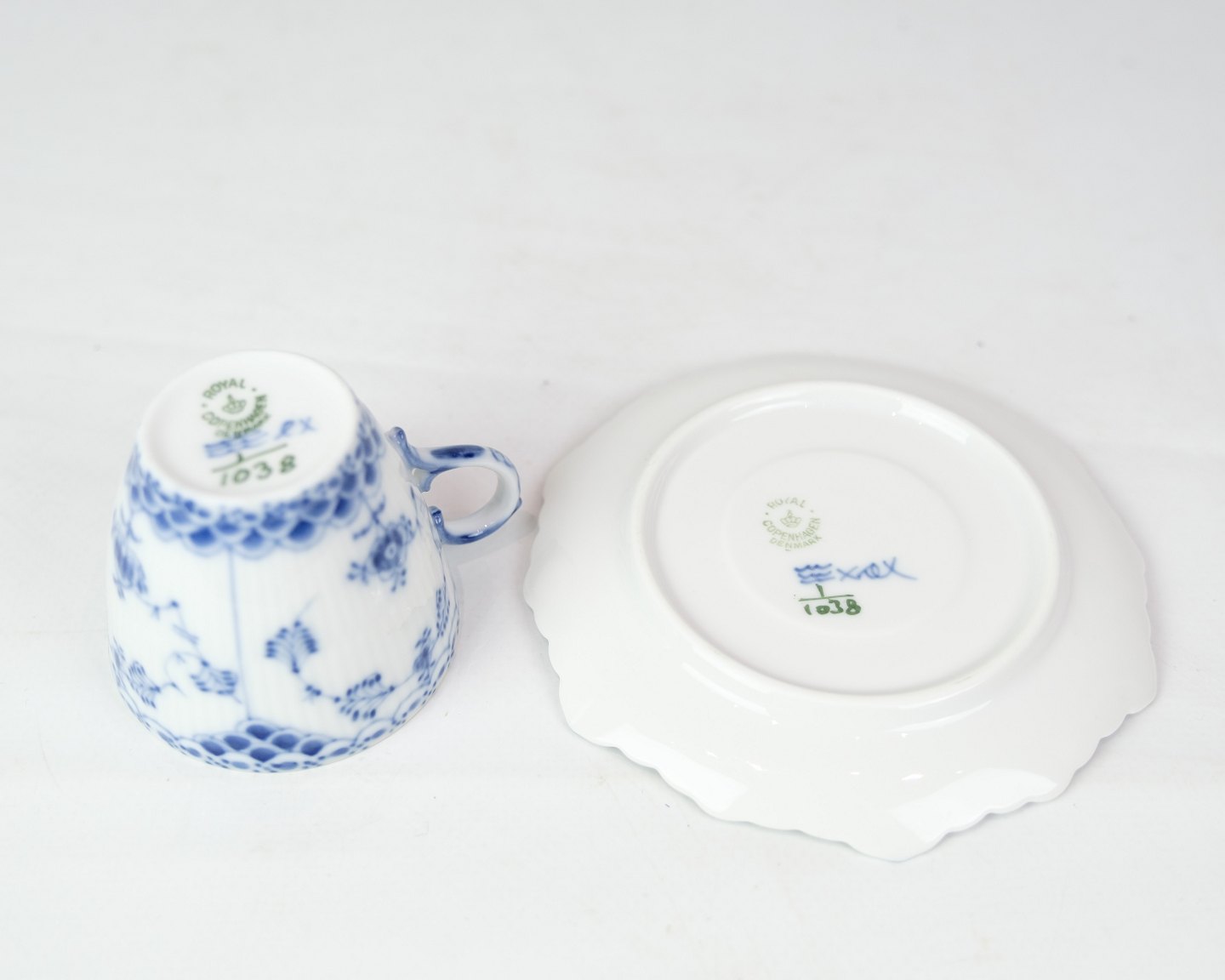 Kop med tilhørende underkop idealt til en espresso eller, som lille te / kaffe kop med mønstret musselmalet eller helblonde. Sættet har nr. 1/1038 og står i flot stand uden skår. For info omkring 1. eller 2. sortering kontakt os.