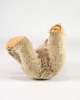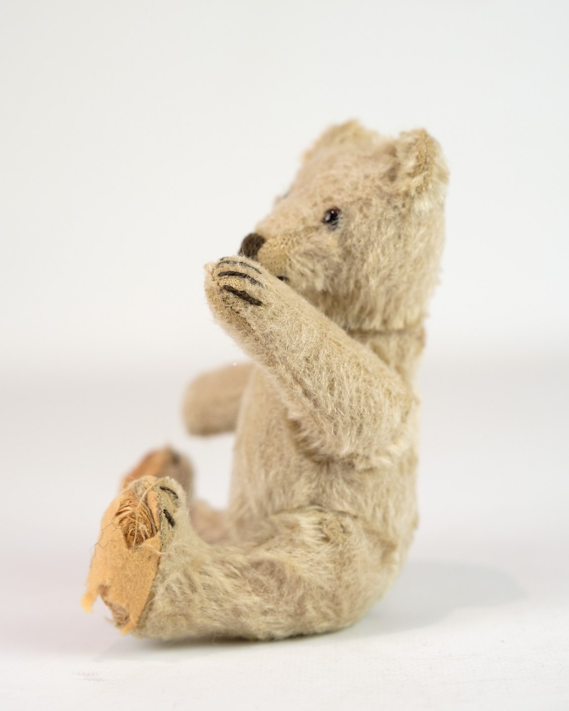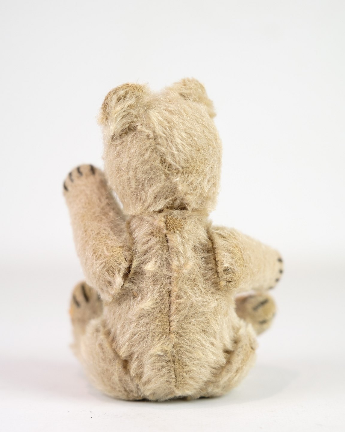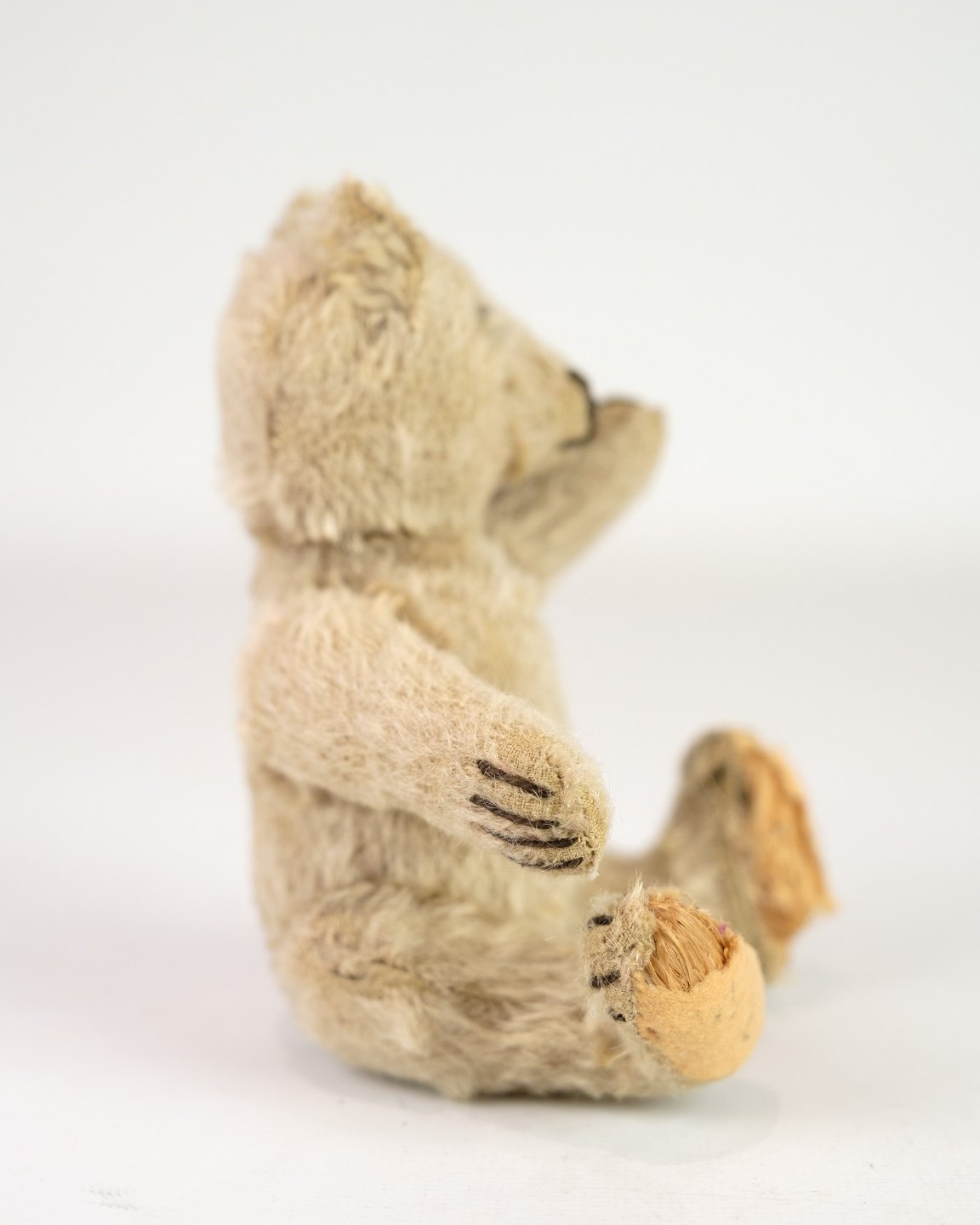 Gammel bamse i beige mohair. Bamsen har sorte glasøjne, broderet næse og poter med syede detaljer. Fødderne viser tydelige tegn på brug og patina. En fin lille samlerbamse med autentisk udtryk.