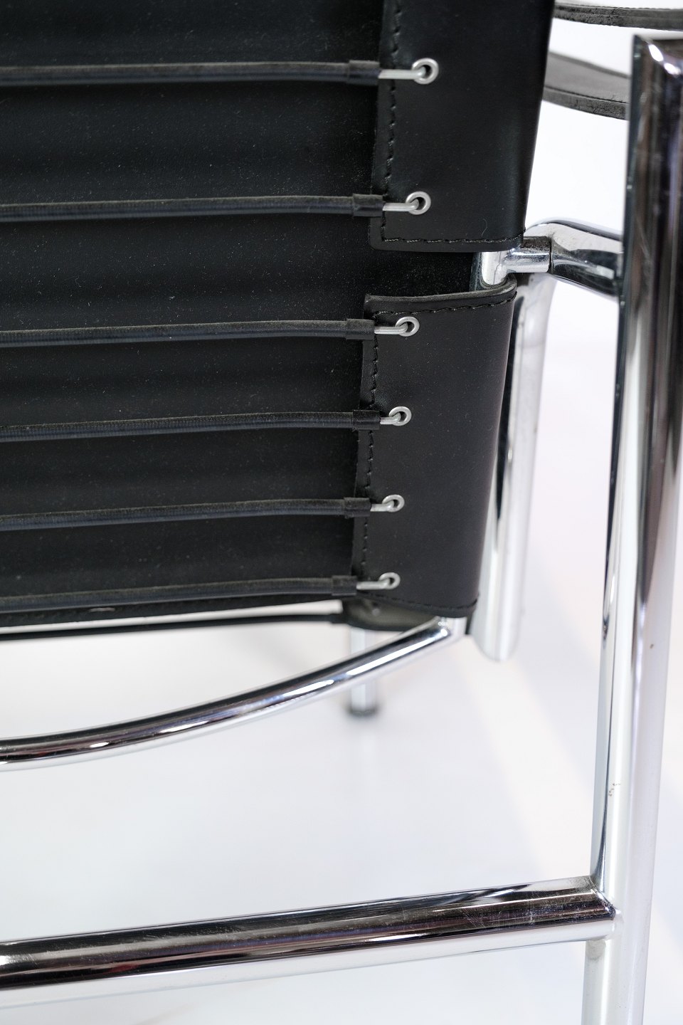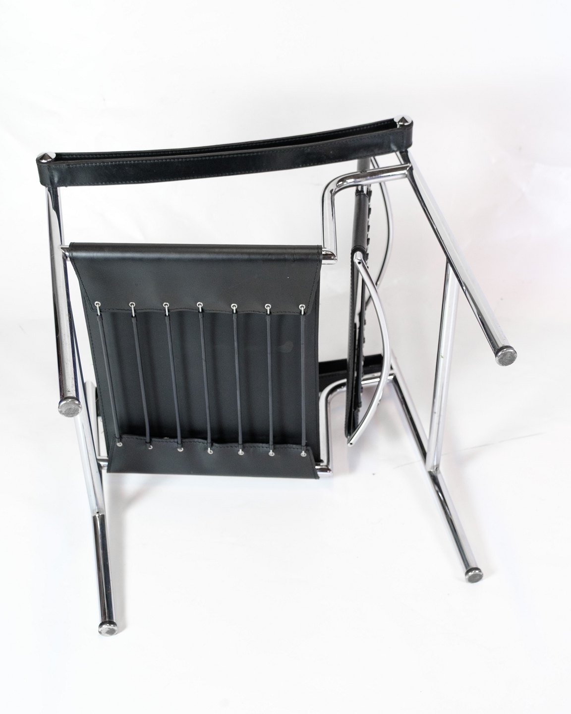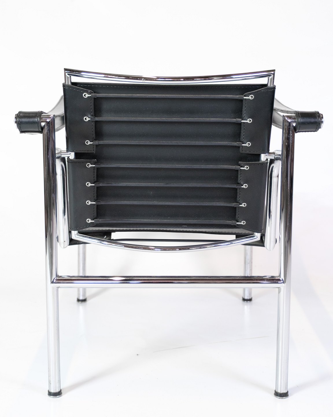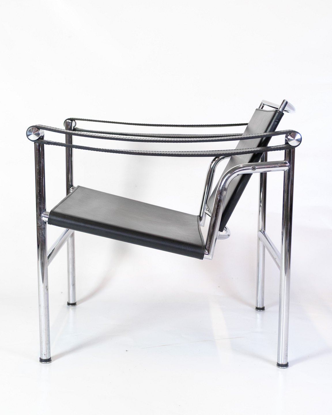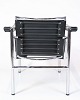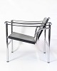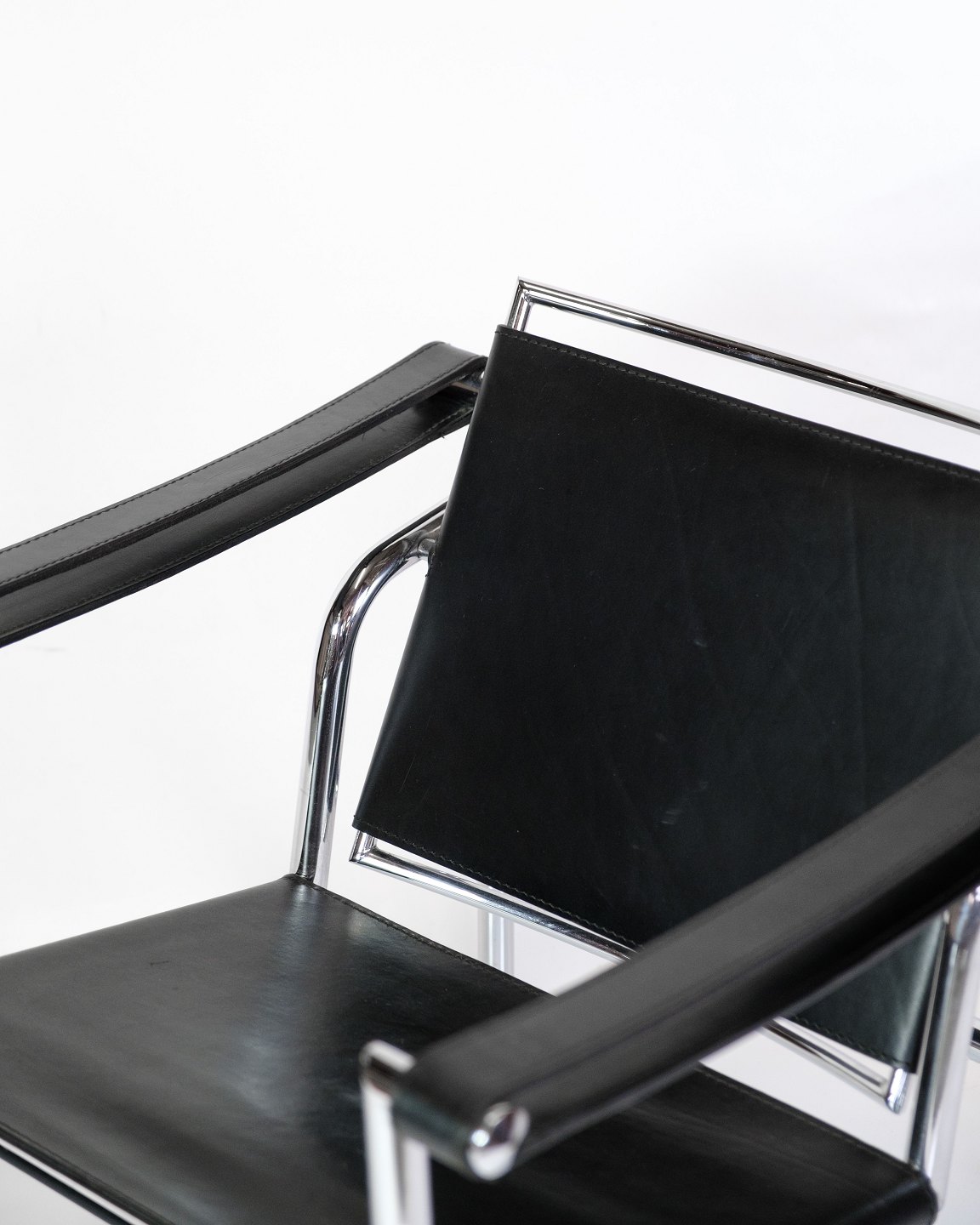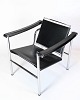 Et par klassiske lænestole i sort kernelæder med stel af krom. Model LC1 er designet i 1928 af Le Corbusier. Stolens ryglæn er justerbart. De står i meget flot stand i både krom og læder.