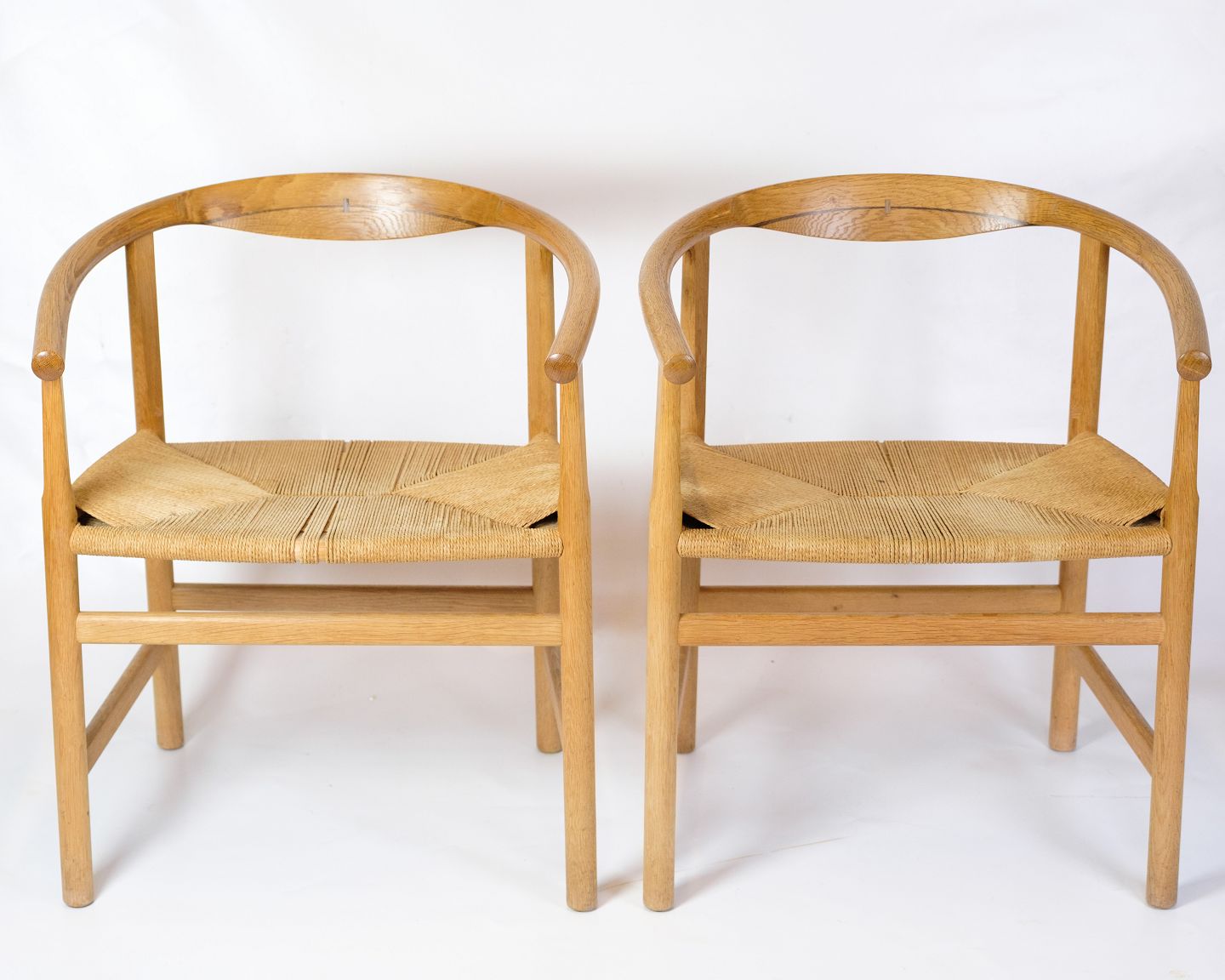 Sæt af armstole, model 201 fremstillet i egetræ med Intarsia af wenge træ med ryglænet med sæde af papirgarn designet i 1969 af Hans J. Wegner hos PP Møbler. Stolene står i meget flot brugt stand.