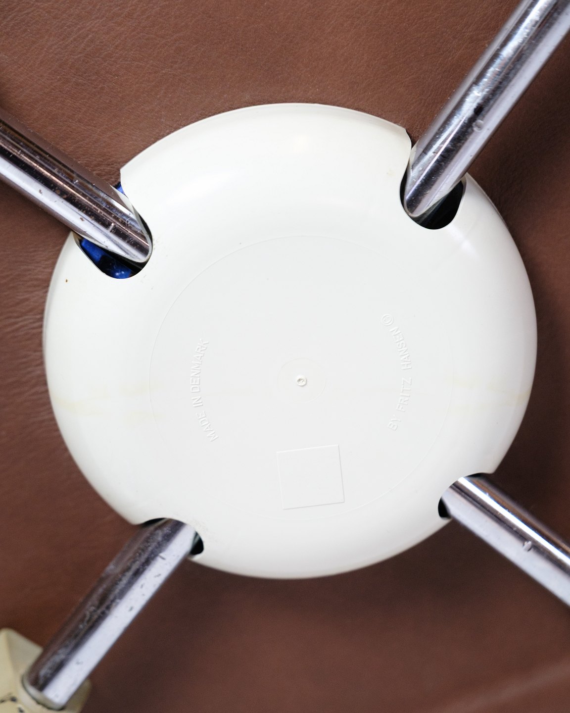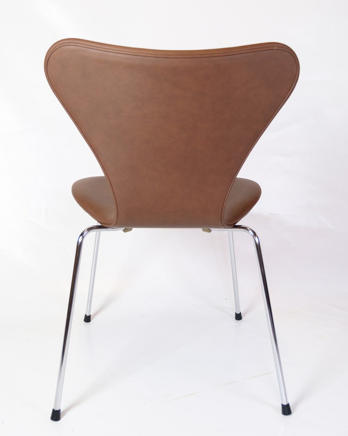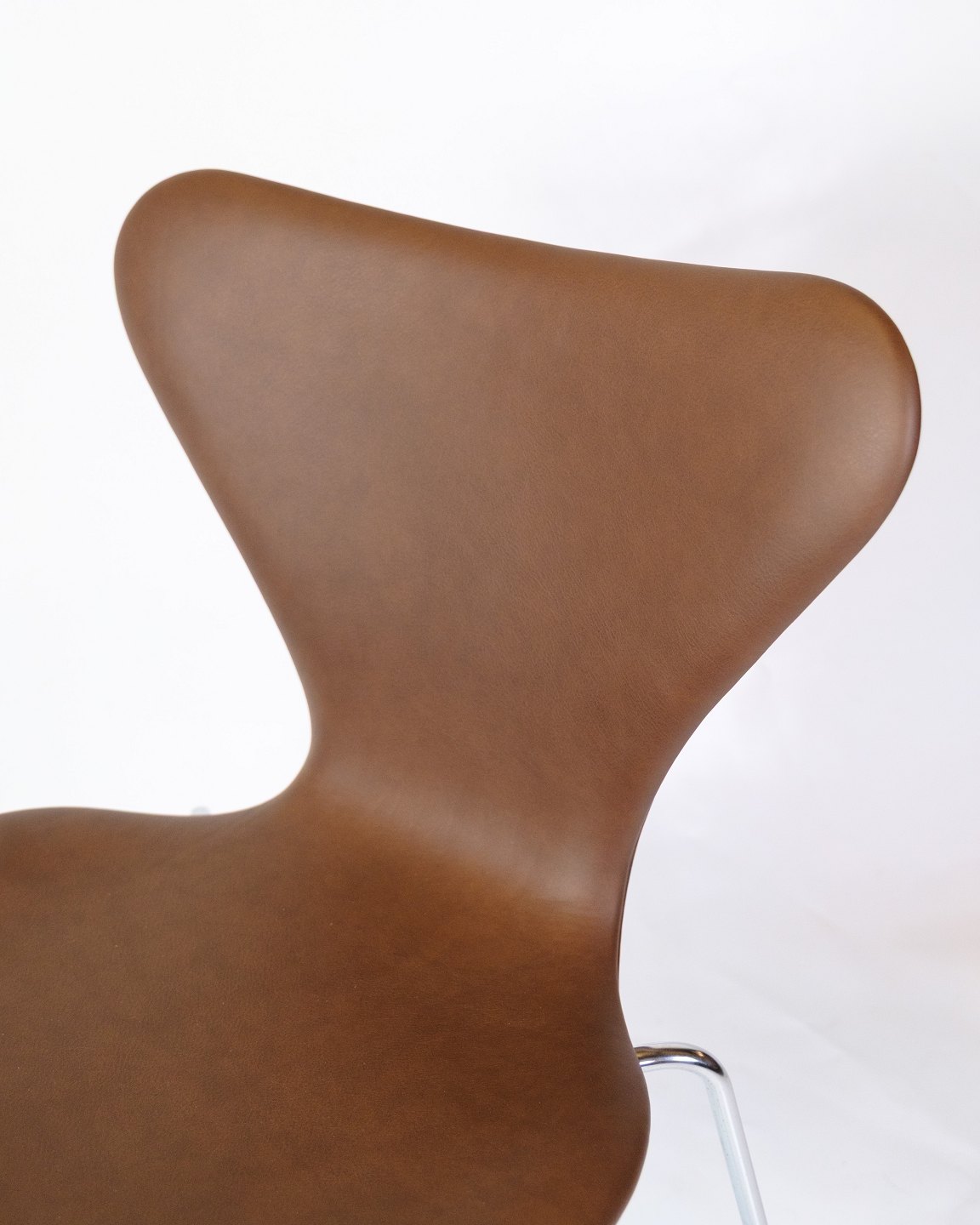 Ny polstrede Syver stol, som vi kan polstre i ønsket antal. Læder af virkelig god kvalitet, med flot struktur og god komfort. Stolen er designet af Arne Jacobsen og fremstillet af Fritz Hansen i 1967.