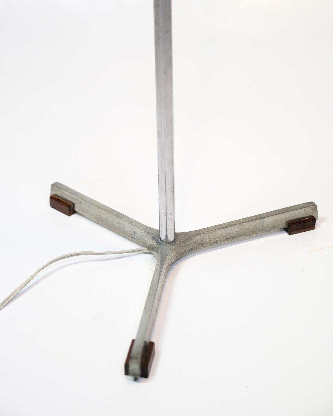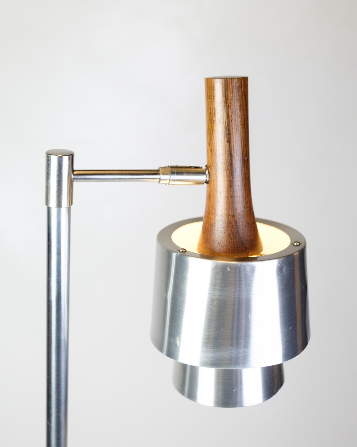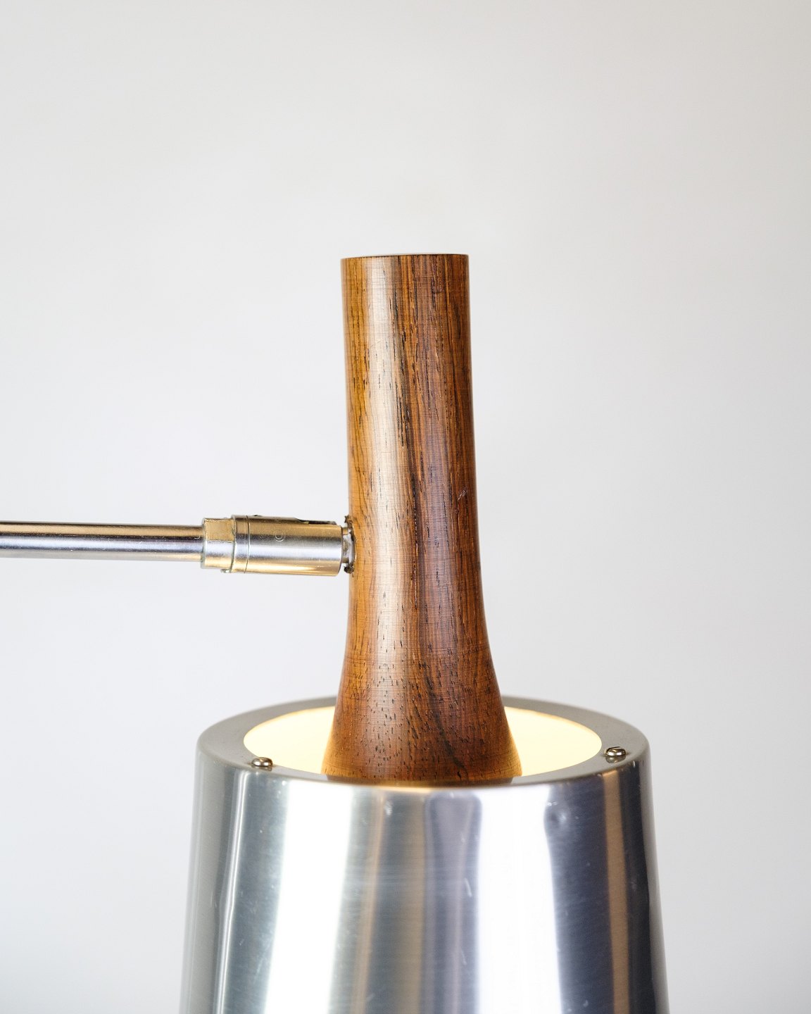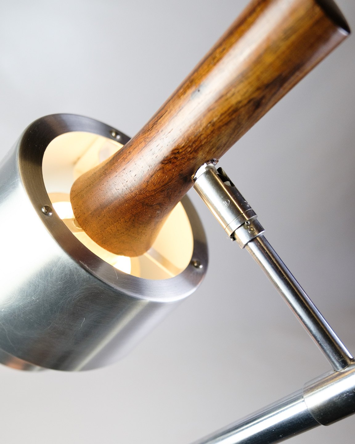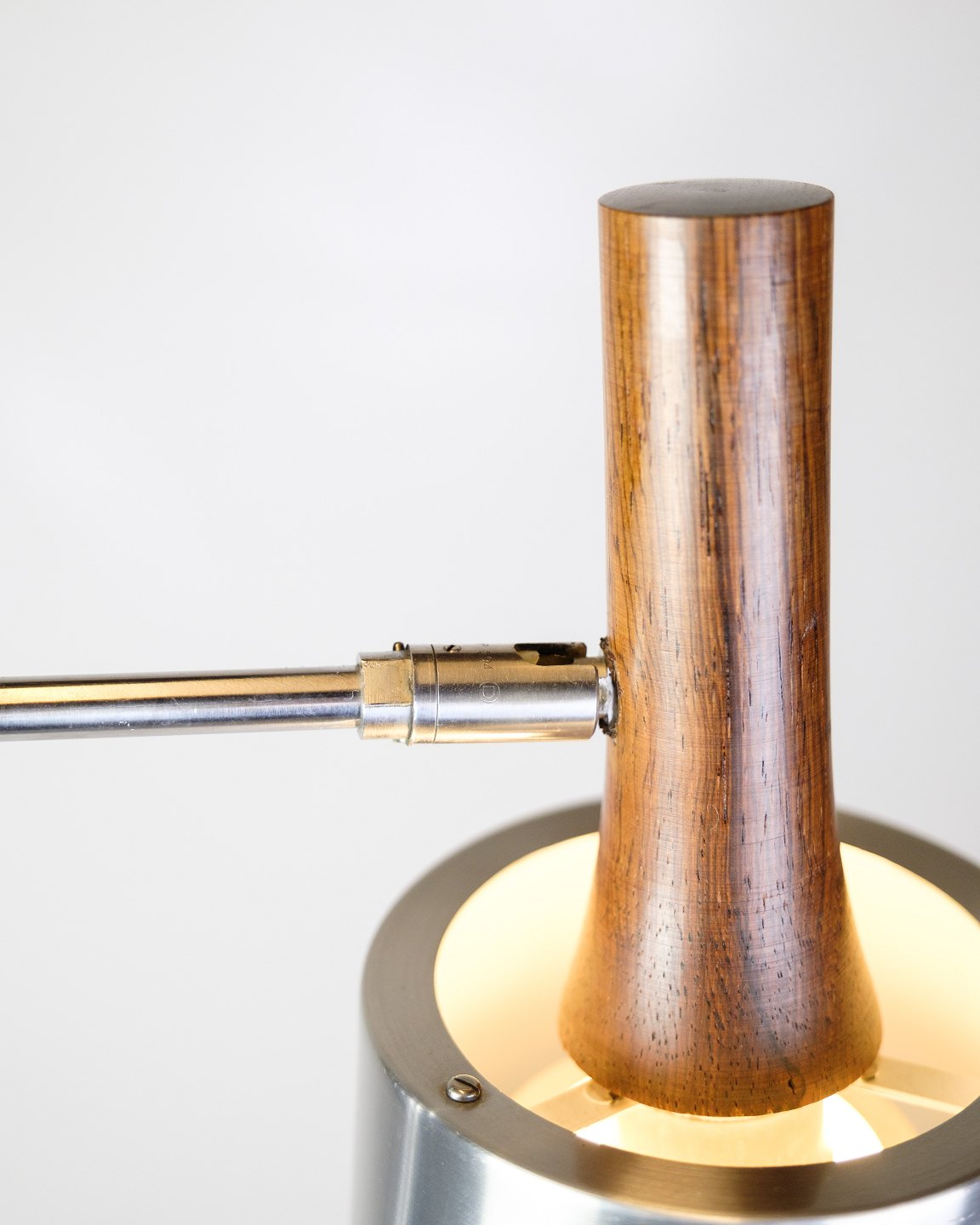 SolgtGulvlampe, model 294, designet af Jo Hammerborg for Fog & Mørup i 1960’erne. Lampen er udført i børstet stål med detaljer i palisander og har en cylindrisk skærm monteret på et slankt, trebenet stel. Skærmen kan vippes for fleksibel lysretning, hvilket gør lampen velegnet som læselampe eller stemningsbelysning. Jo Hammerborg (1920–1982) var chefdesigner hos Fog & Mørup fra 1957 og bragte en stærk sans for formgivning og materialer fra sin baggrund som sølvsmed hos Georg Jensen. Under hans ledelse blev Fog & Mørup internationalt anerkendt for sit moderne belysningsdesign.