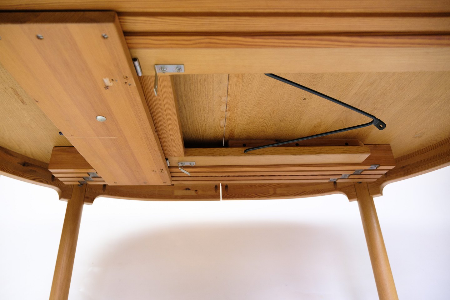 Ovalt spisebord med udtræk fra "Øresundsserien", model 140, designet af Børge Mogensen og produceret af Karl Andersson & Söner i 1950’erne. Bordet er udført i egetræ med ben af massiv egetræ monteret med messingbeslag. Det leveres med fire udtræksplader samt støtteben for ekstra stabilitet ved fuld udtrækning.