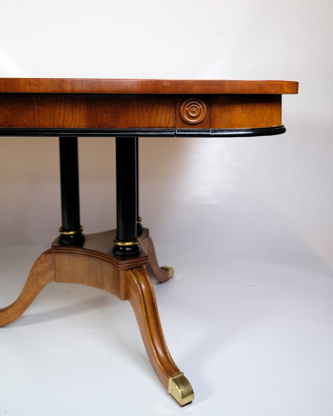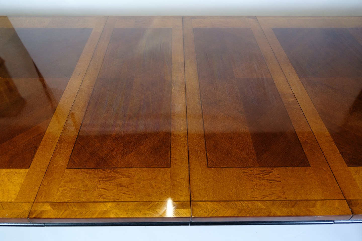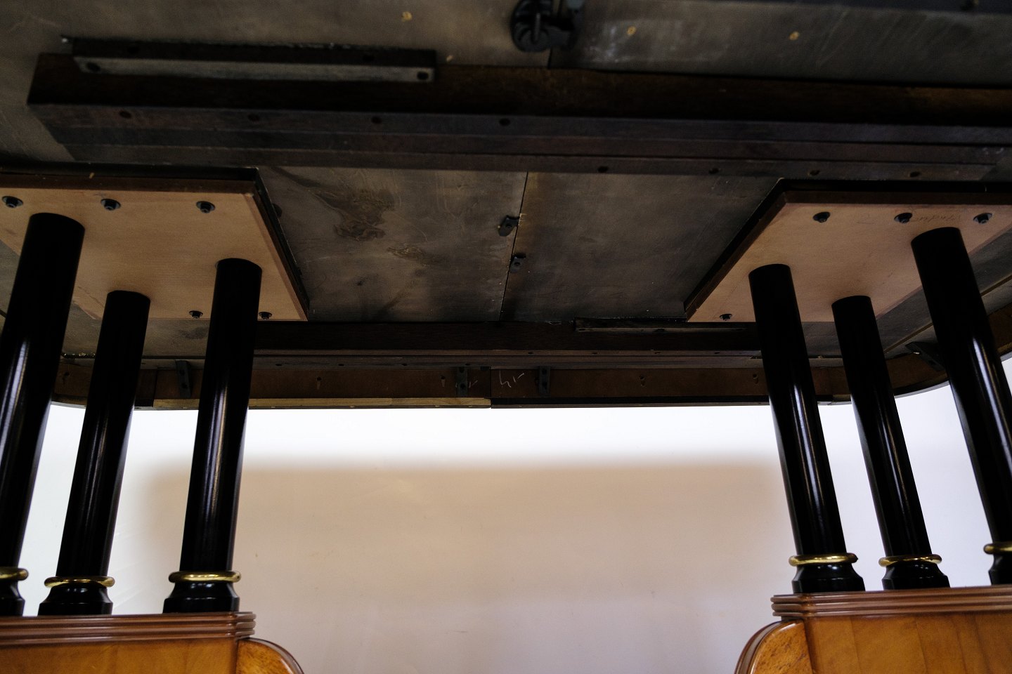 Spisebord i finéreret mahogni med dekorative intarsiafelter og kantliste i birk. Bordpladen har en symmetrisk opsat intarsiadekoration i midten og afrundede hjørner, som understreger det klassiske udtryk. Stellet består af to elegante søjleben med buede fødder afsluttet med messingkapper, hvilket giver bordet stabilitet og et raffineret udtryk.