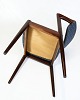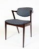Sæt af seks spisebordsstole, model 42, designet af Kai Kristiansen og fremstillet af Schou Andersen i 1960’erne. Stolene er lavet i mørkt træ og betrukket med blomstret stof. Model 42 er kendt for sit elegante formsprog og den vipbare ryg, som giver en særlig høj siddekomfort – et af de mest populære designs fra dansk møbelkunst i midten af det 20. århundrede.
