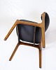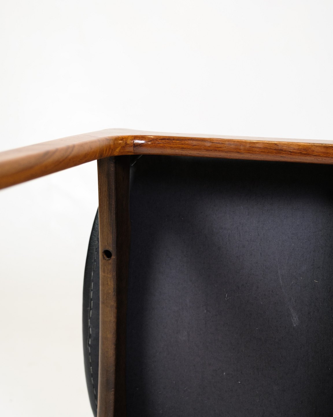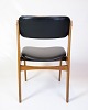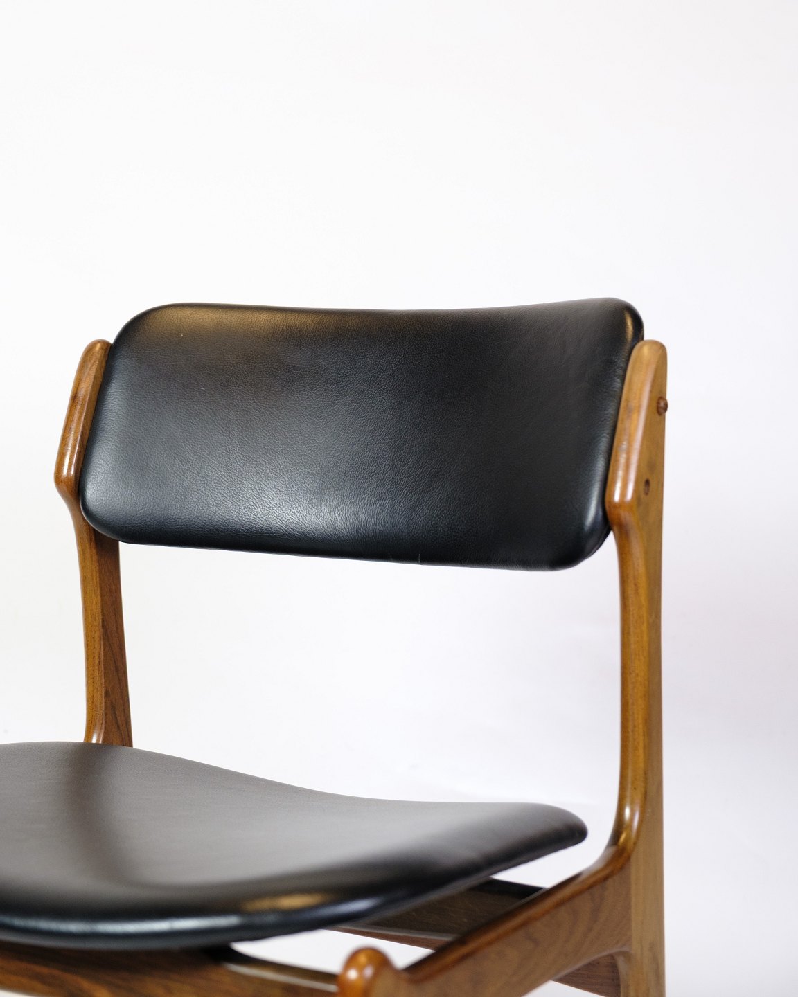 Sæt af fire spisestuestole, model OD49, designet af Erik Buch og fremstillet af O.D. Møbler i 1950’erne. Stolene er udført i palisander med sæder betrukket i sort læder. Model OD49 er kendt for sit svævende sæde og bløde organiske linjer, som giver høj komfort og et let, elegant udtryk.