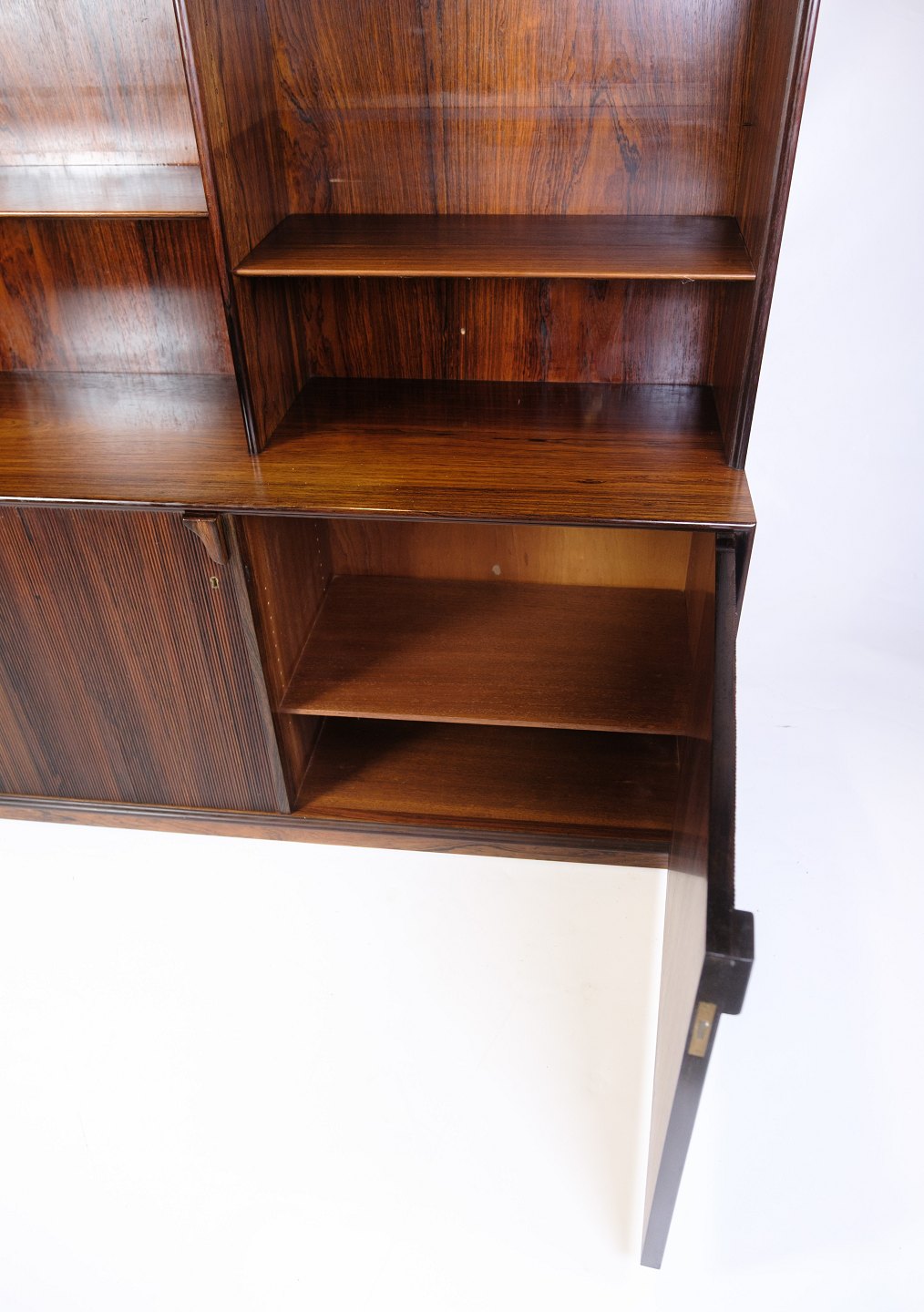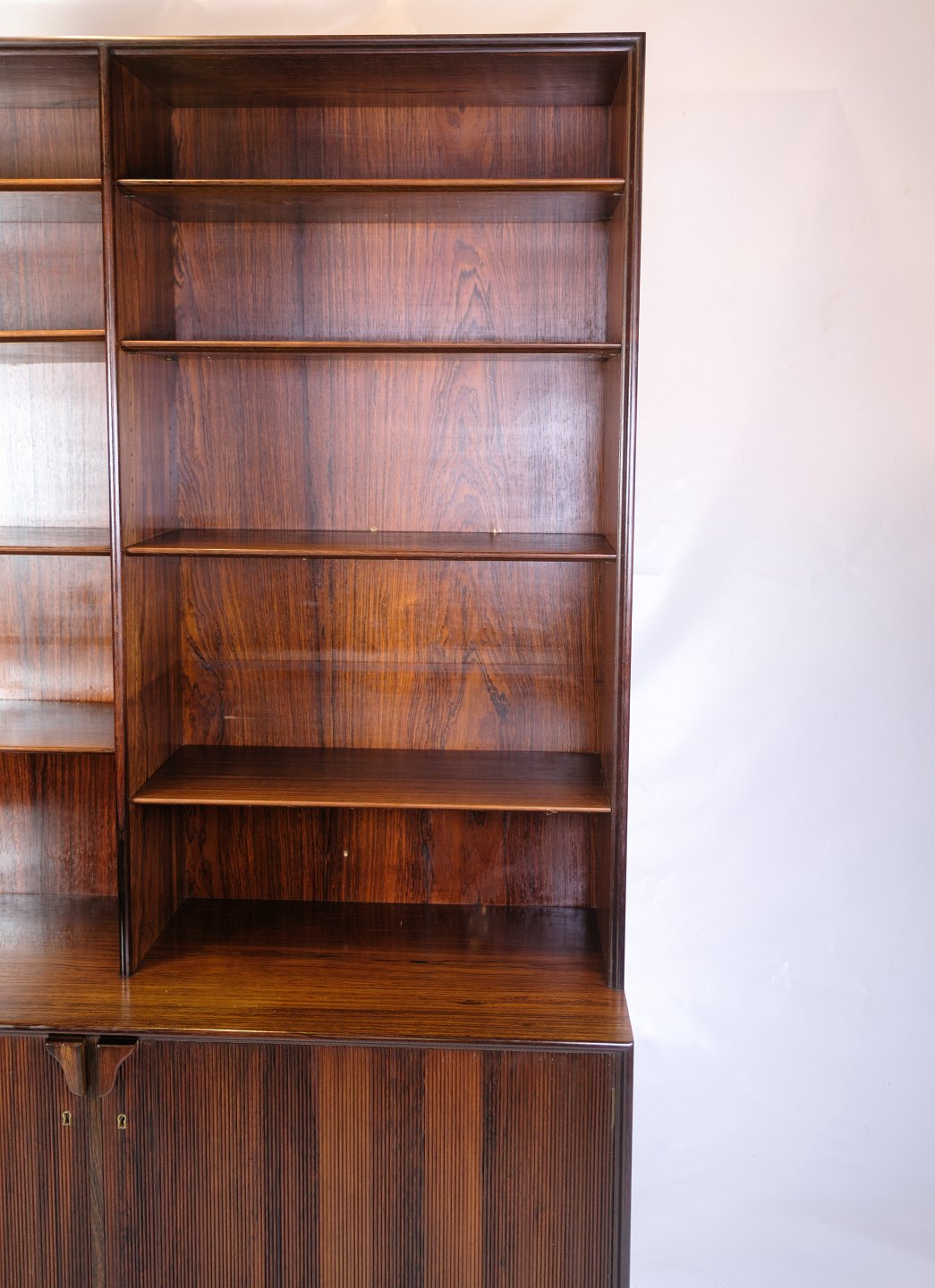 Kontakt os vedrørende prisHøj reol i palisander, designet af Frode Holm og solgt gennem Illums Bolighus i 1960’erne. Udført med justerbare hylder og underskabe med nøgler og smukt udformede greb. Den mørke, levende årestruktur og den slanke ramme giver møblet et let og raffineret udtryk trods sin størrelse. En klassisk kombination af funktion og æstetik fra dansk møbelkunst.