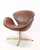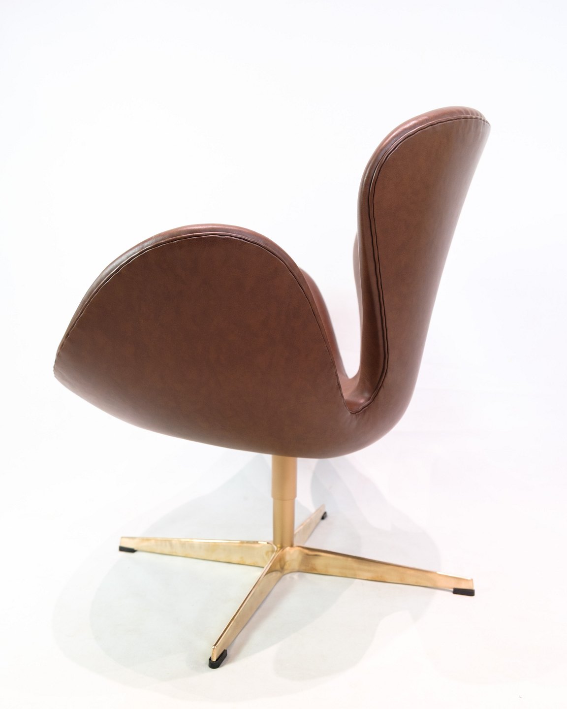 Svanen, model 3320 fremstillet af Fritz Hansen og designet af Arne Jacobsen. Den er polstret med brunt læder af høj kvalitet og har en orignal 60 års jubilæums guld søjle. Står i meget flot stand.