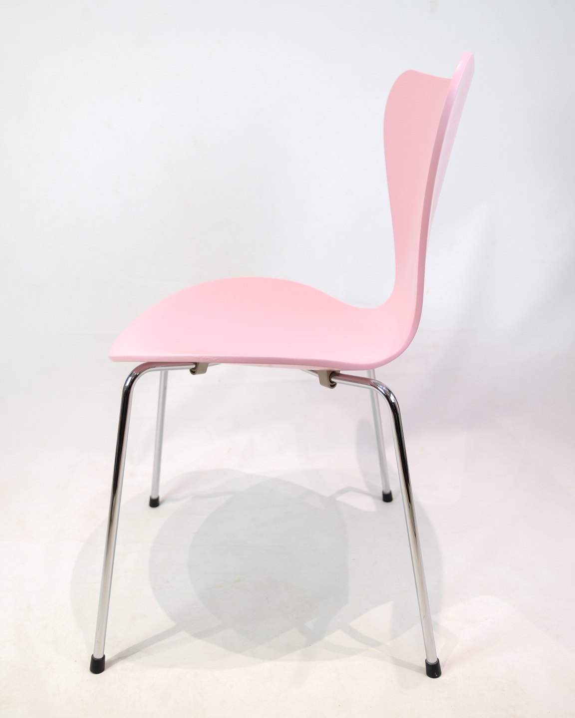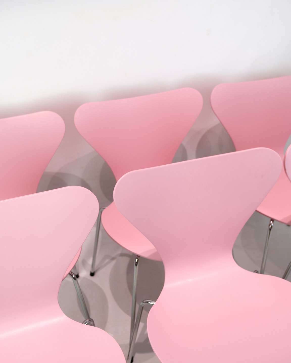 Sæt på 6 Syver-stole model 3107 i en lyserød lakering. Designet af Arne Jacobsen og fremstillet af Fritz Hansen.