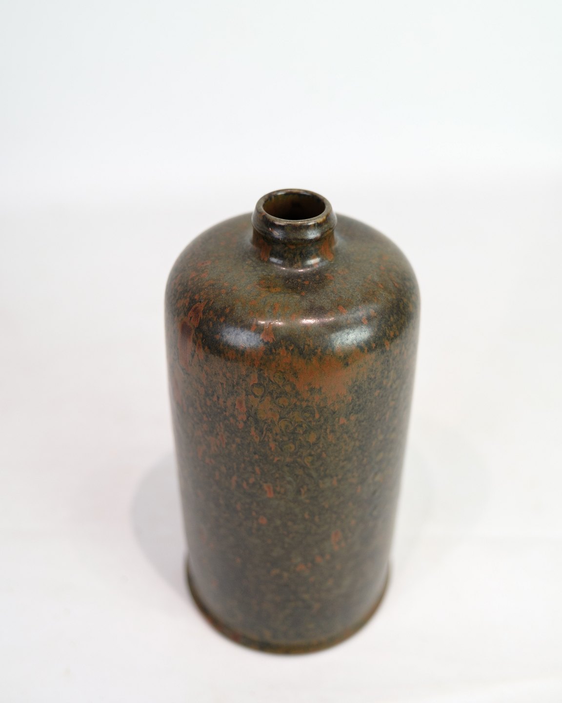 Keramisk vase fra 1940’erne designet af Nathalie Krebs for Saxbo. Udført i karakteristisk stentøj med nuanceret glasur i varme orange og brunlige toner.