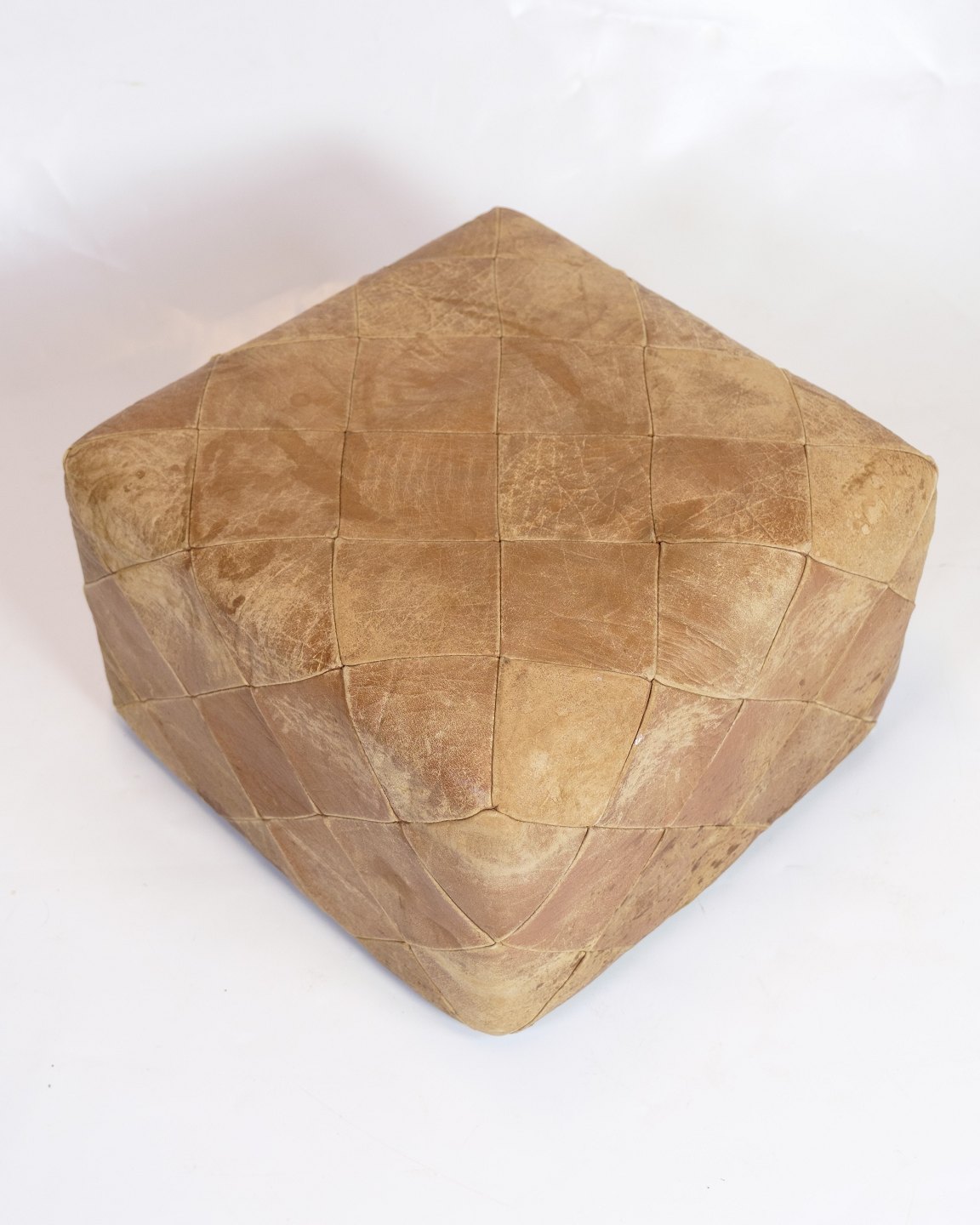 Vintage kvadratisk læderpuf fra 1970’erne i naturlæder med smuk patina. Håndsyet overflade i geometrisk mønster.
