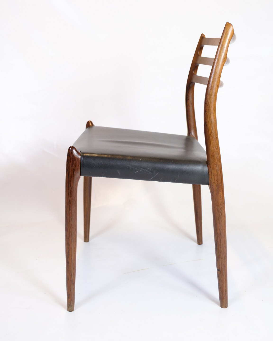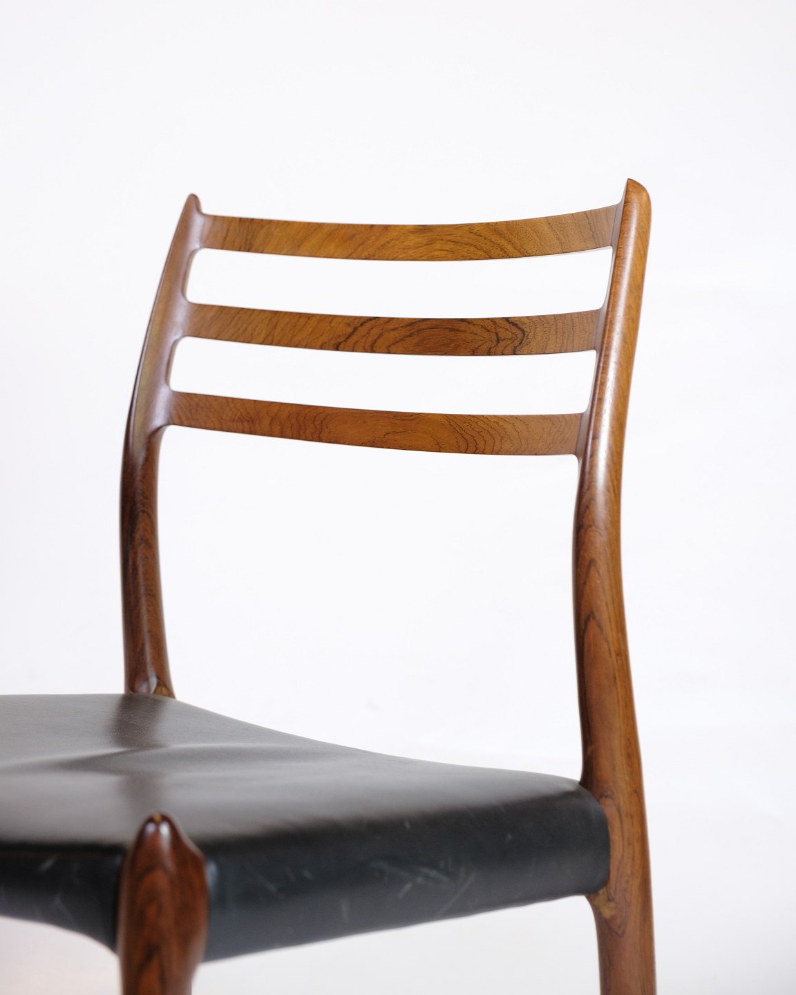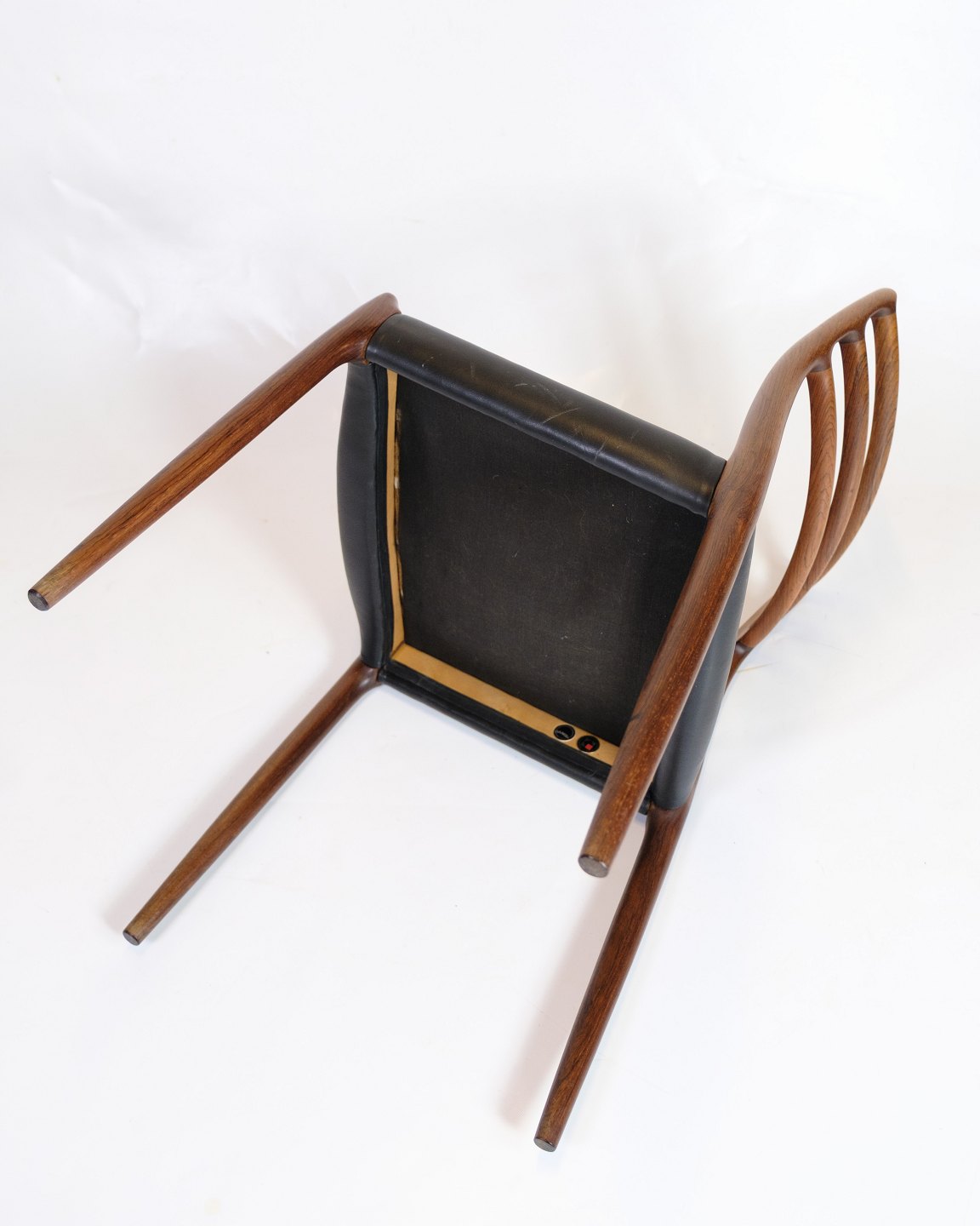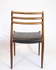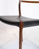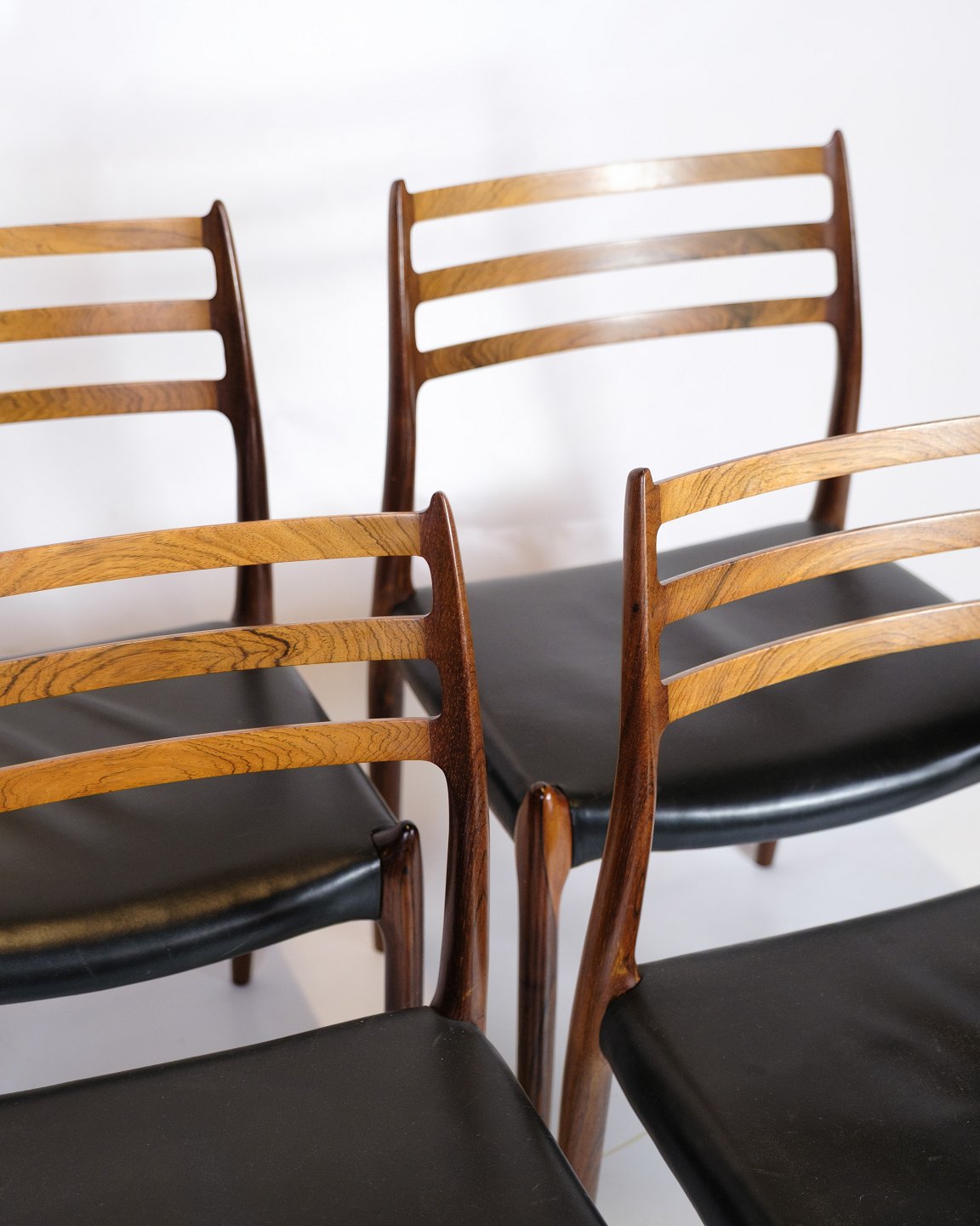 Sæt på fire spisebordsstole i massiv palisander, designet af Niels O. Møller og fremstillet af J.L. Møllers Møbelfabrik i 1950’erne. Stolene har sort læderpolstring og det karakteristiske ryglæn med tre vandrette stave, som er et gennemgående træk i Møllers formsprog.