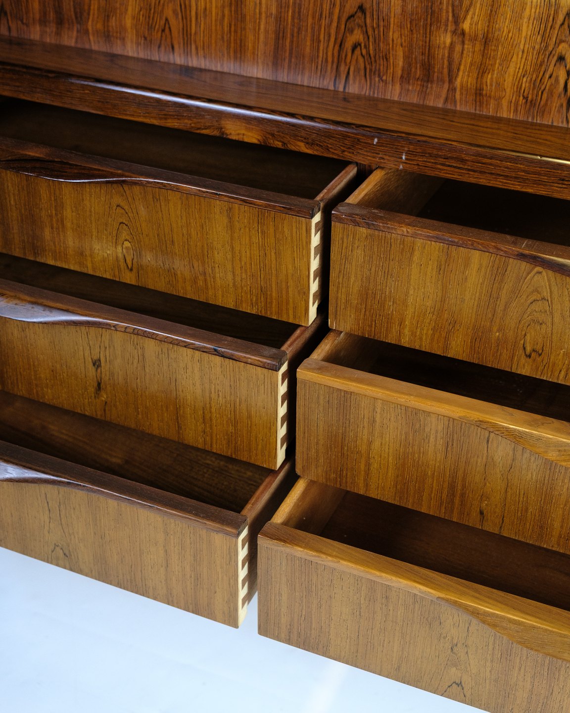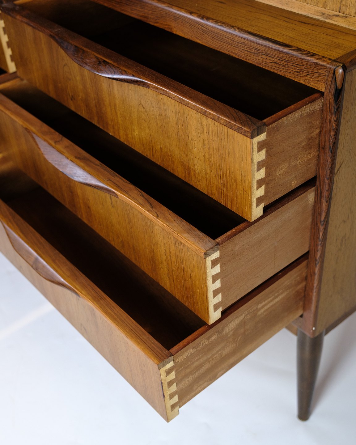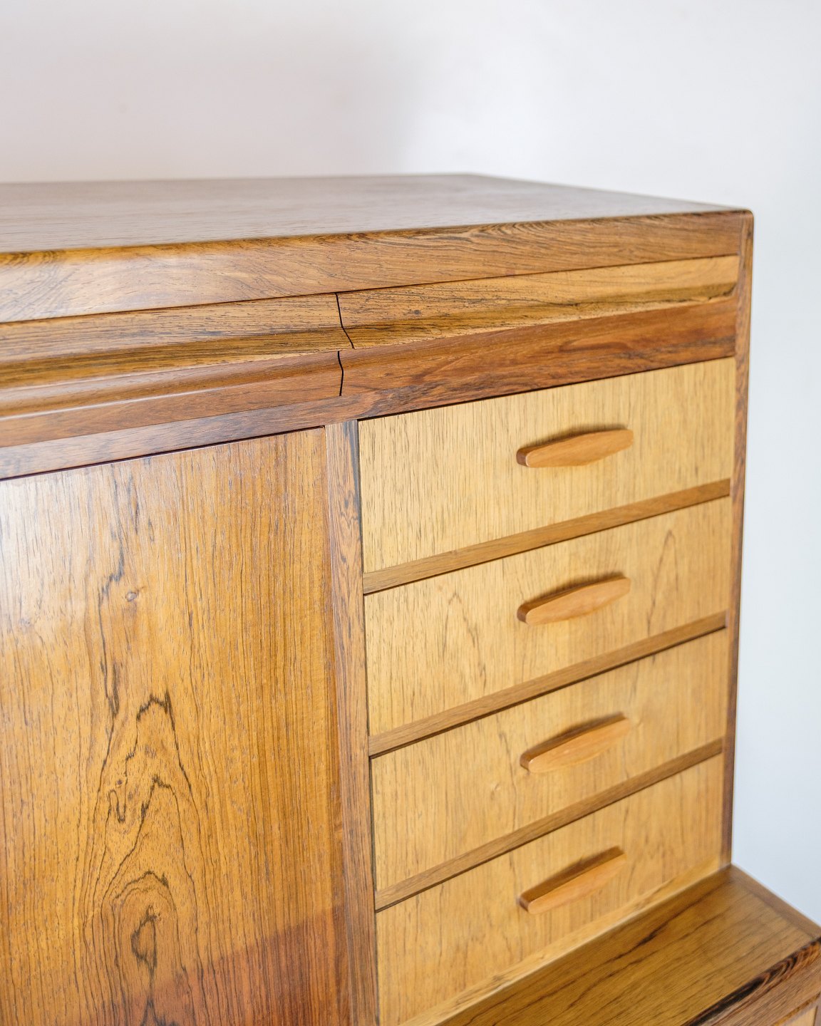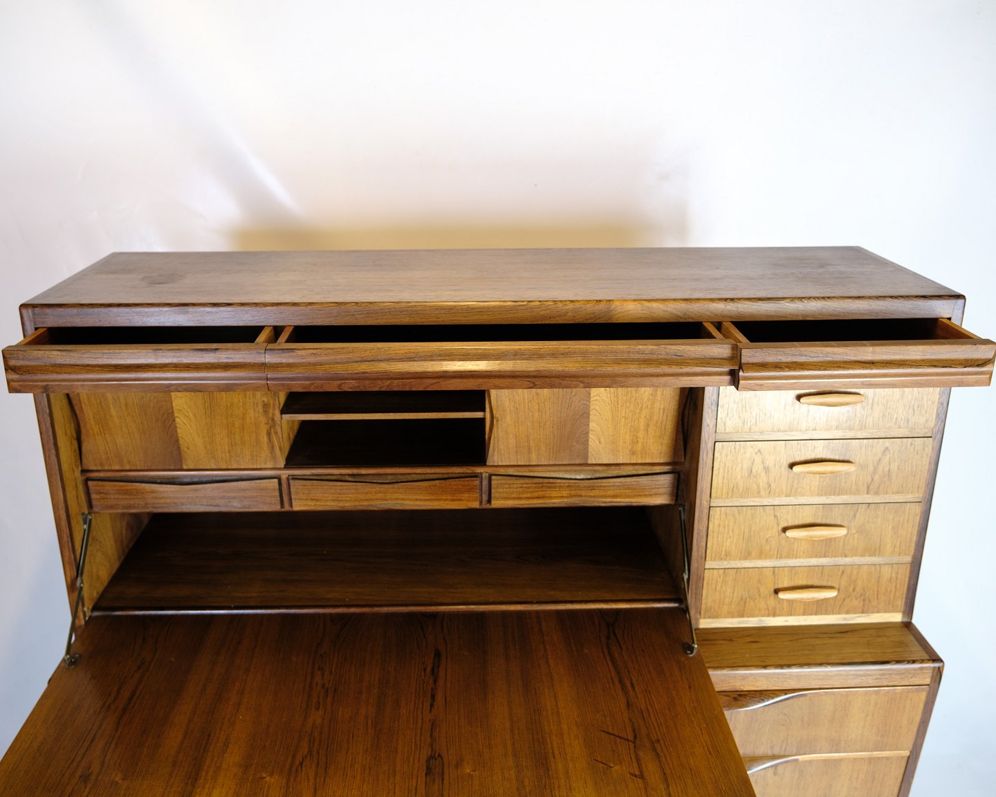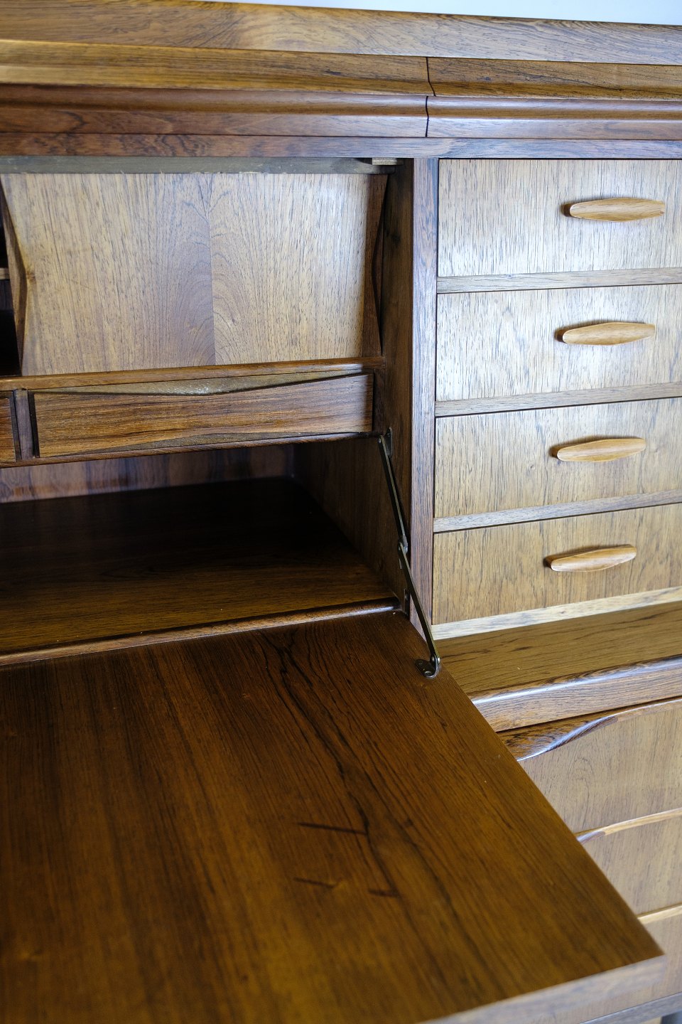 SolgtChatol designet af Erling Torvits og udført i palisander. Øverste del åbnes med en klaplåge og med indbygget skuffer, åbne rum, brevhylder og tre integrerede “hemmelige” skuffer i topsektionen. Nederst seks rummelige skuffer med formpressede greb.