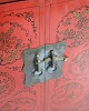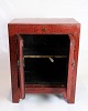 Antikt kinesisk skab med original rød bemaling, mønstre og messingbeslag. Patineret overflade fra ca. 1920’erne.