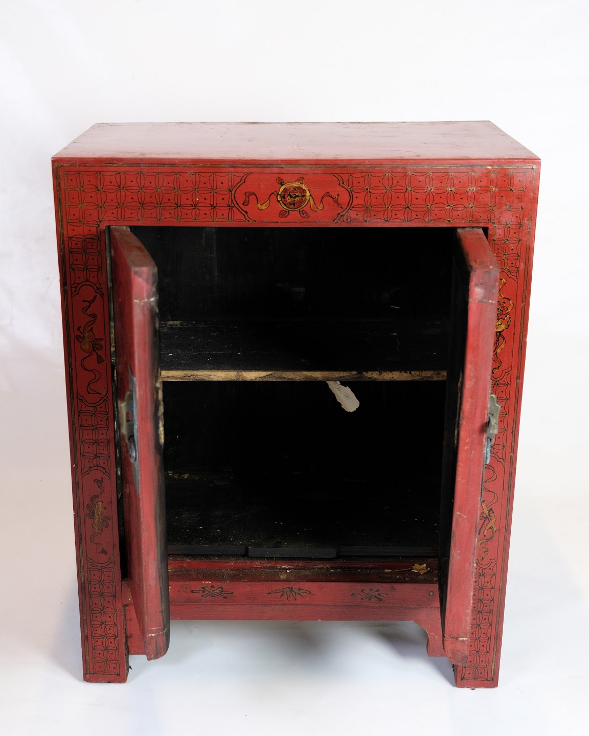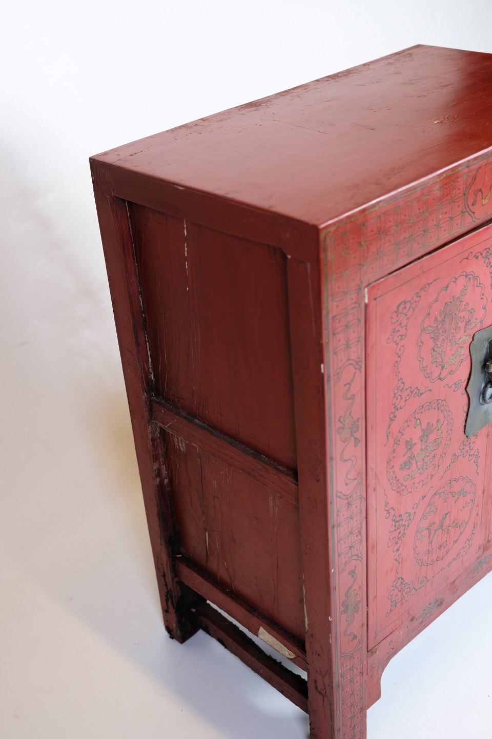 Antikt Kinesisk Skab - Original Malet I Rød Med Mønstre - Patina - Messing Beslag - 1920erne