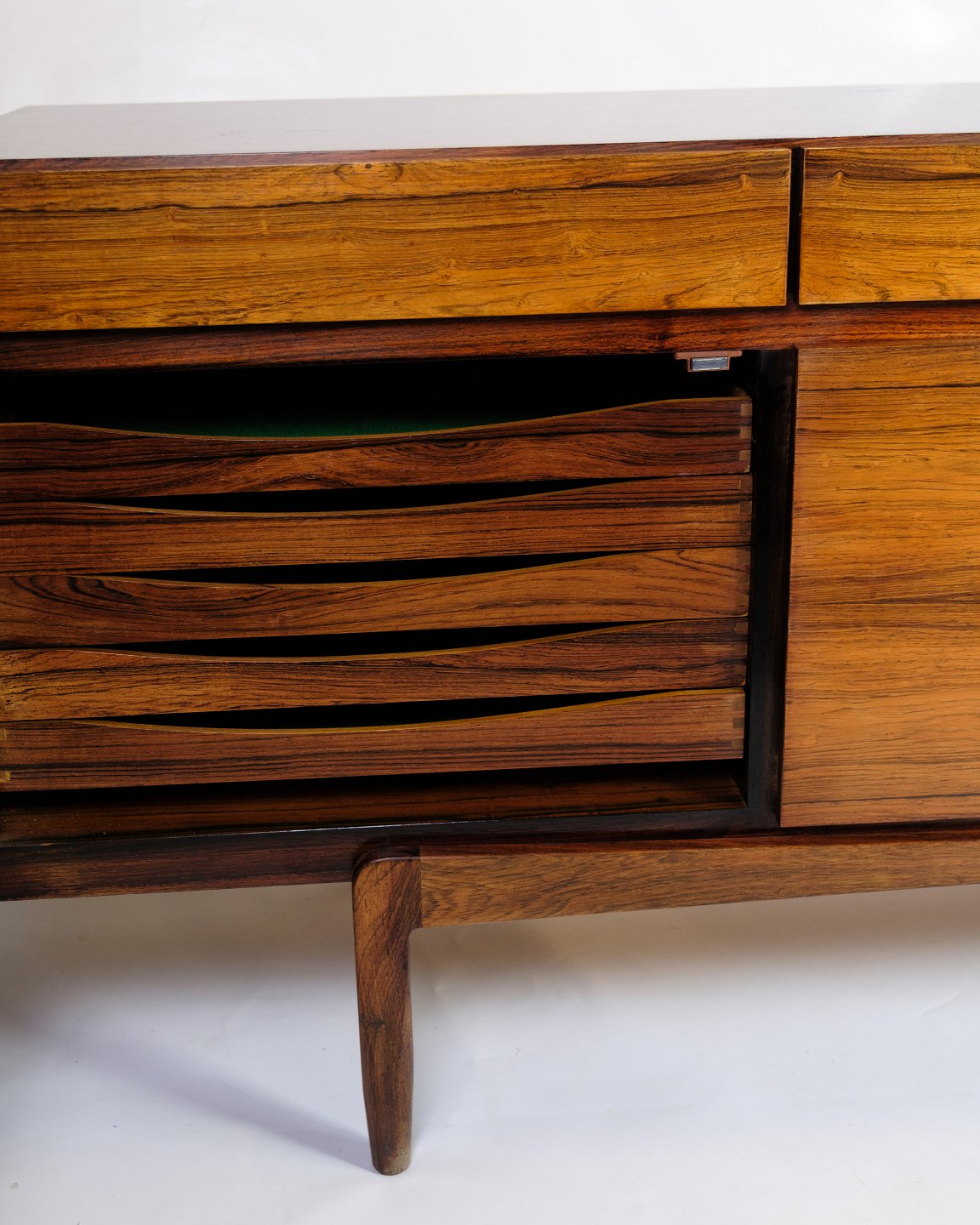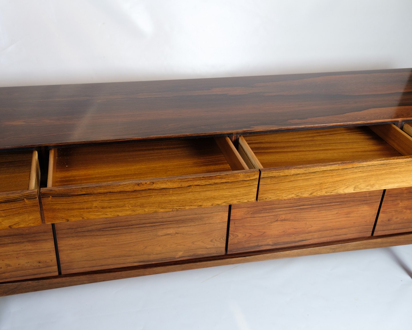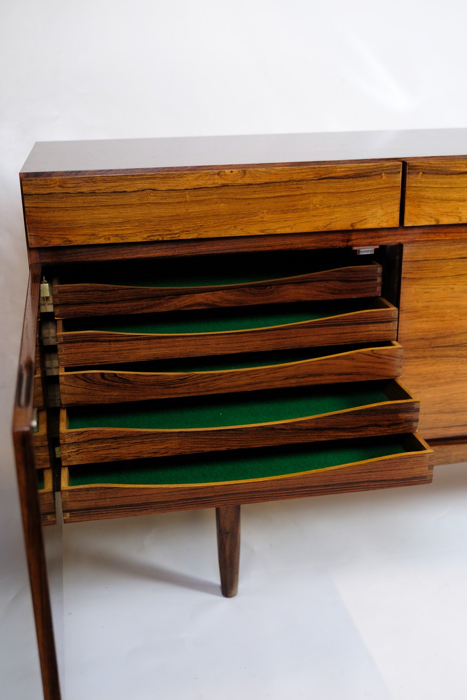 Kontakt os vedrørende prisSkænk designet af Ib Kofod-Larsen, model FA66, produceret af Faarup Møbelfabrik i 1960’erne. Skænken er udført i palisander med flot åretegning og front med fire skydelåger og skuffesektion bag den ene låge.