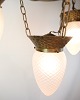 Jugendstil lysekrone fra 1920’erne i patineret, hamret messing med fire arme og dråbeformede glas. Elegant klassisk loftslampe.