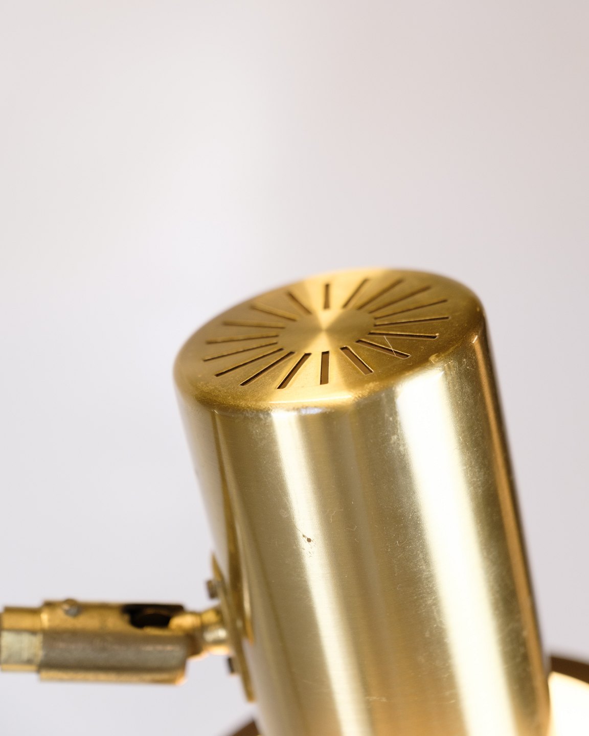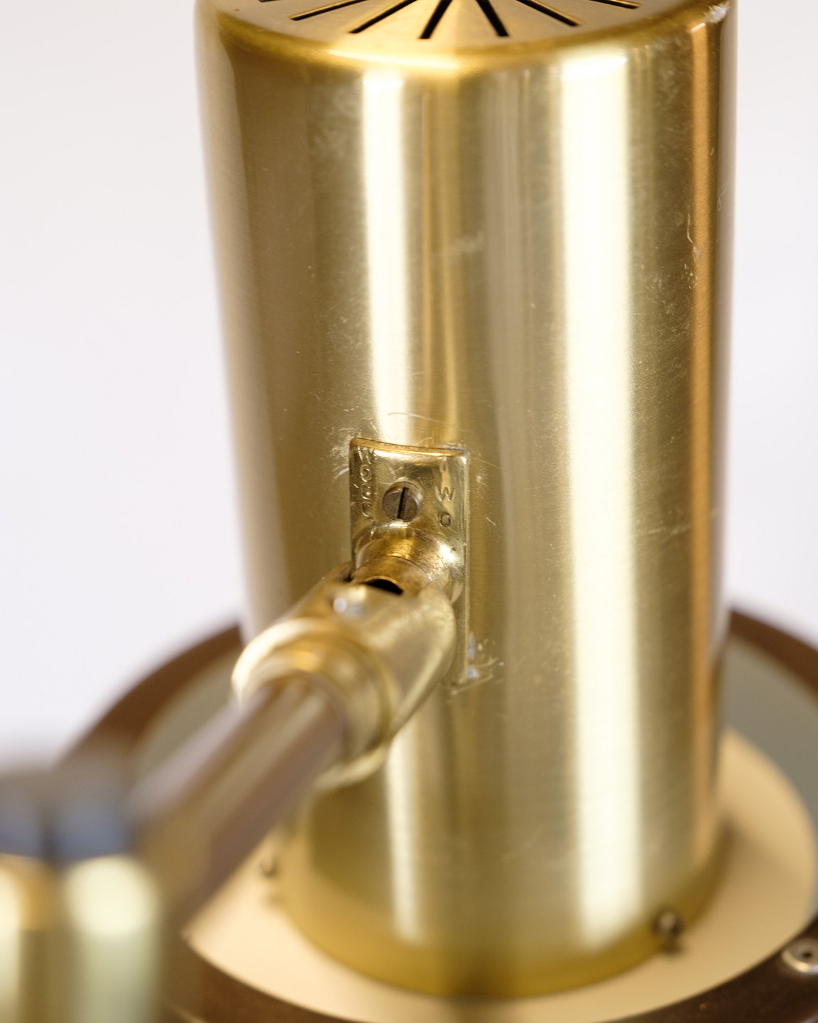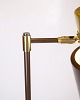 Lampen er udført i brunt lakeret metal kombineret med messingdetaljer, hvilket giver et sofistikeret og tidstypisk udtryk.