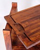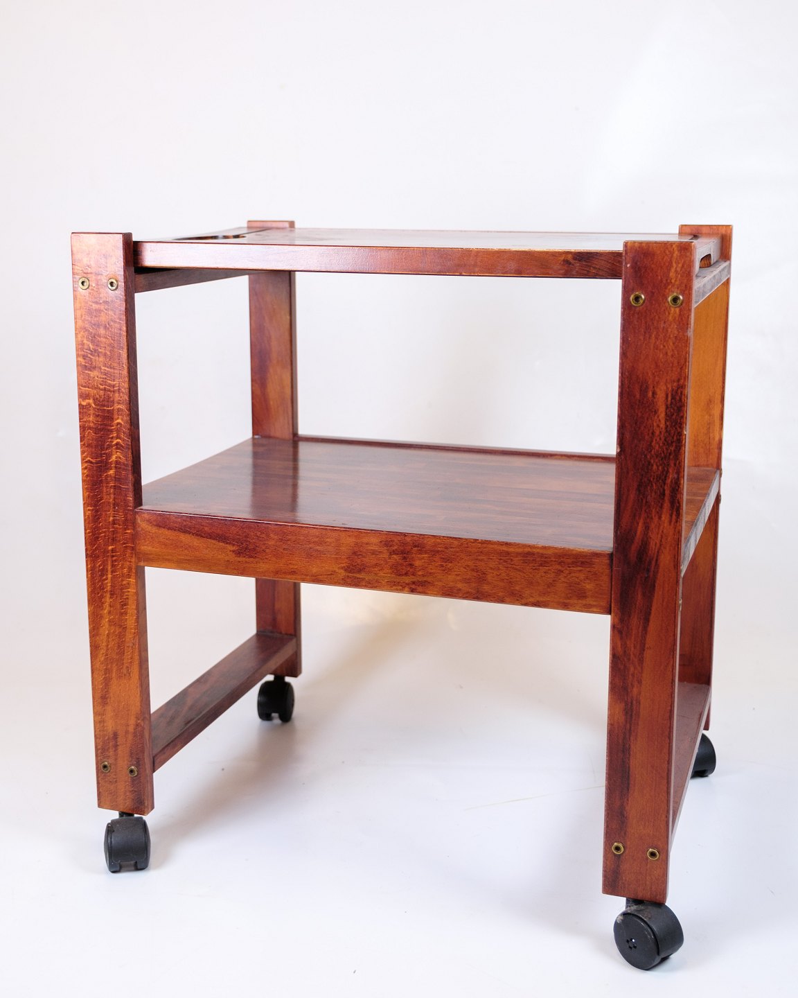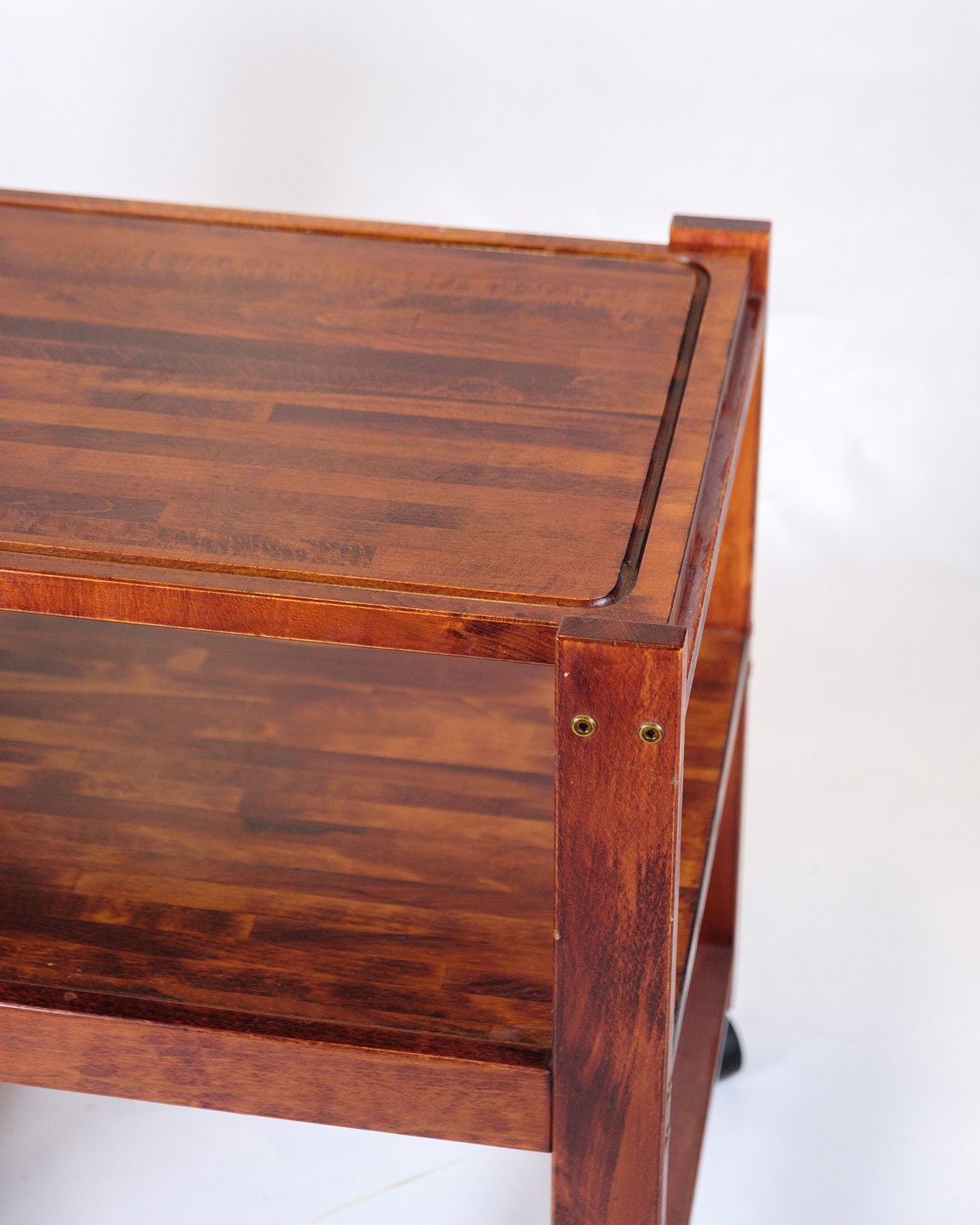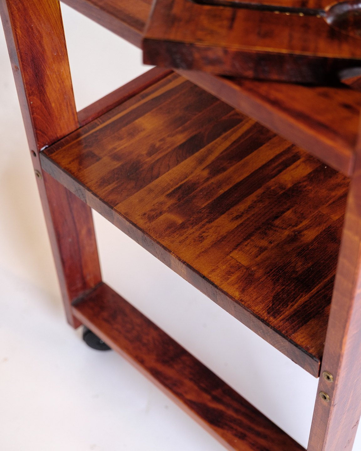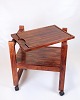 Vintage serveringsvogn på hjul, udført i mørkt træ. Vognen har et praktisk aftageligt skærebræt på toppen, som gør den funktionel både i køkkenet og ved servering.
