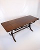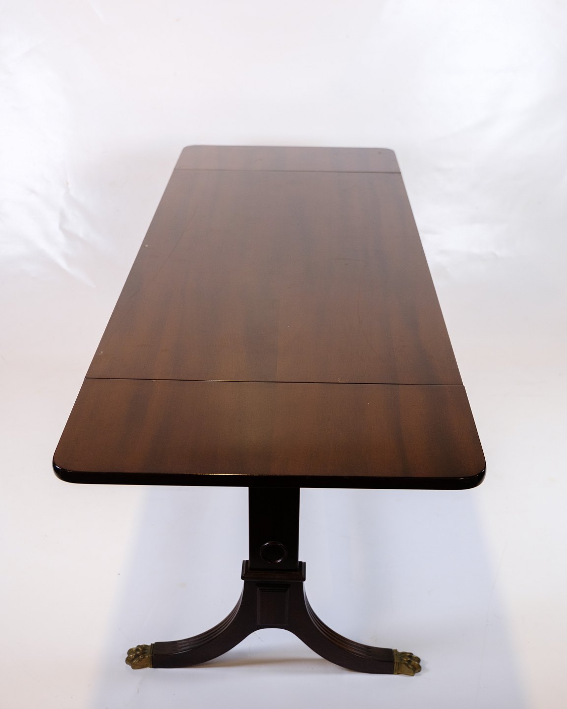 Sofabord i mahogni fra 1960’erne udført i stil af Hepplewhite. Bordet har klapper i begge sider, som kan foldes op for at udvide bordpladen, hvilket giver både fleksibilitet og funktionalitet.