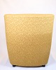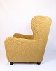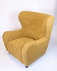 Lænestol med skammel fra 1940’erne. Overpolstret i mønstret gult stof med sorte ben. Klassisk design med høj komfort.