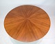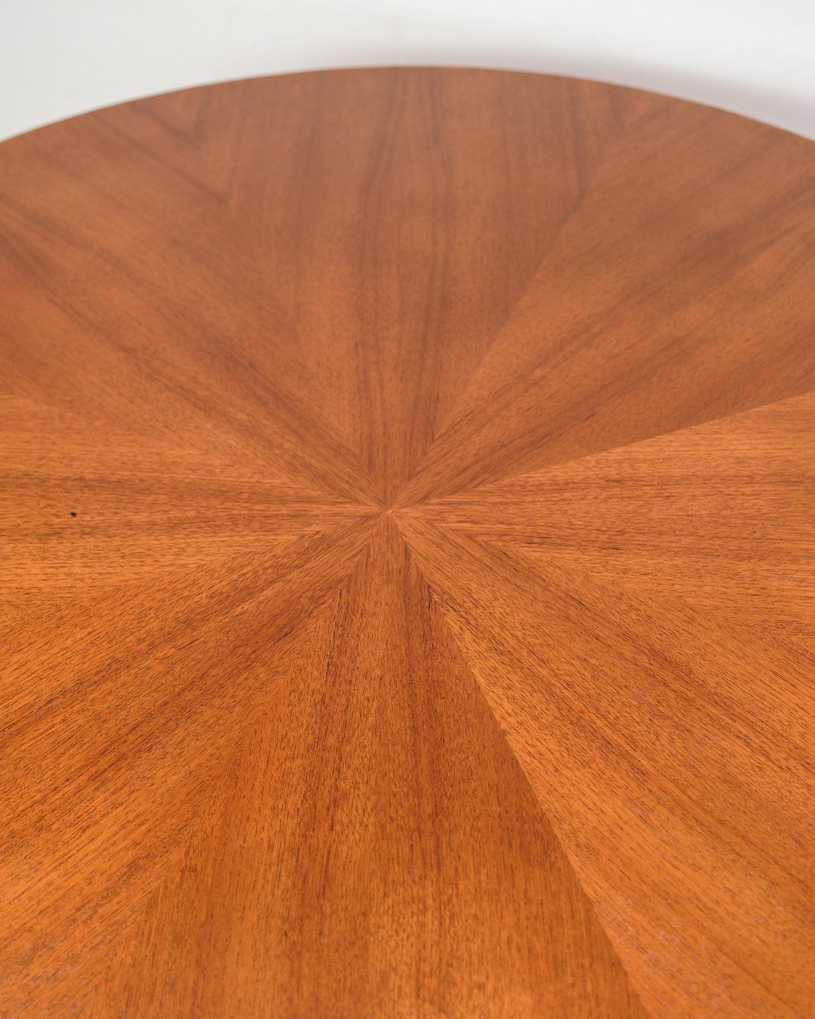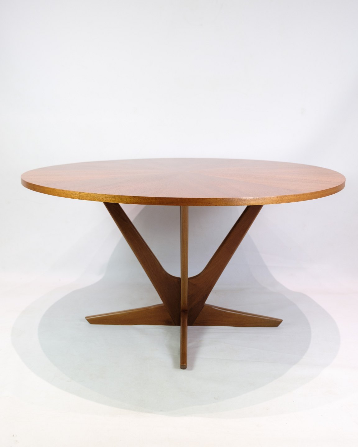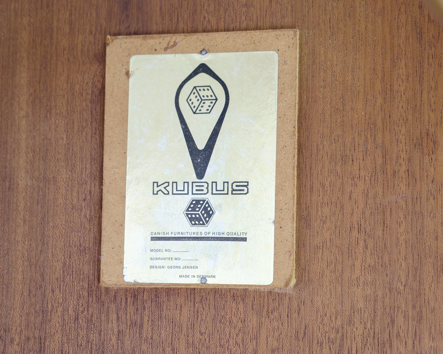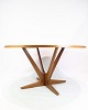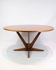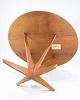 Rundt sofabord i teak, designet af Holger Georg Jensen og produceret af Kubus i 1960’erne. Bordpladen er udført i teakfinér med et smukt stjernemønstret åreforløb, der giver bordet et eksklusivt og levende udtryk. Understellet har et markant formsprog, der både understreger bordets skulpturelle karakter og giver en solid konstruktion.
