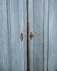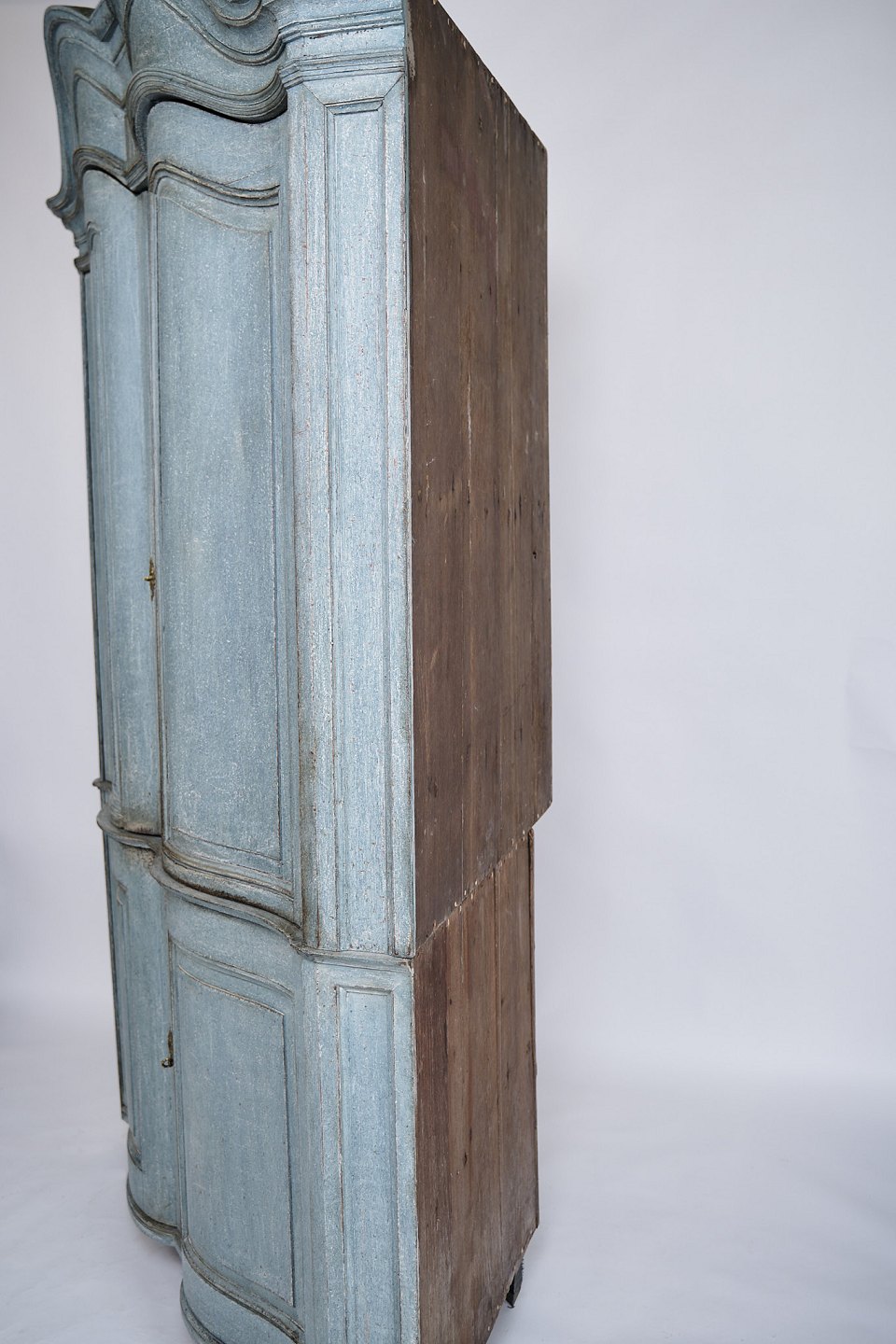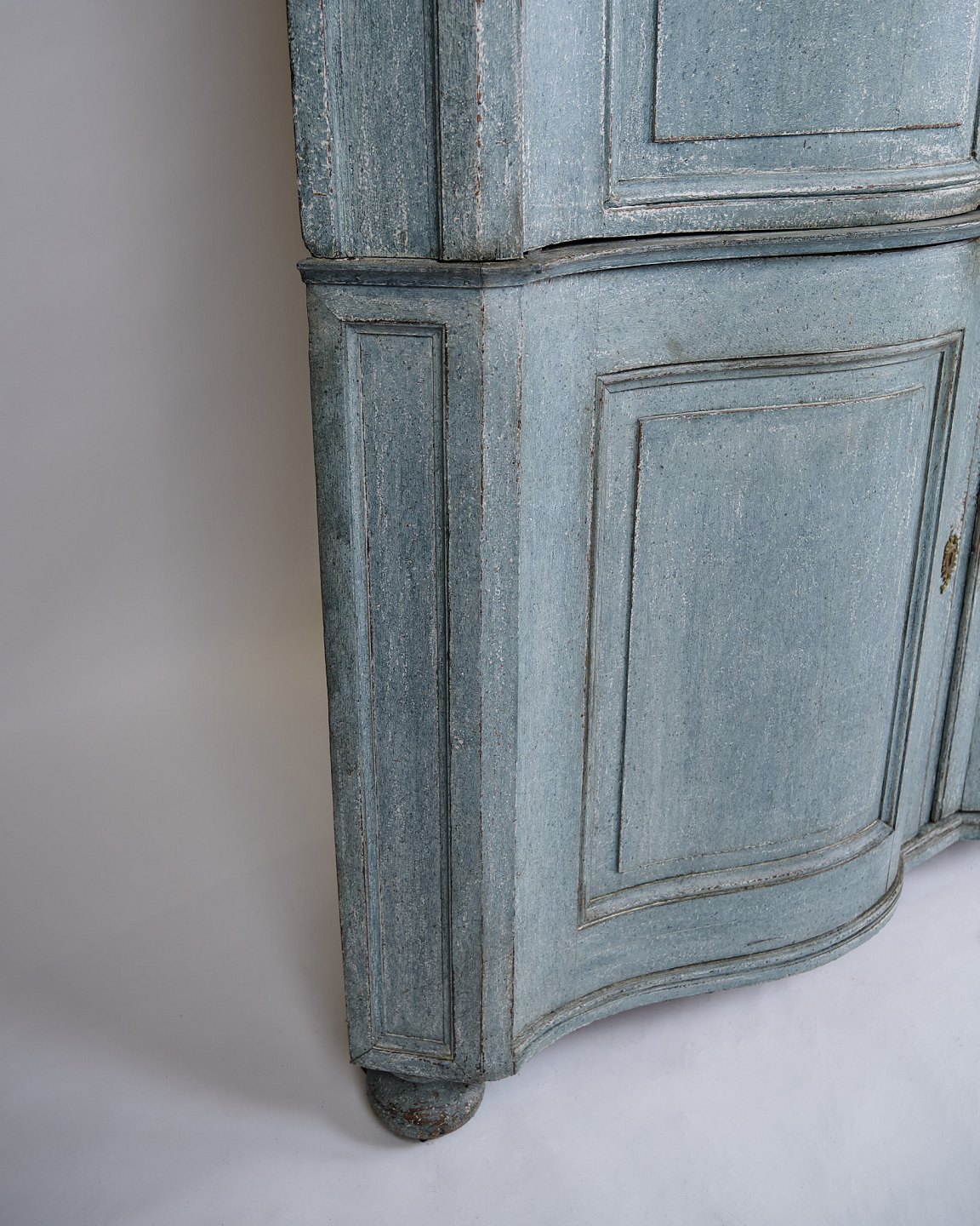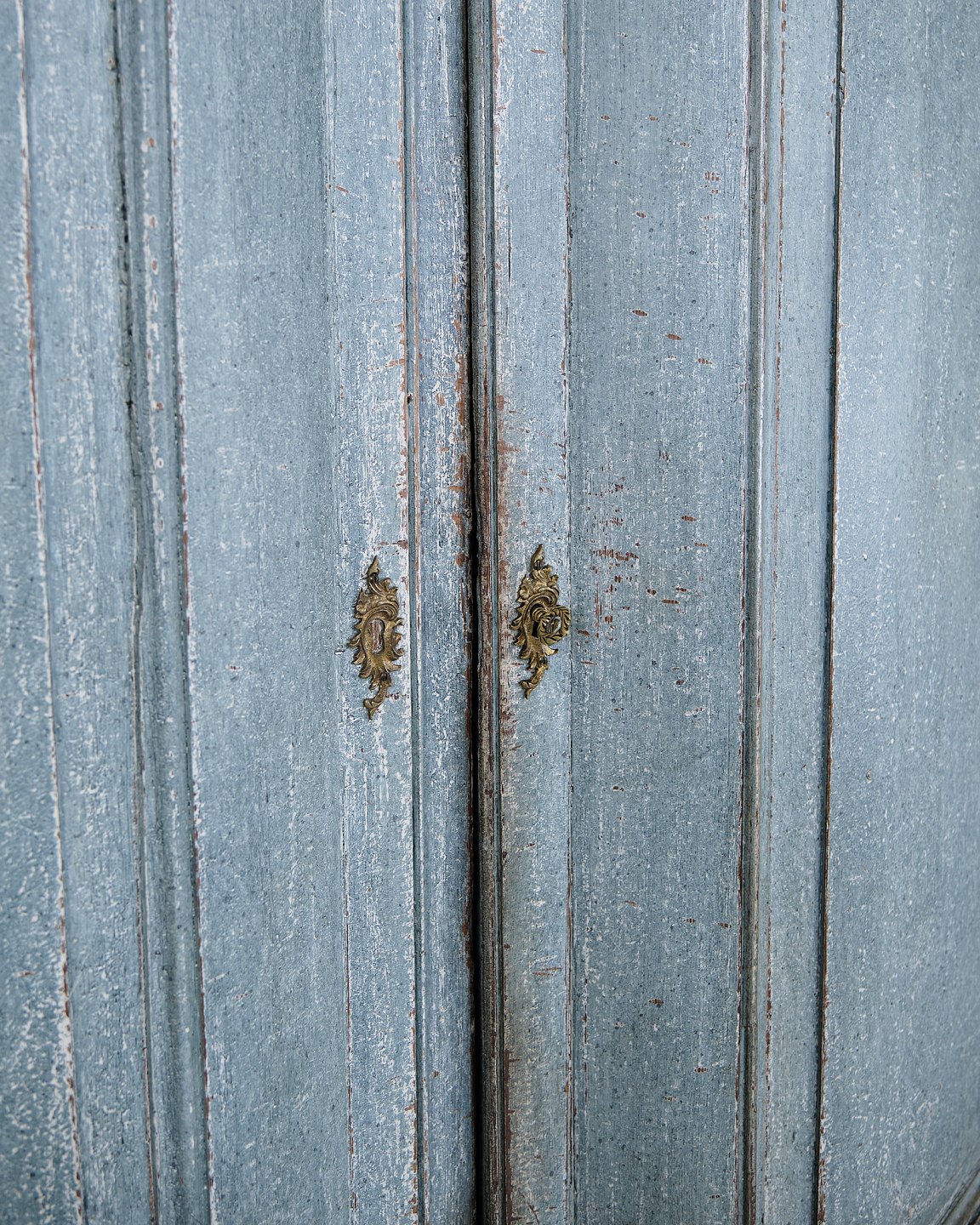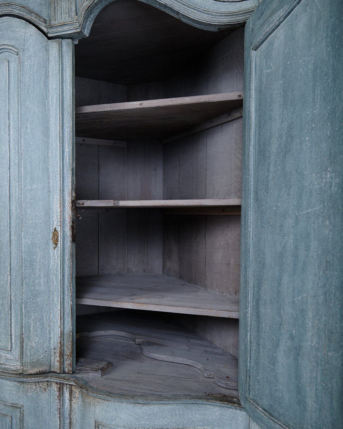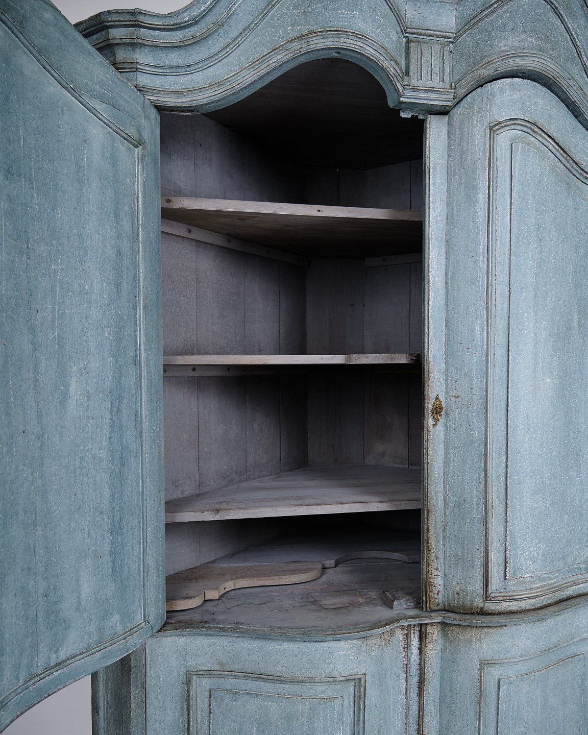 Kontakt os vedrørende prisStort barok hjørneskab fra 1780’erne. Original blå bemaling, buede låger og messingbeslag. Sjældent og autentisk antikt møbel.