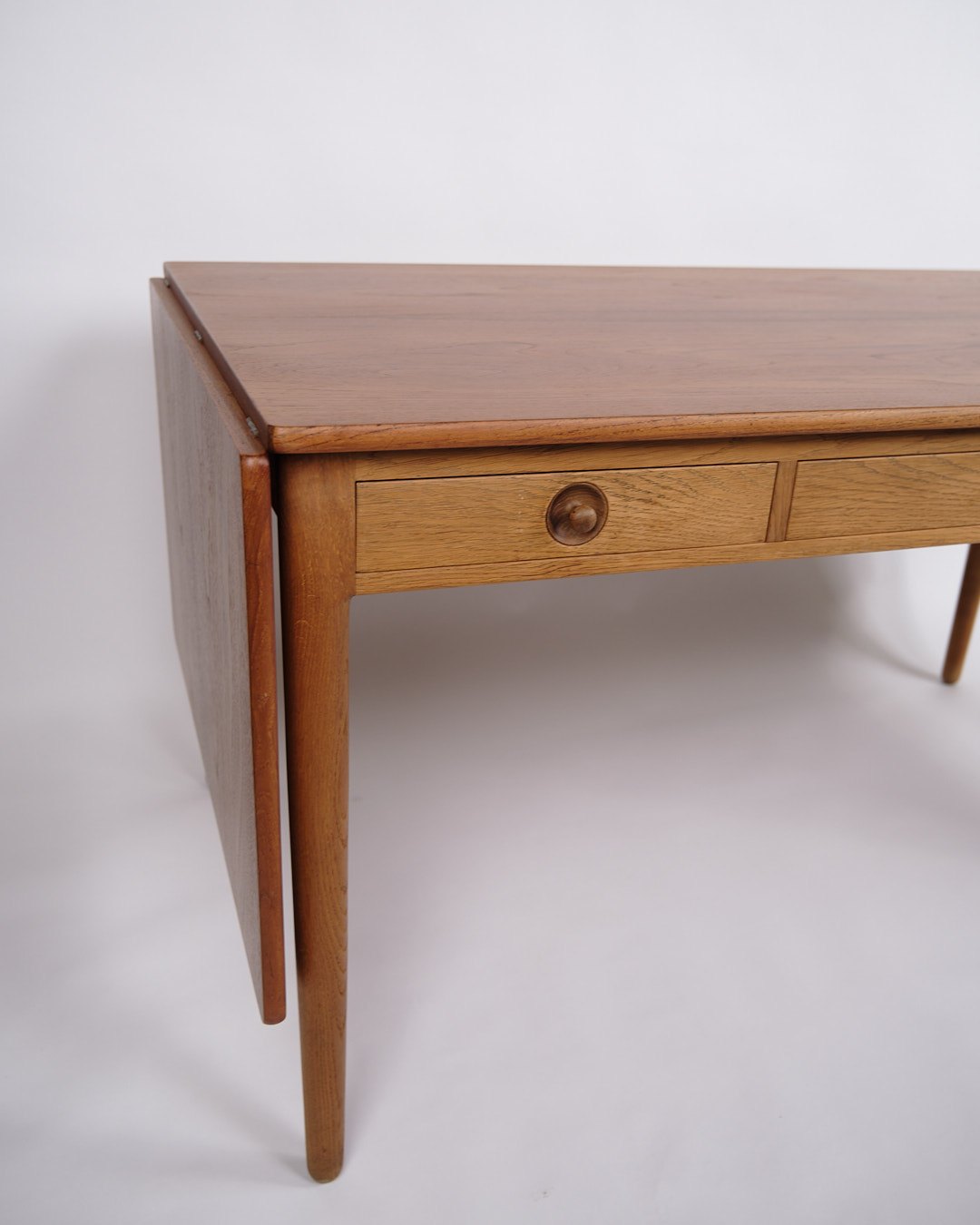Kontakt os vedrørende prisSkrivebord med klapper, model AT-305, designet af Hans J. Wegner og produceret af Andreas Tuck i 1950’erne. Bordet er udført i teak med ben i eg og kan udvides fra 135 cm til hele 229 cm ved hjælp af to klapper, hvilket gør det både funktionelt og fleksibelt.