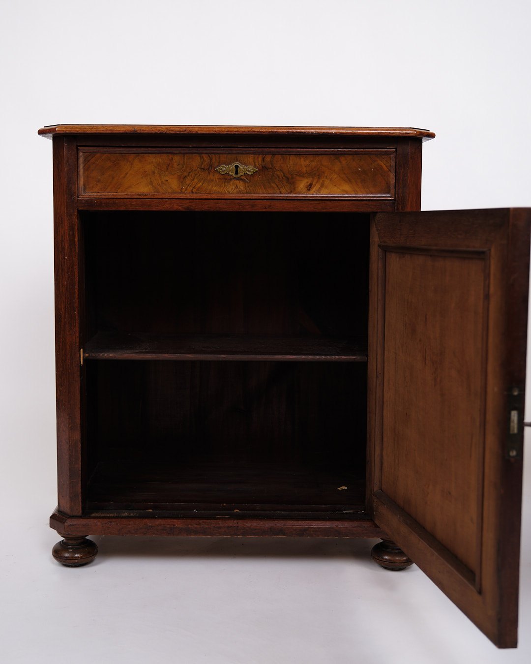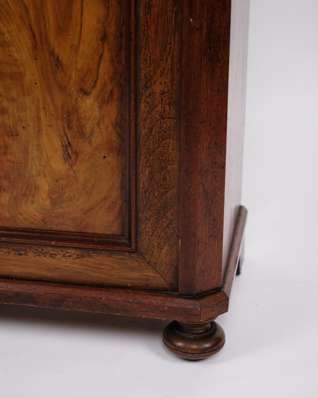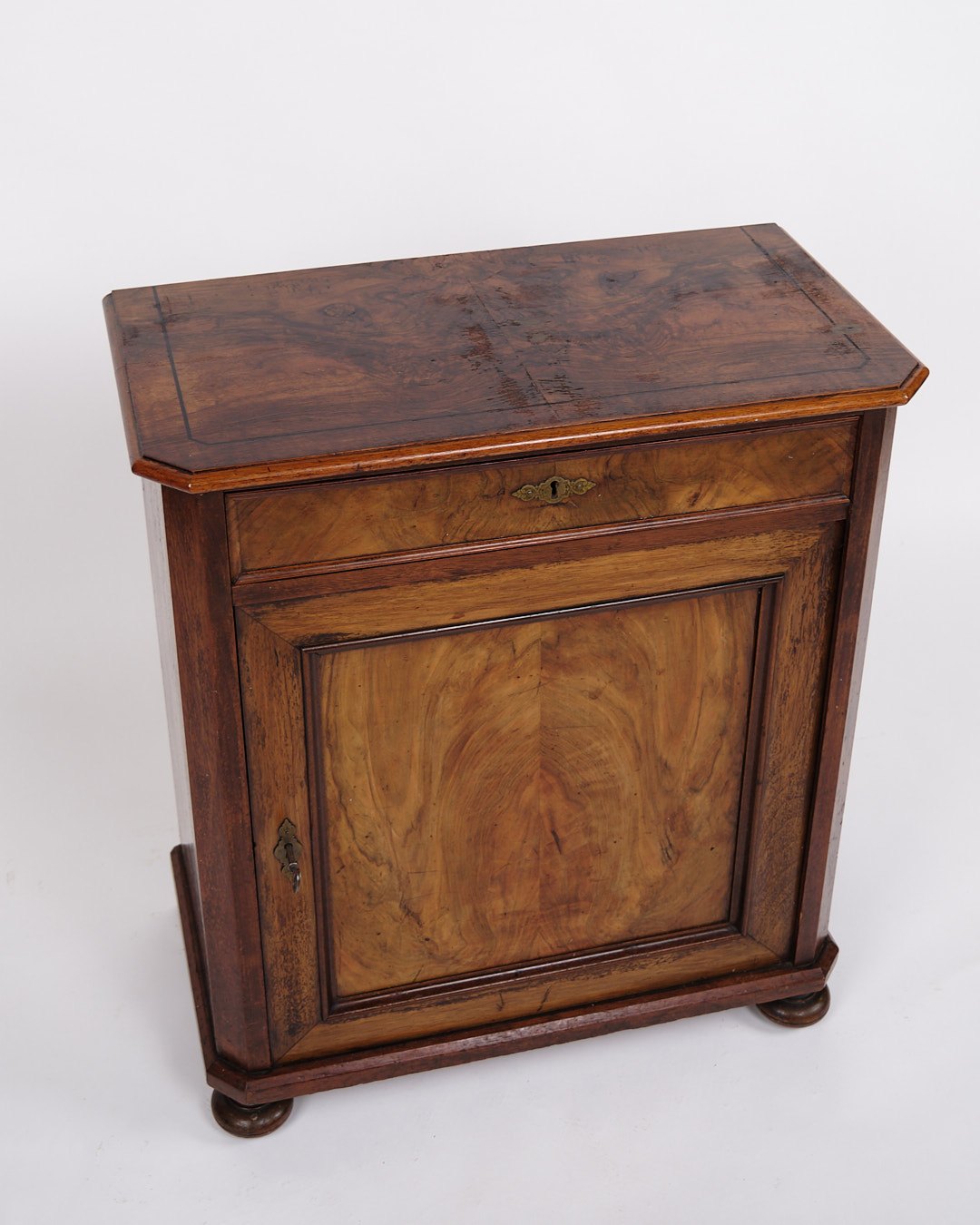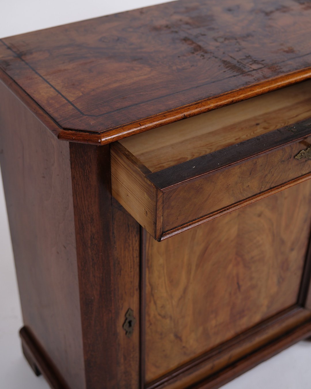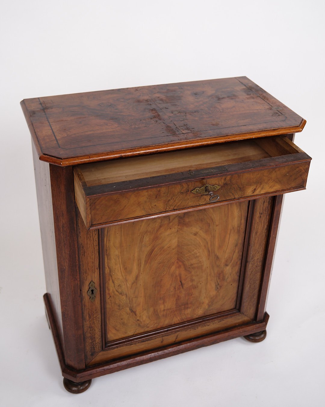 Lille antikt konsol-/entréskab fra 1880’erne. Mahogni og nøddetræ med runde ben.