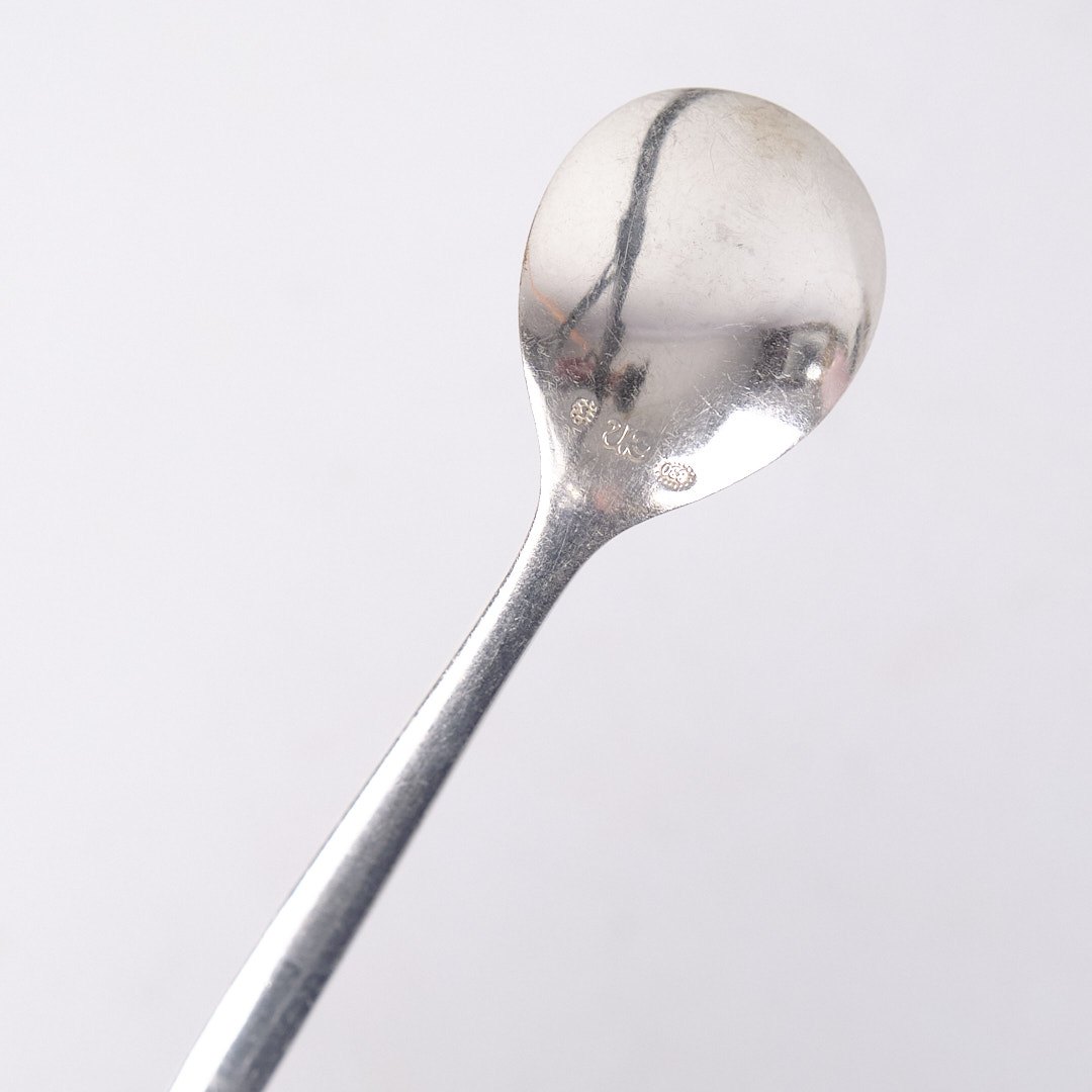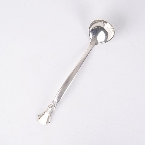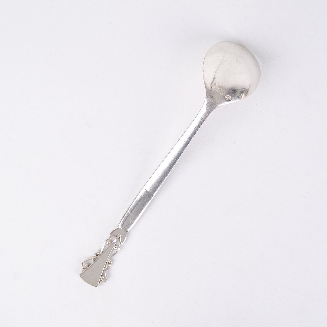 Flødeske udført i tretårnet sølv af sølvsmeden Evald Nielsen. Skeen er stemplet “EN 830s” og bærer Nielsens karakteristiske, enkle formsprog, som kombinerer funktionalitet med elegant håndværk.