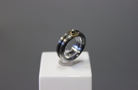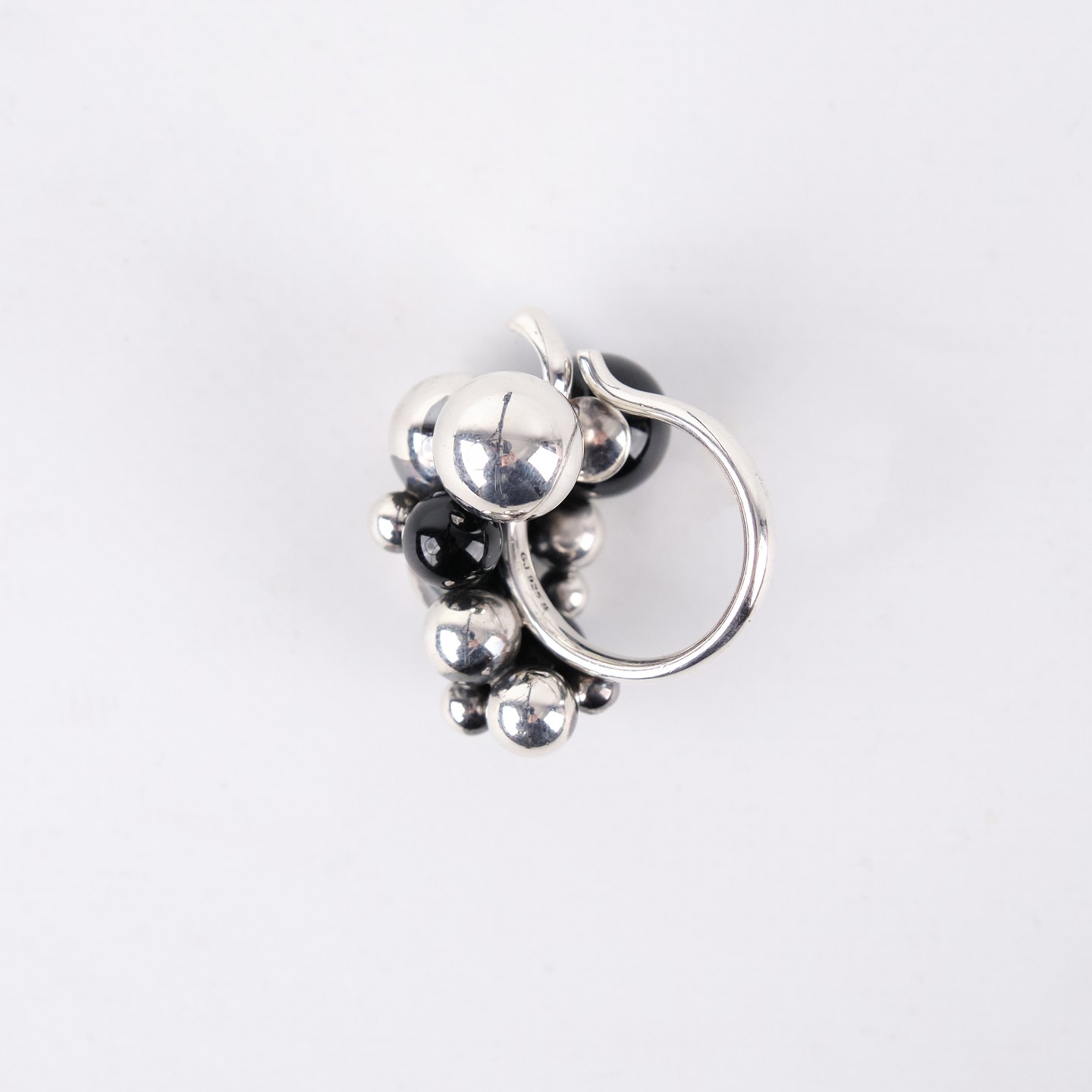 Georg Jensen ring i sterling sølv, model 54 fra Moonlight Grapes-kollektionen. Ringen har det karakteristiske drueornament, som måler 3 × 2,5 cm, og fremstår som et klassisk eksempel på Georg Jensens organiske formsprog. Elegant smykke udført i høj kvalitet.