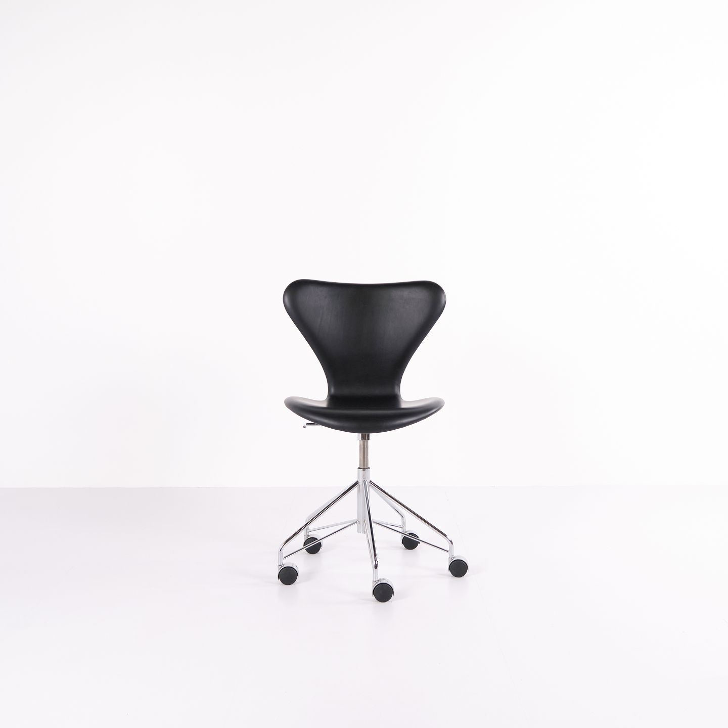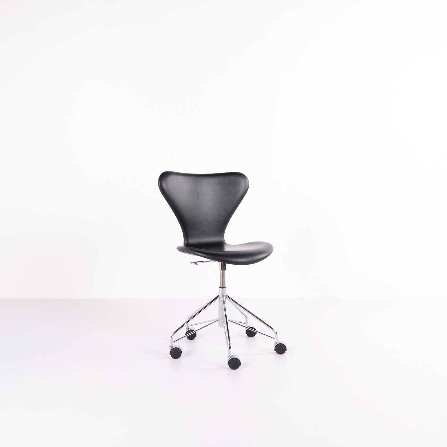 Arne Jacobsen Syver kontorstol, model 3117, for Fritz Hansen. I sortlæder og kromstel med hjul. Klassisk dansk design.