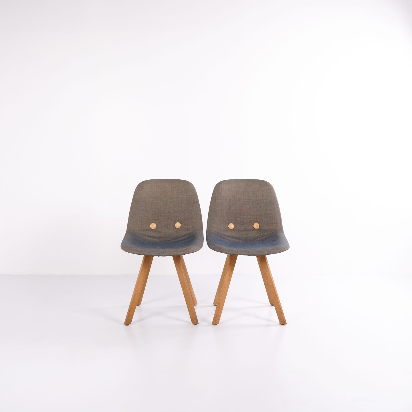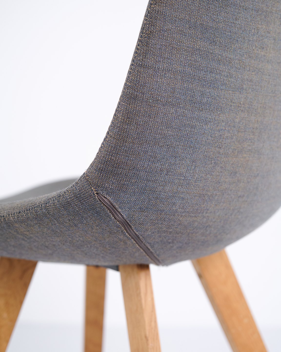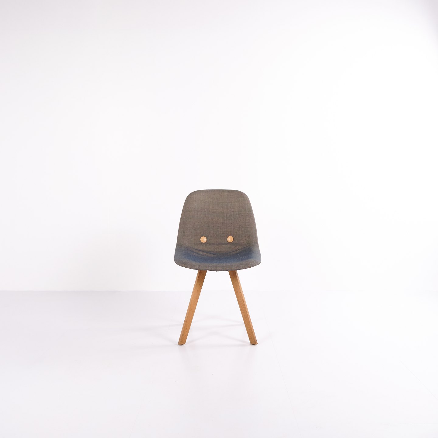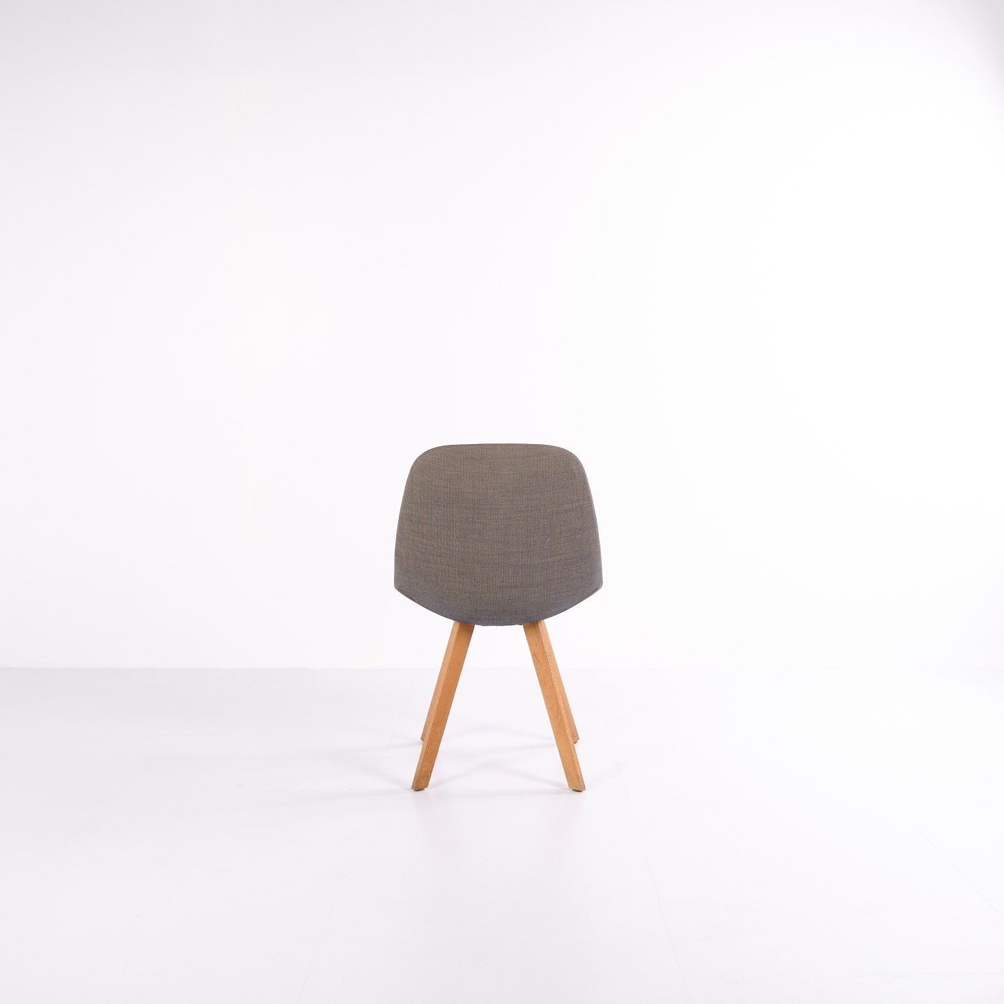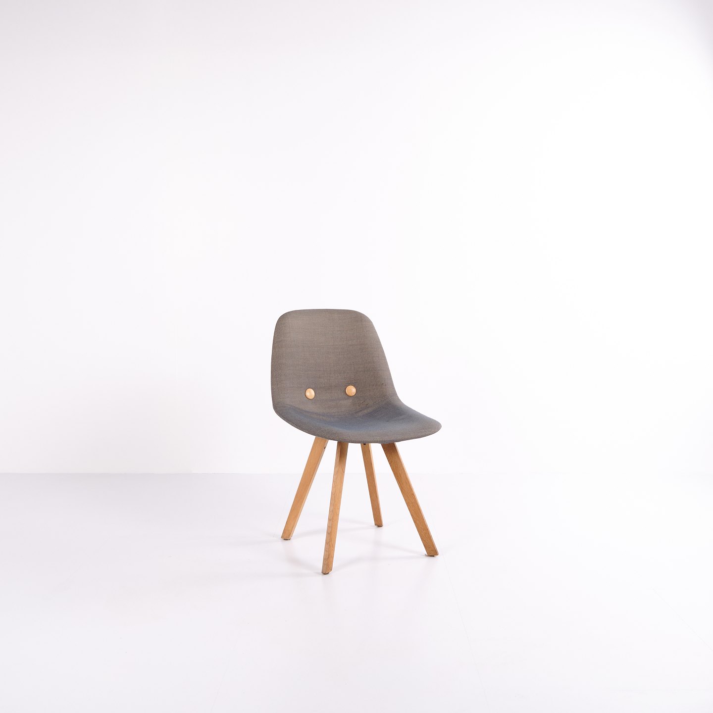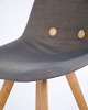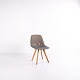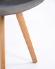 Eyes Wood stol fra Erik Jørgensen, udført med mellemgrå polstring og ben i massivt træ. En moderne spisebordsstol med god siddekomfort og høj materialekvalitet.