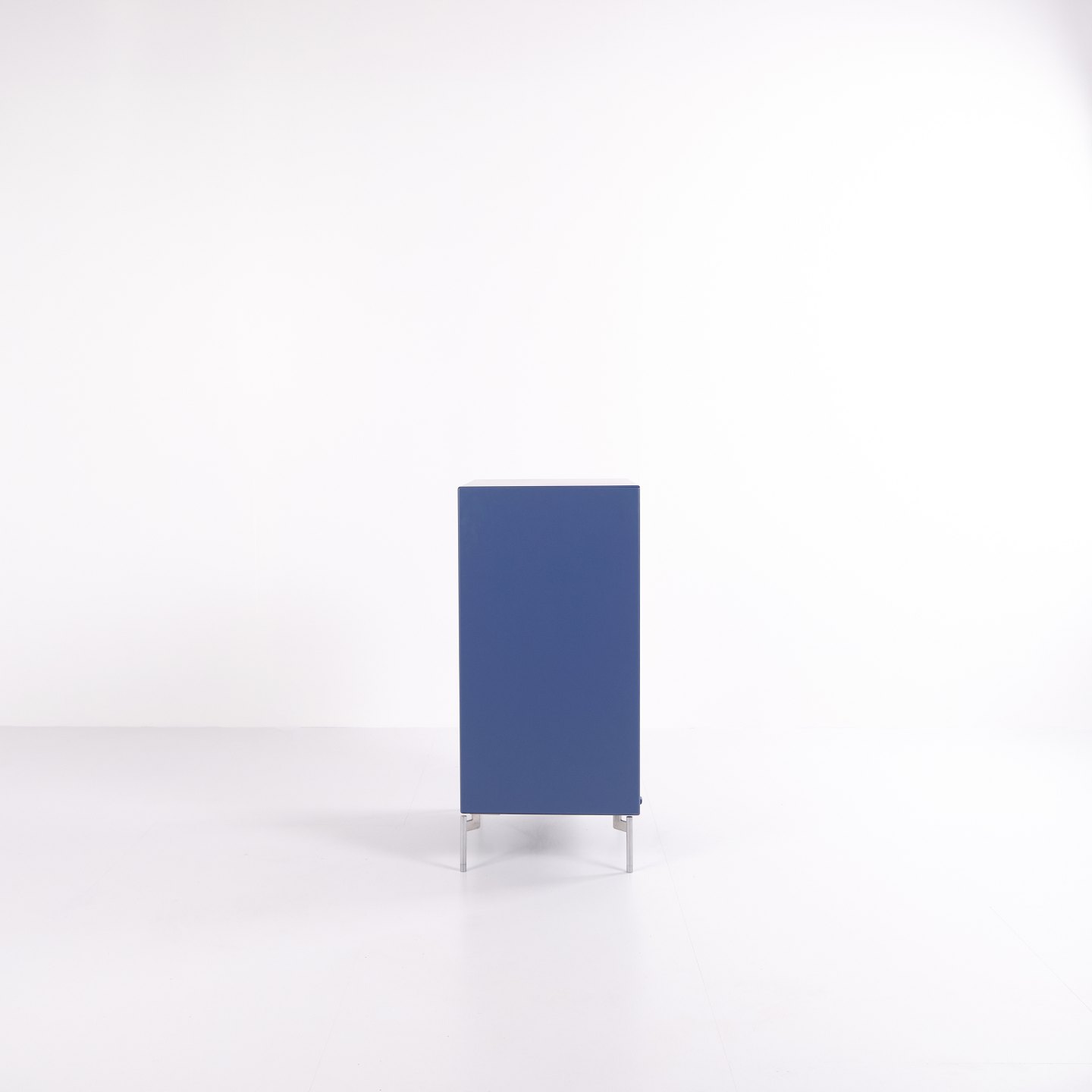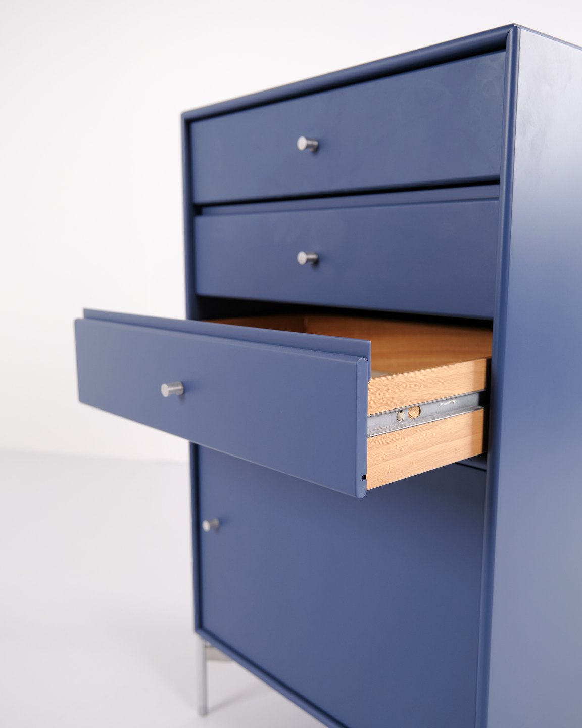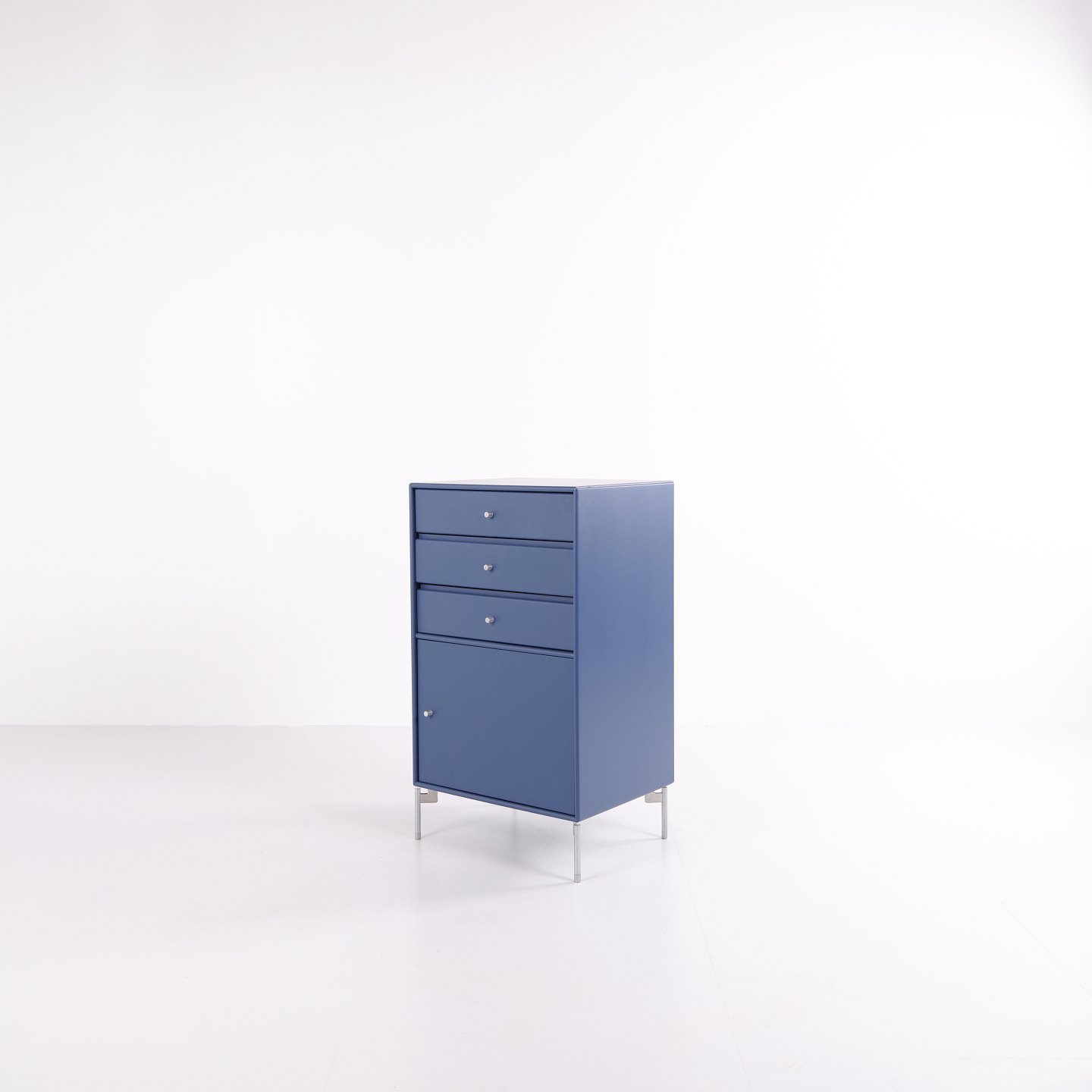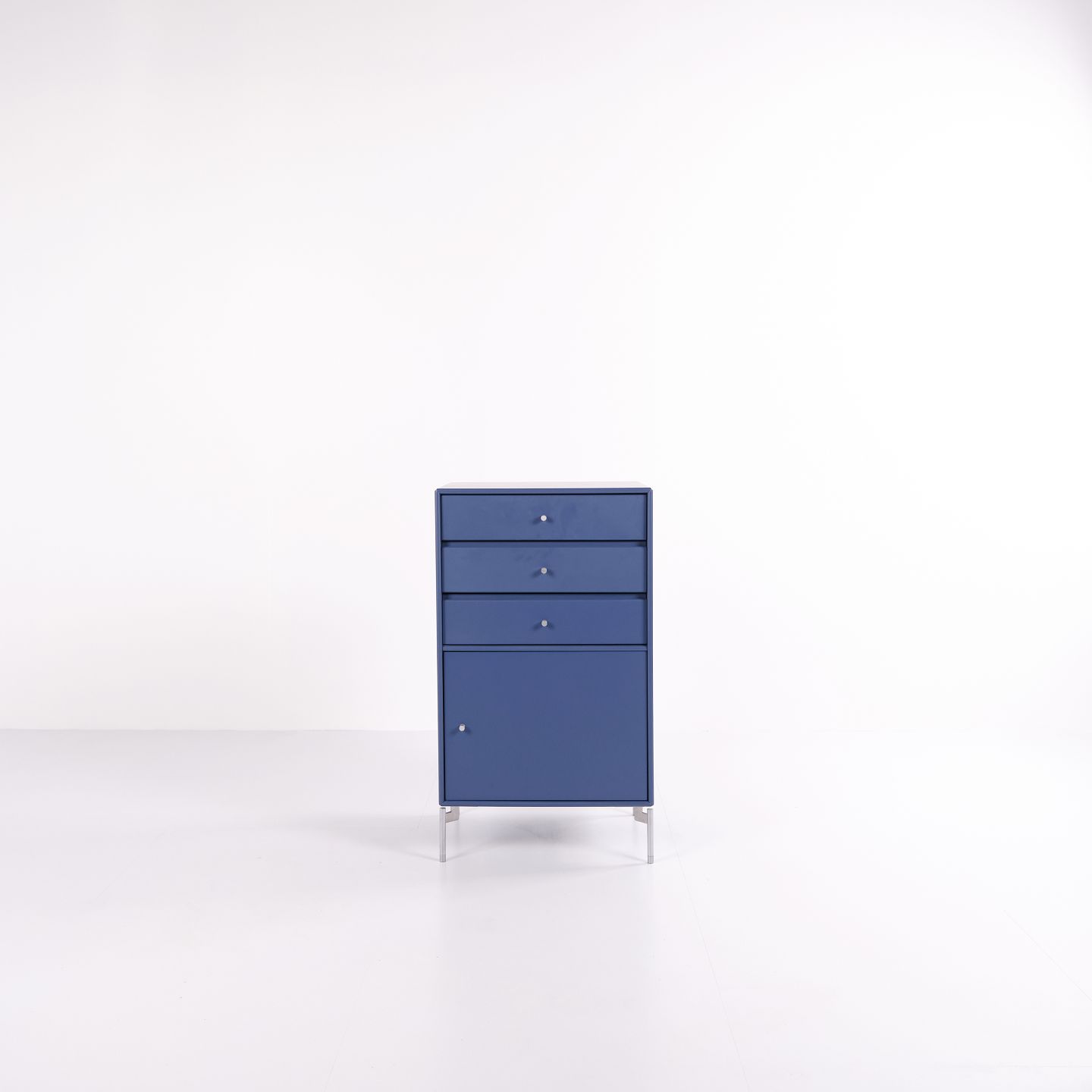 Montana skab / arkivskab i blå, monteret med krom ben. Indrettet med tre skuffer og én låge, ideelt til opbevaring i kontor, stue eller entre. Klassisk Montana-modul med høj funktionalitet og tidløst design.