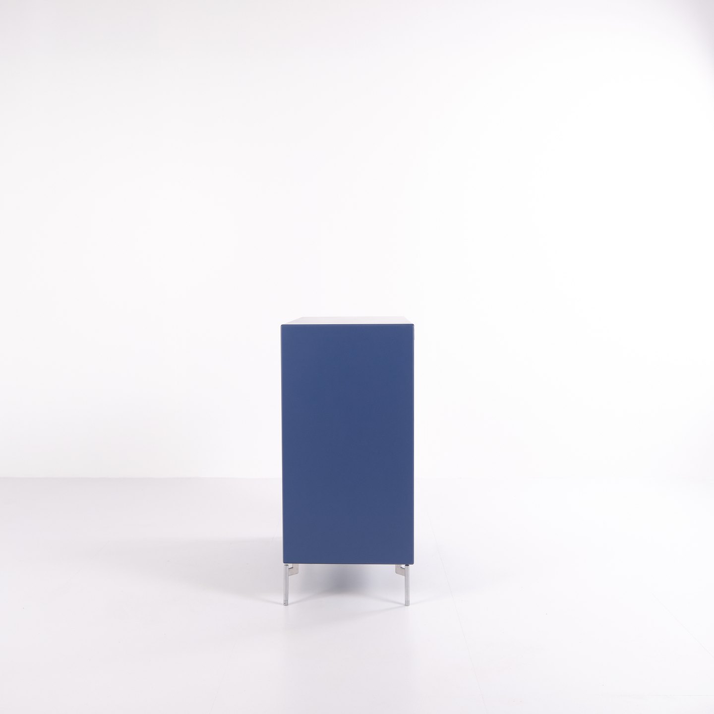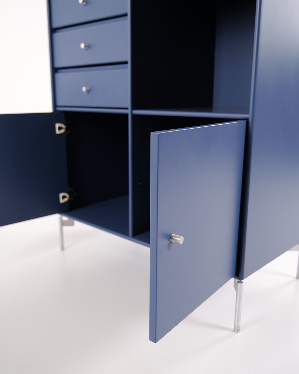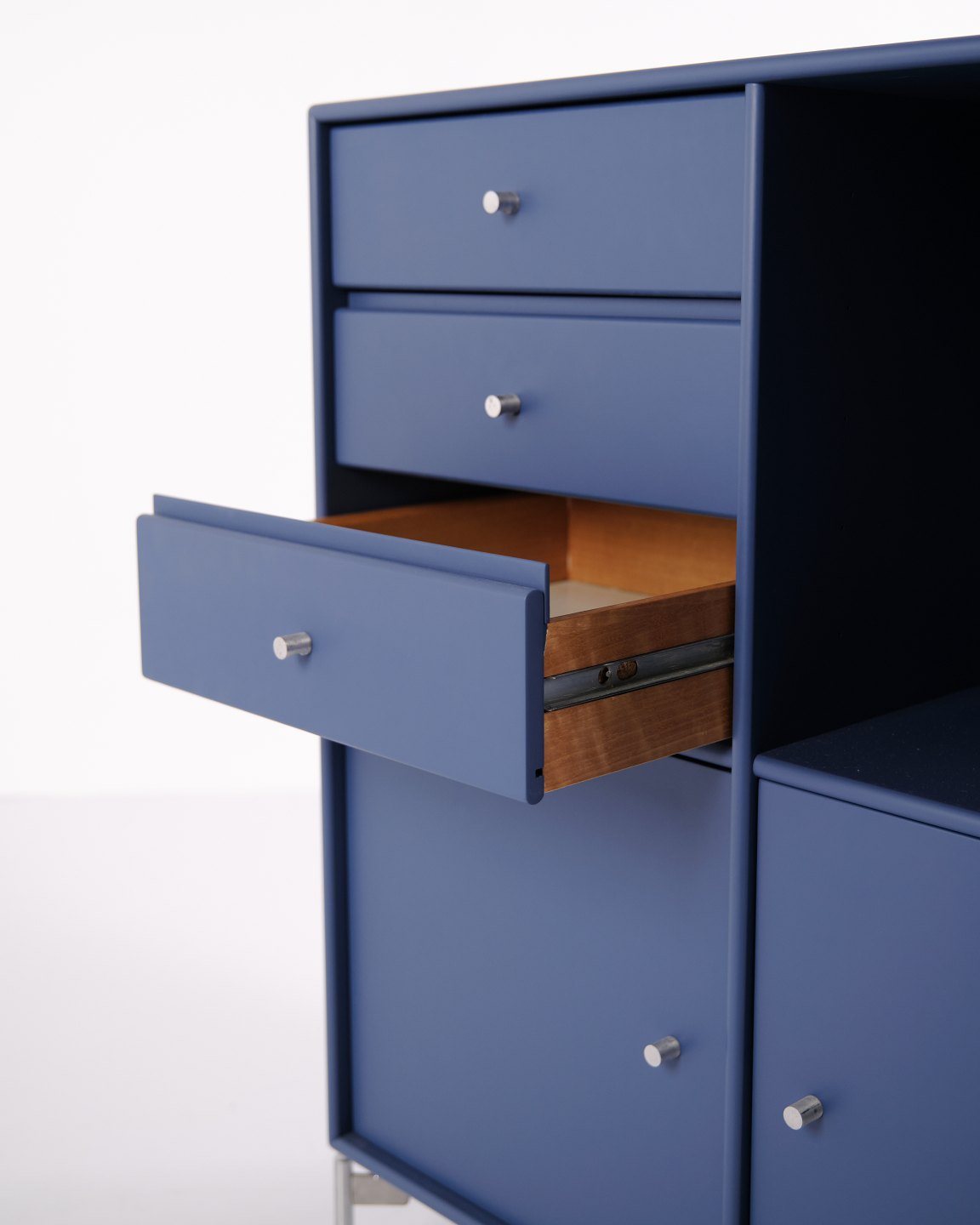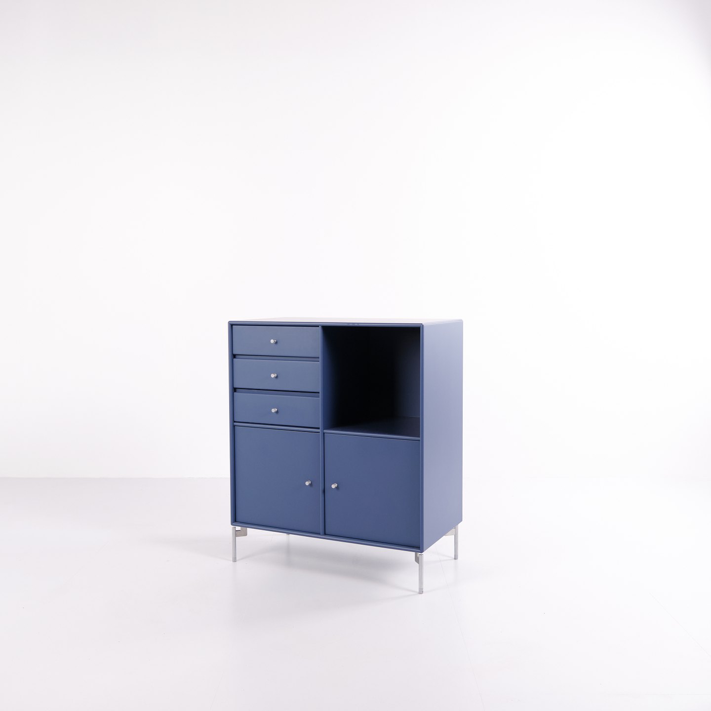 Montana kommode i blå med krom ben. Modulet er indrettet med tre skuffer og to låger, hvilket giver god og fleksibel opbevaringsplads. Klassisk Montana-design med enkel struktur og høj funktionalitet.