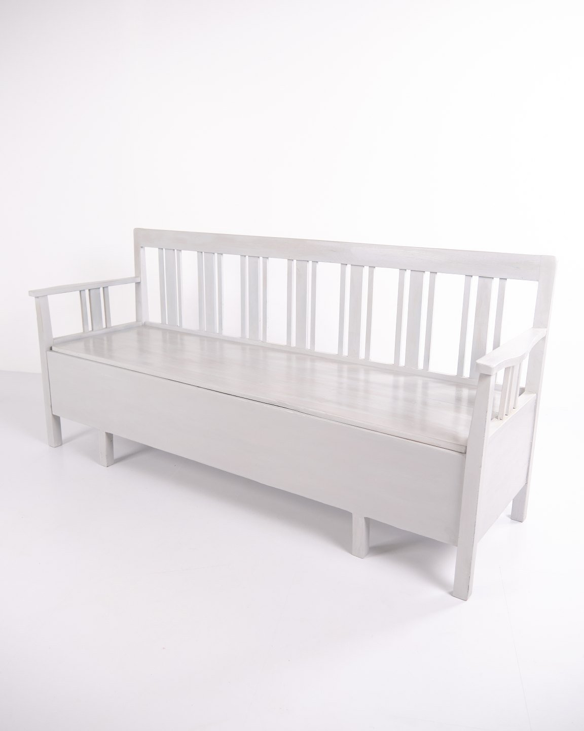 Svensk slagbænk fra ca. 1860’erne, udført i fyrretræ og gråmalet i senere tid. Klassisk skandinavisk møbel med dekorative bemalinger og praktisk sidde- og opbevaringsfunktion. Et solidt antikt stykke med tidstypiske detaljer.