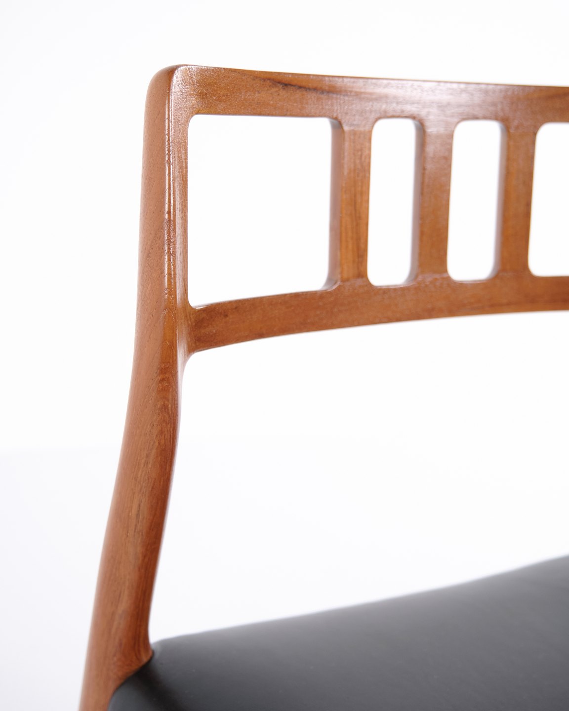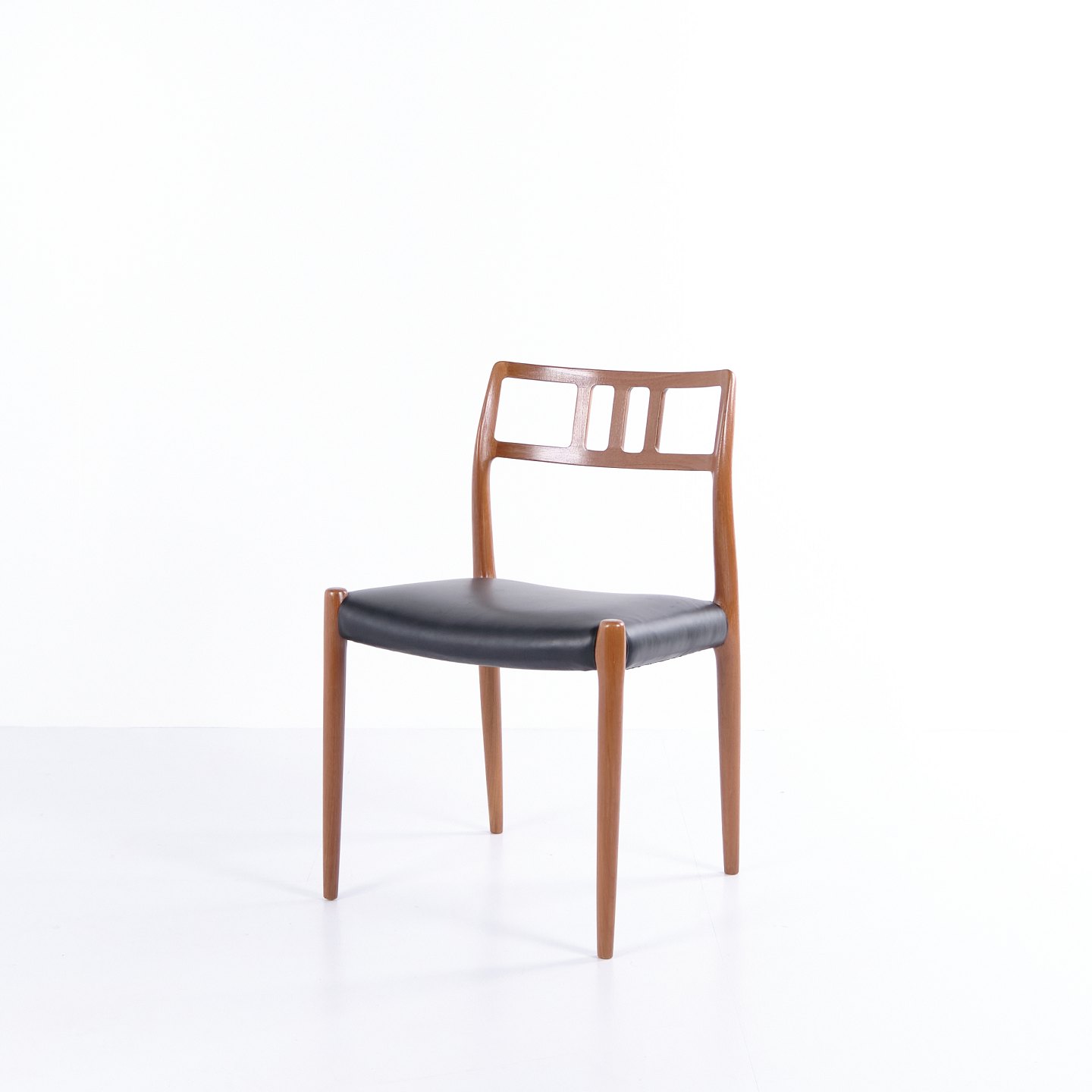 Spisebordsstol model 79, designet af Niels Otto Møller og fremstillet af JL Møllers Møbelfabrik i 1960’erne. Udført i teak med sort lædersæde. Et klassisk Møller-design, kendt for høj håndværkskvalitet og elegant form.