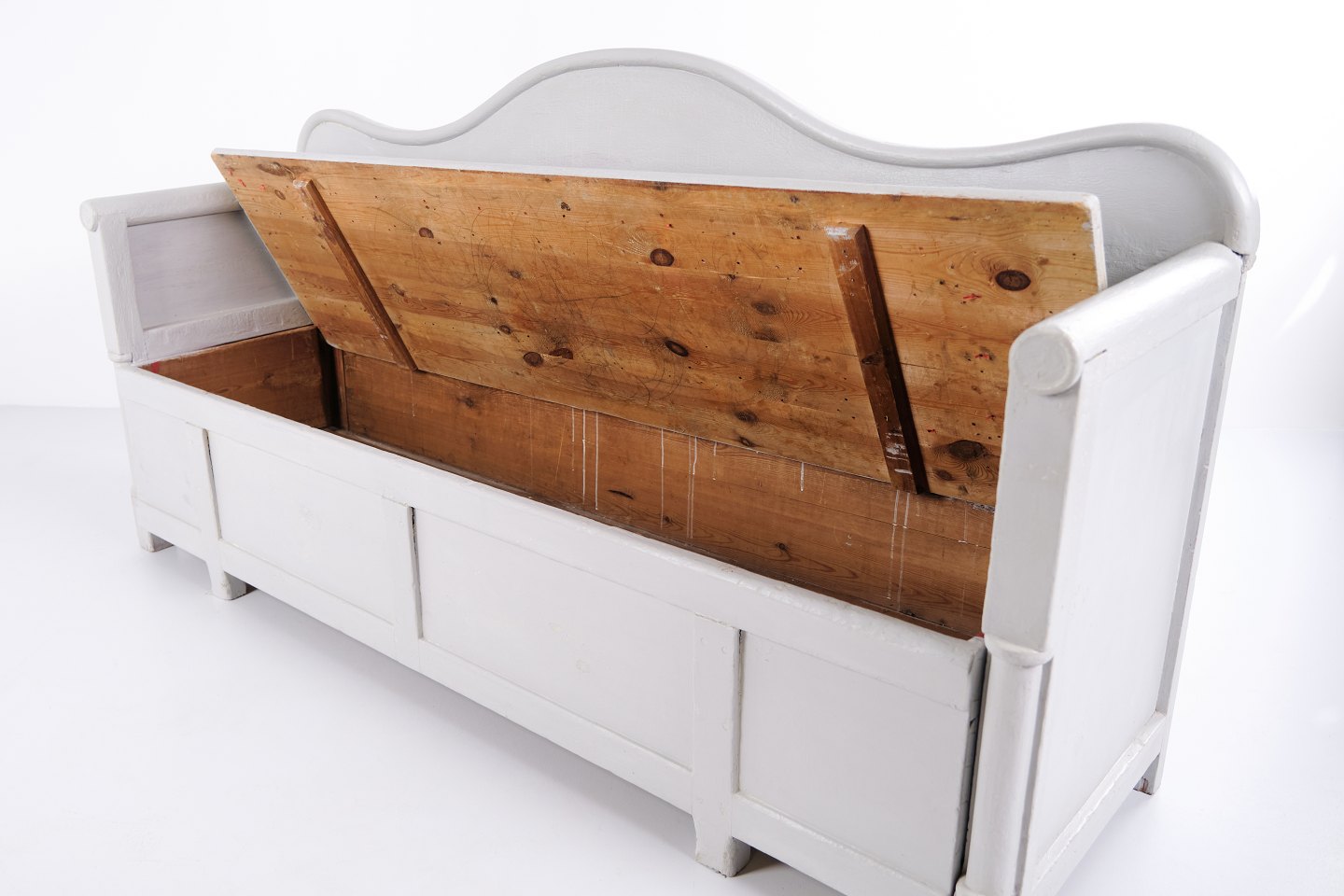 Antik svensk slagbænk fra 1900-tallet, udført i fyrretræ og grå bemalet. Klassisk model med opbevaringsrum under sædet og tidstypiske skandinaviske detaljer. Solidt møbel, velegnet til entré, køkken eller stue.