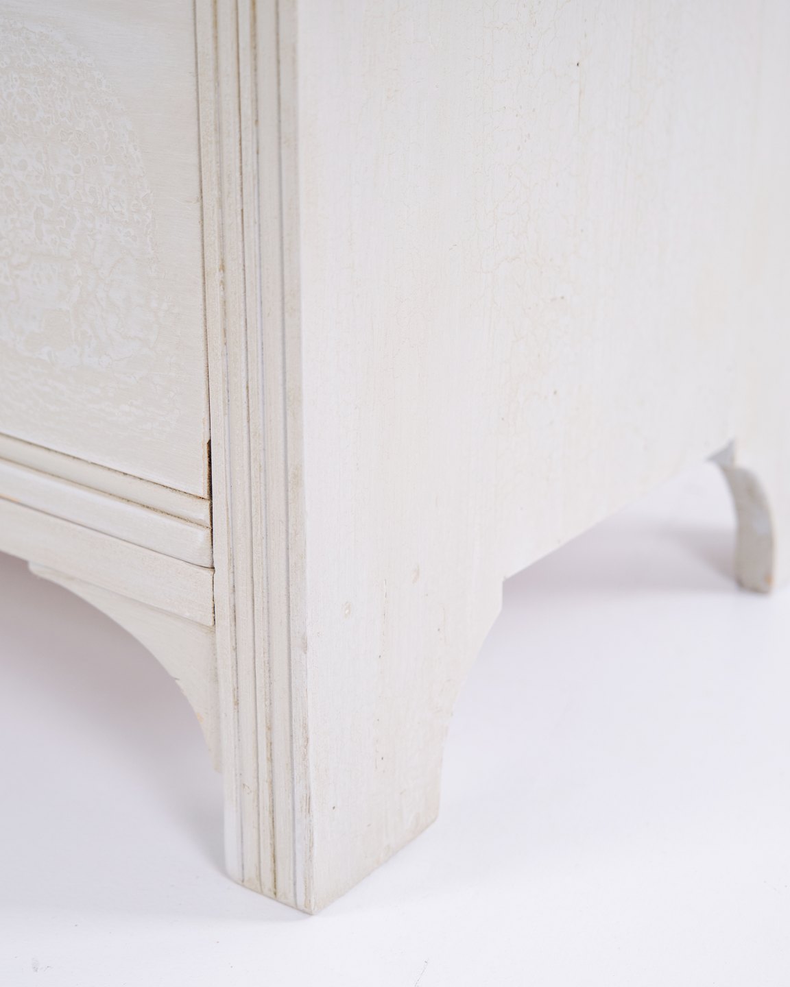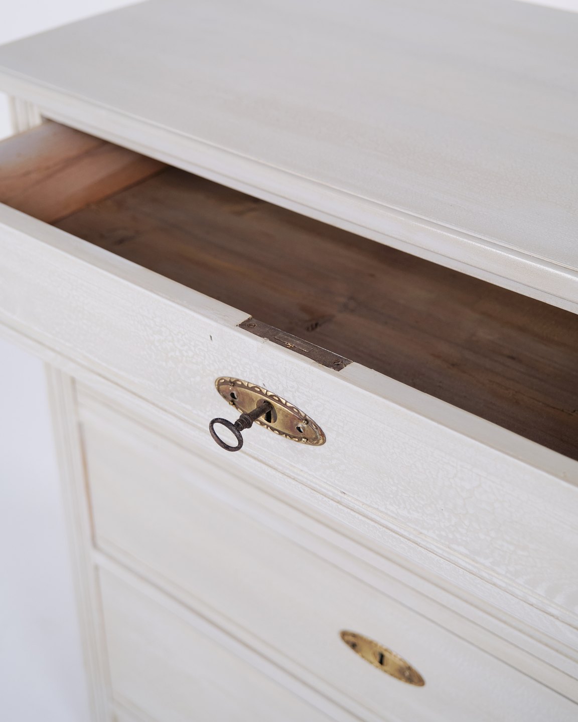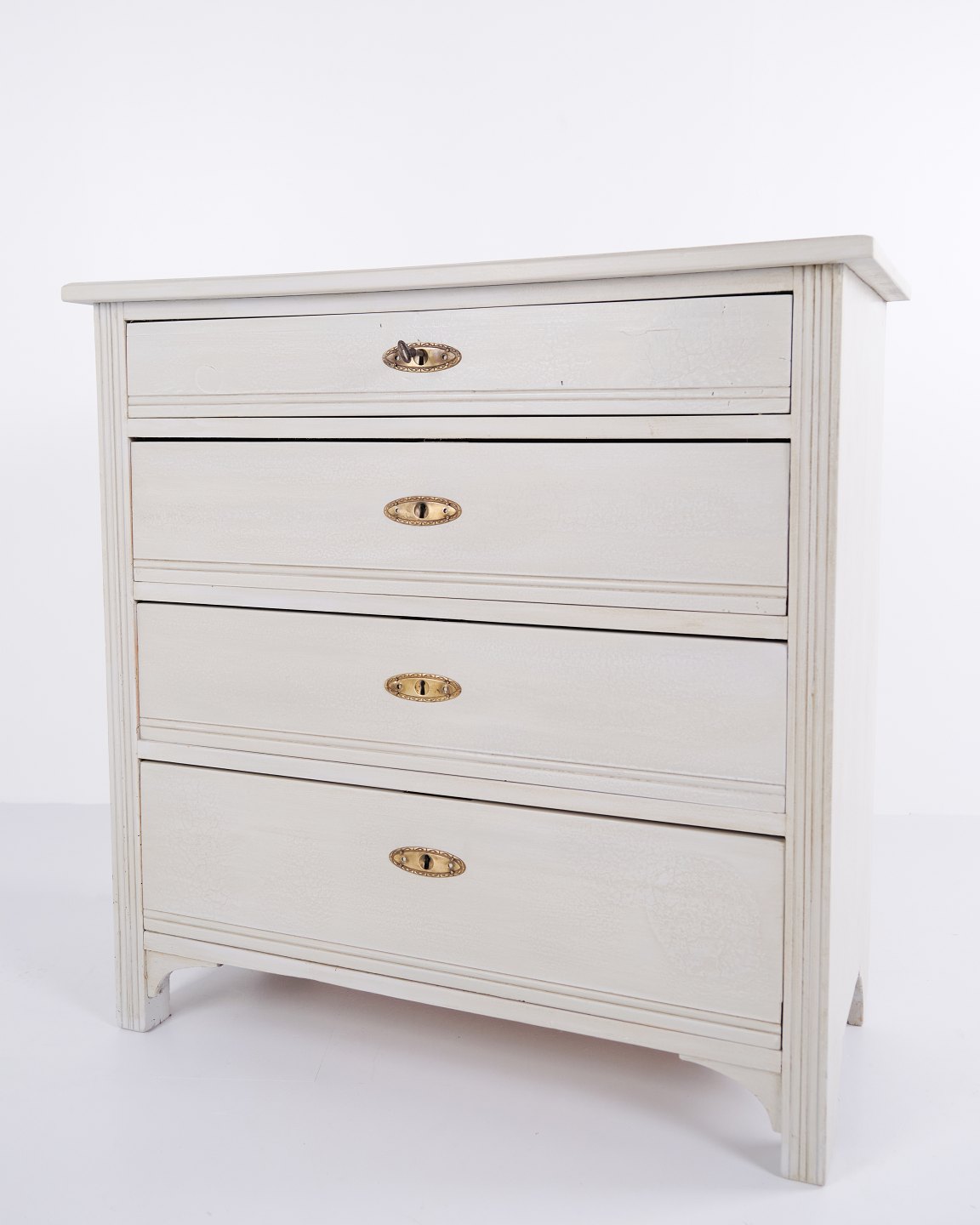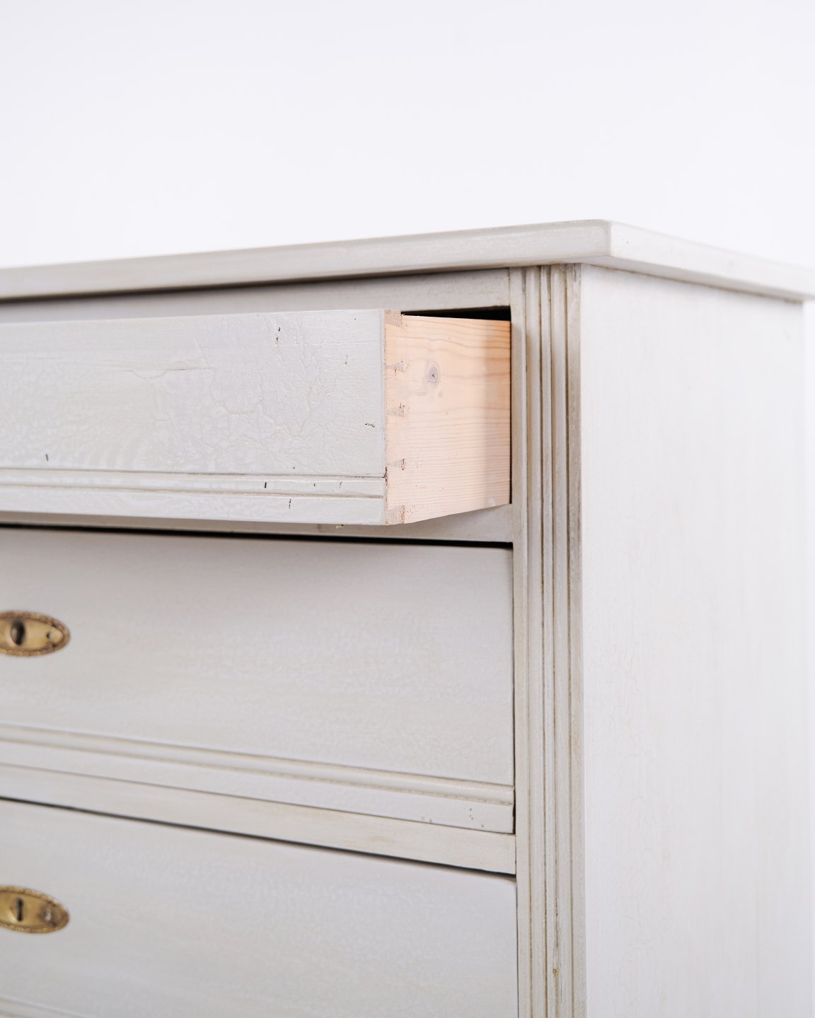 Antik kommode fra 1890’erne med fire skuffer. Gråmalet træ og klassisk formsprog med smuk patina.