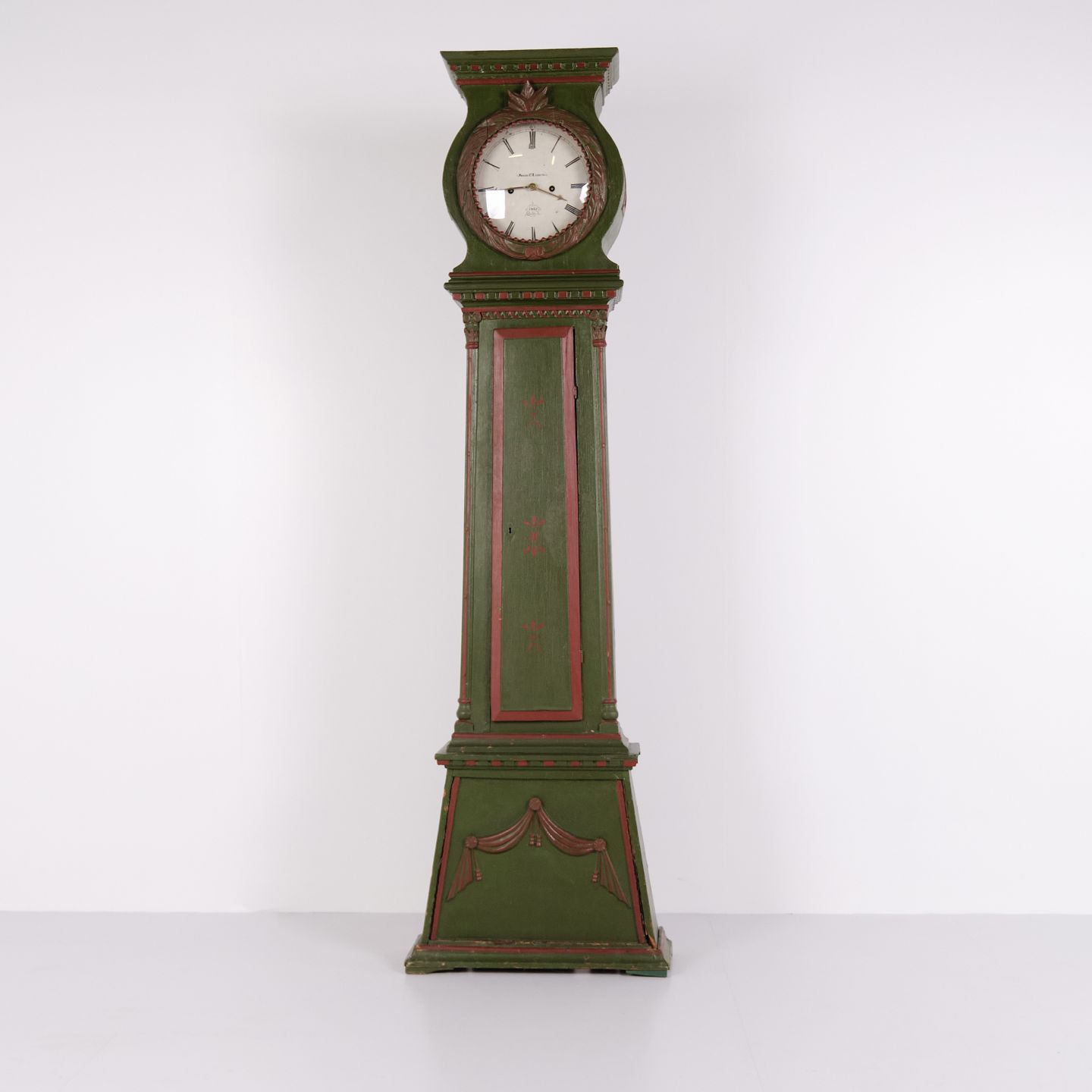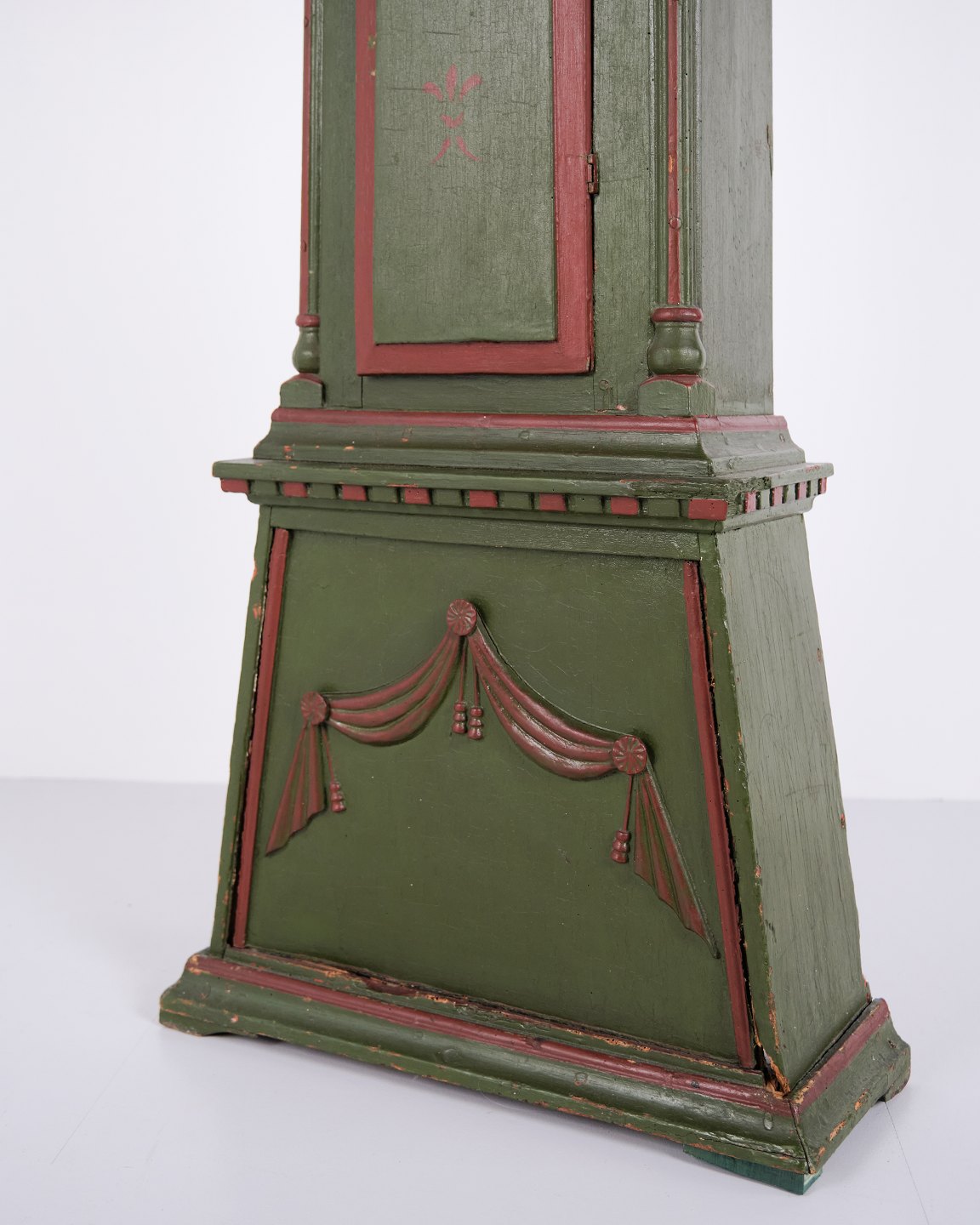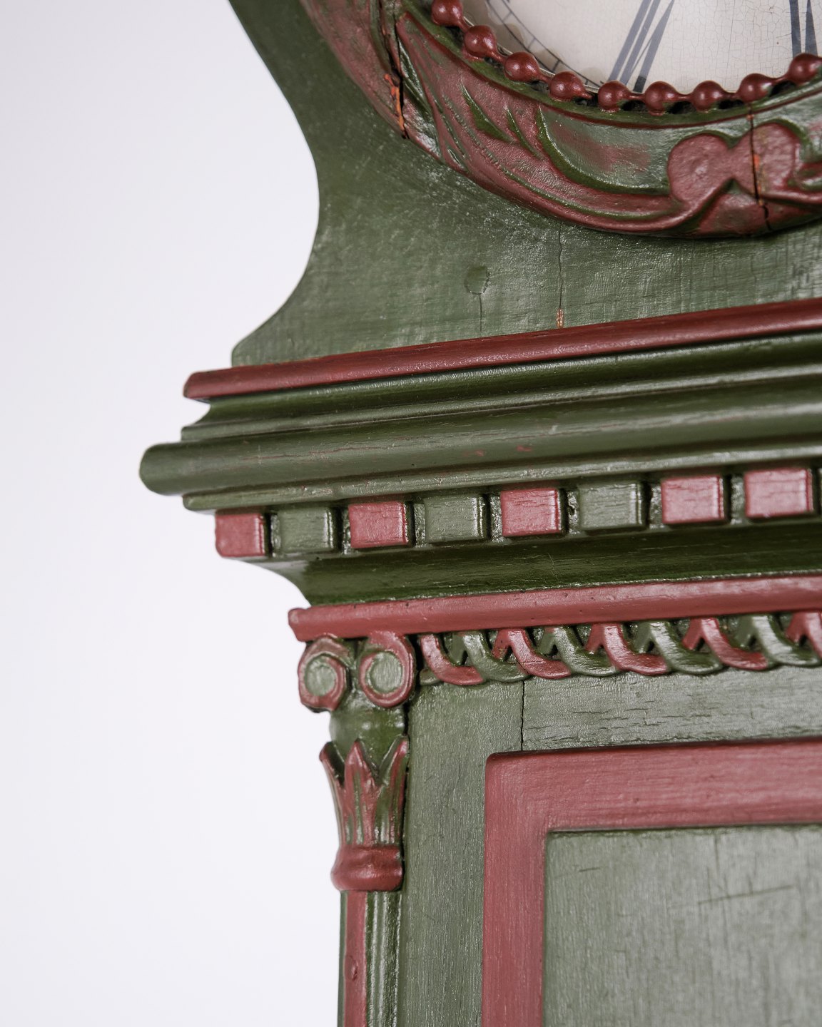 Bornholmerur frøkenmodel 1860’erne, håndmalet med udskårne detaljer i grøn/rød bemaling. Antikt bornholmer ur 1800-tallet.