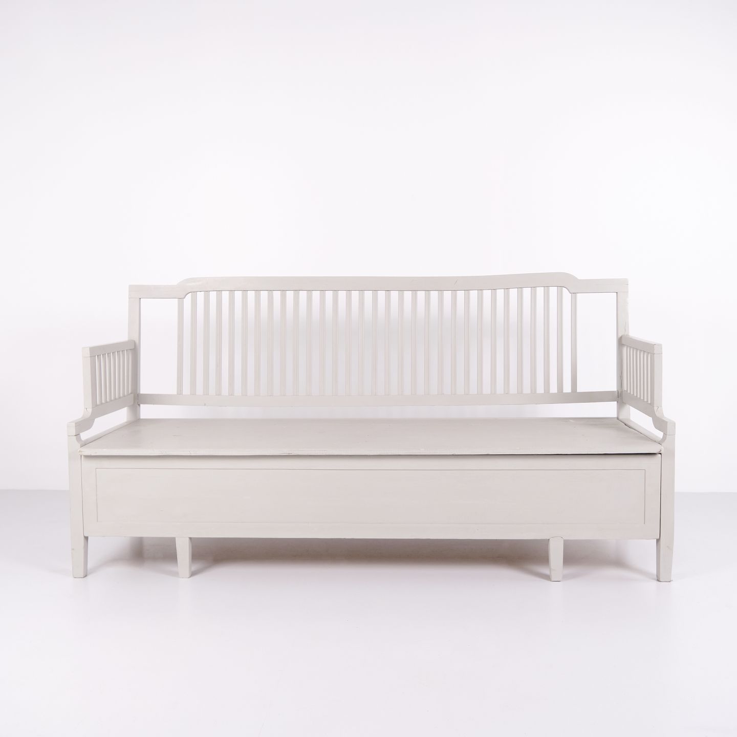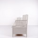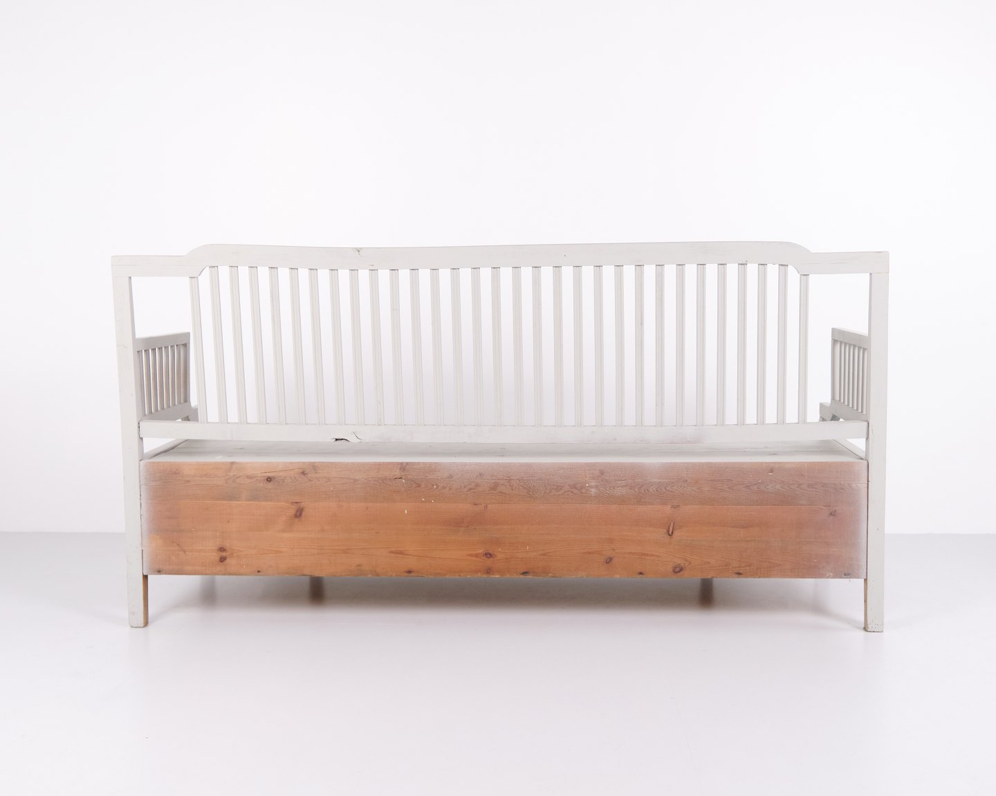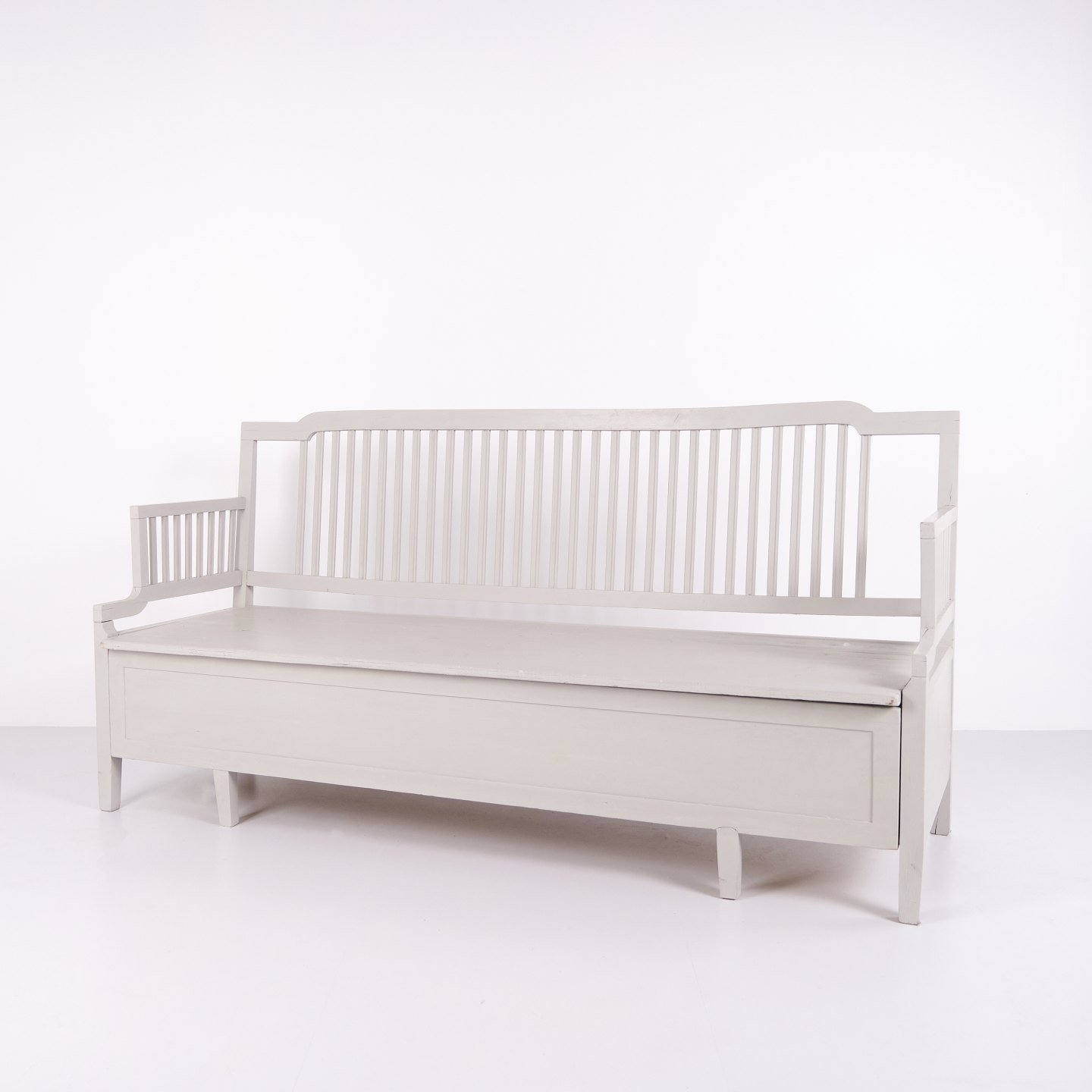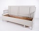 Antik slagbænk 1860’erne i gråmalet fyrretræ med høj ryg og opbevaring. Antik opbevaringsbænk 1800-tallet.