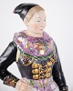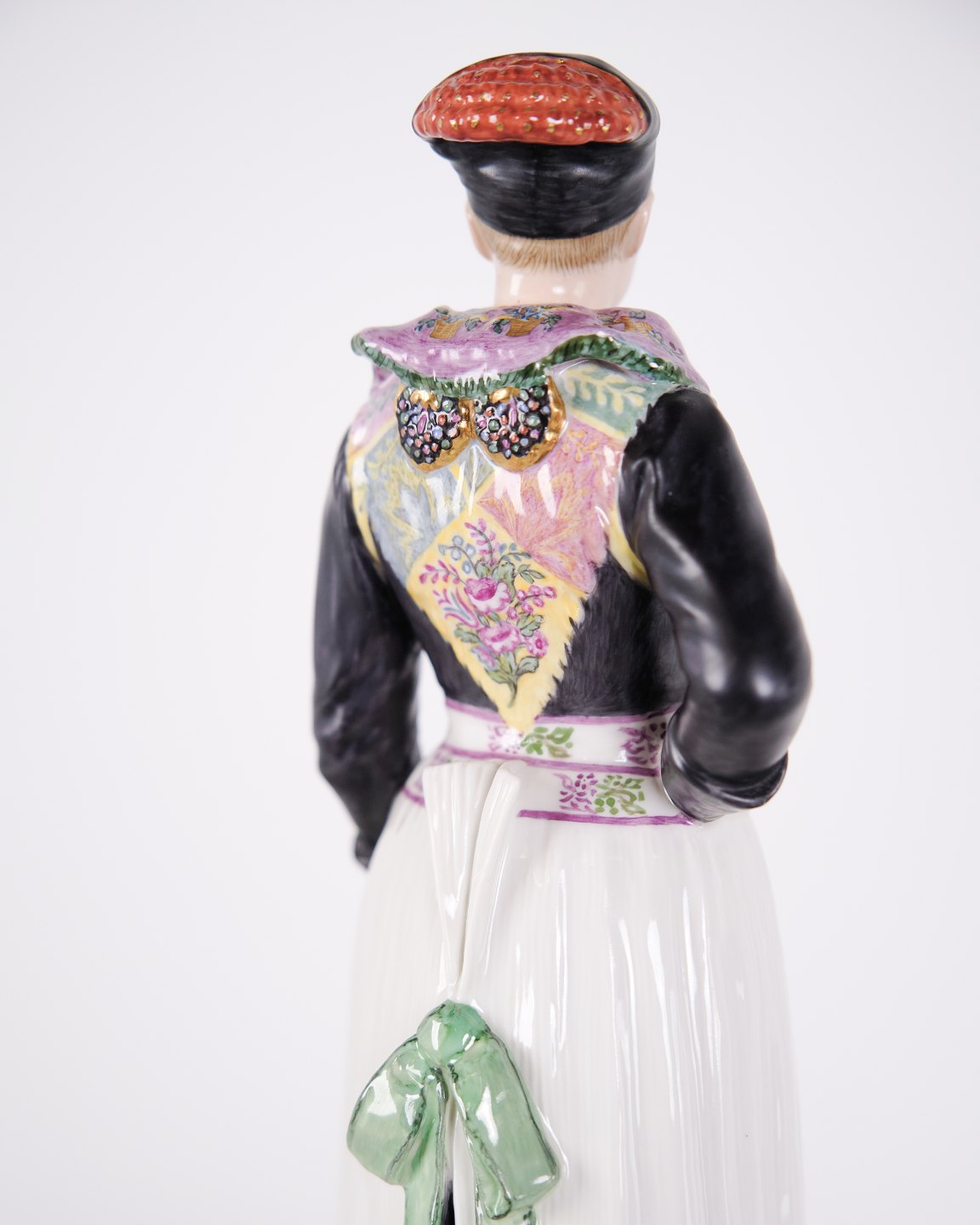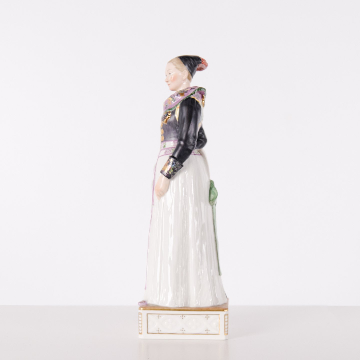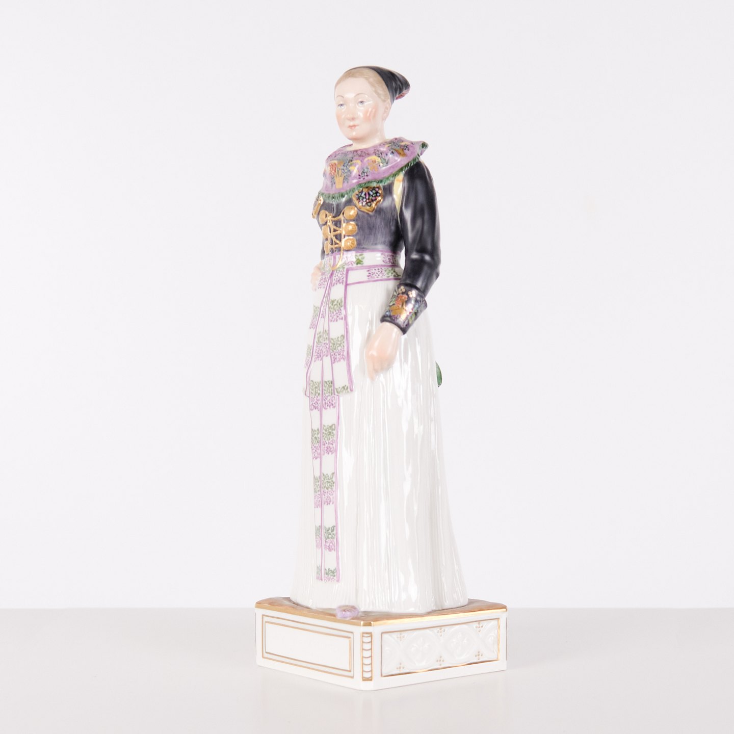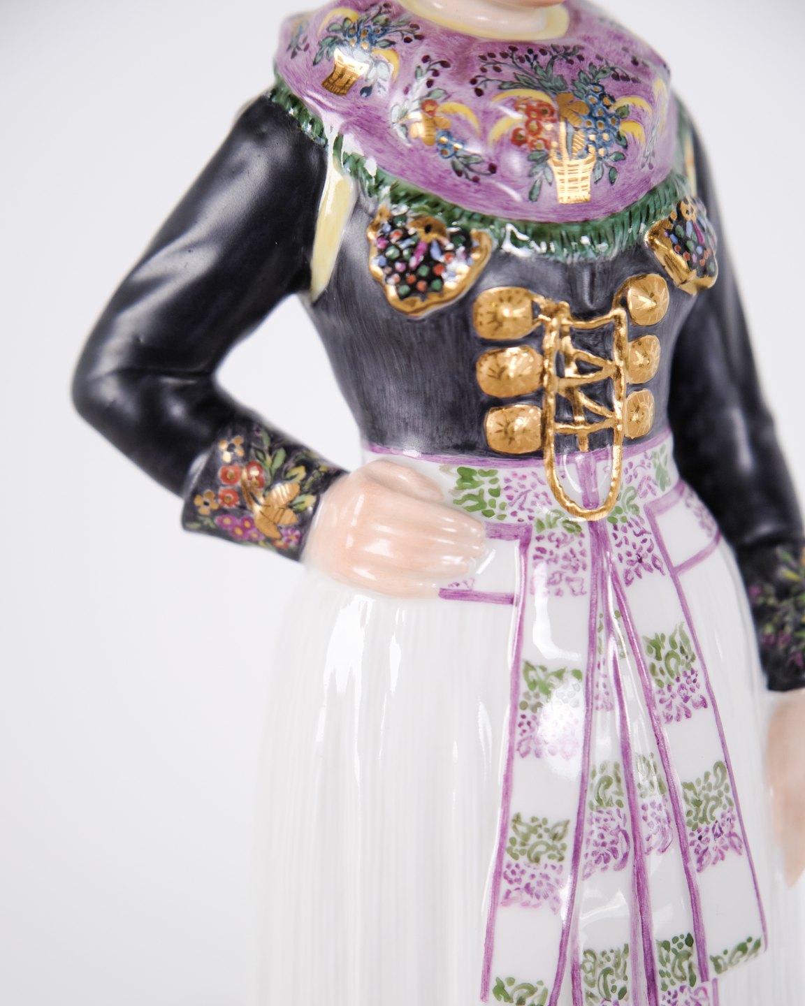 Overglasur porcelænsfigur i dansk nationaldragt, model 12104, forestillende kokkedragt fra Amager. Figuren er designet af Carl Martin-Hansen (1877–1941) for Royal Copenhagen og indgår i serien Danske Nationaldragter.