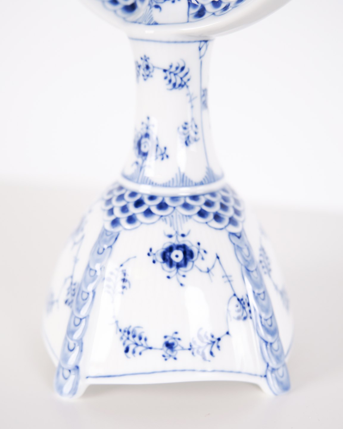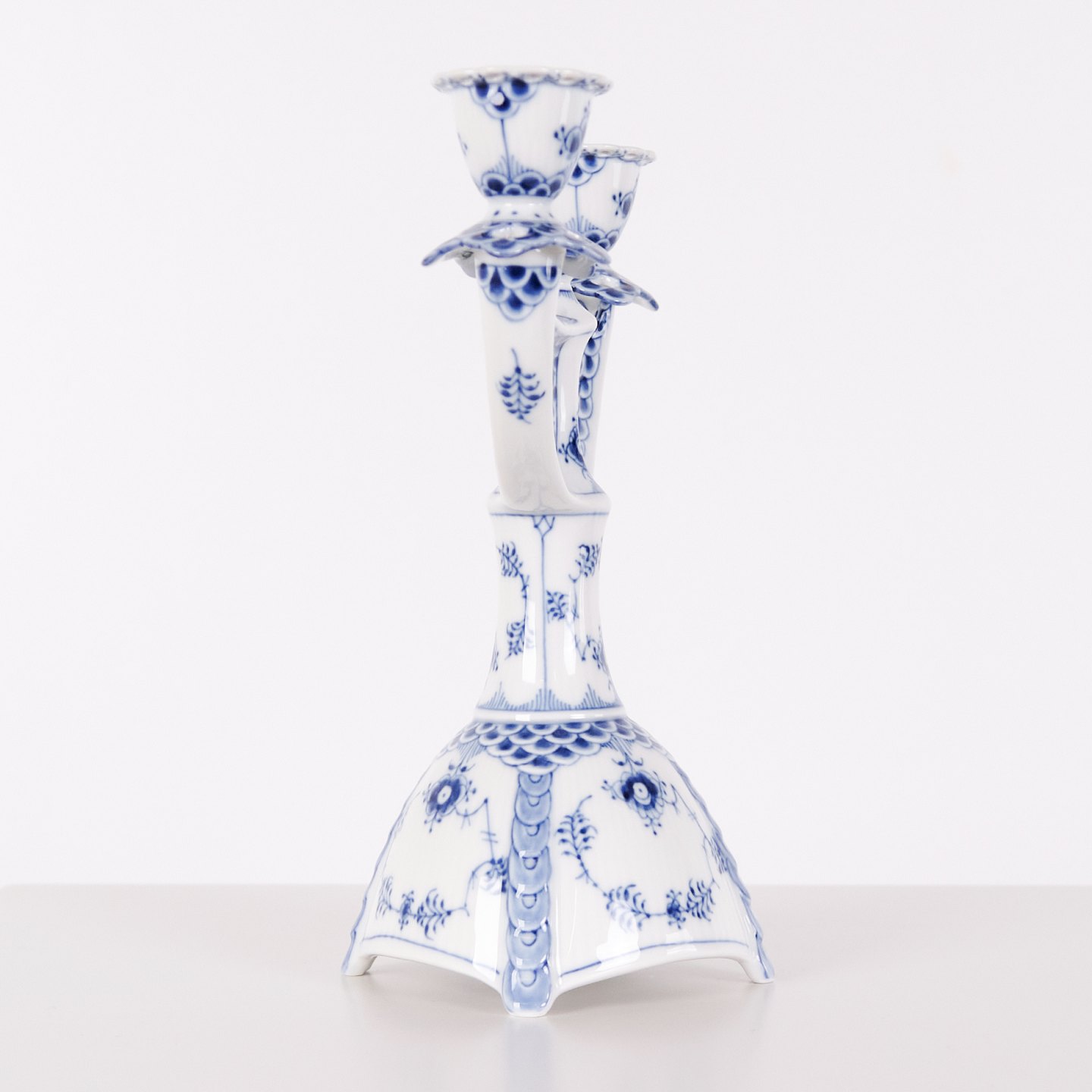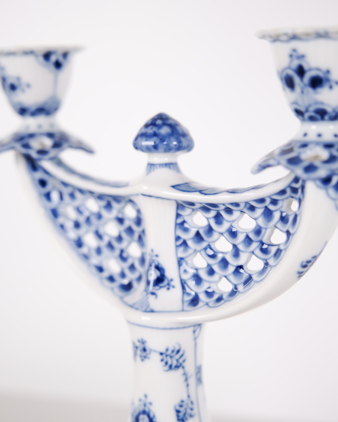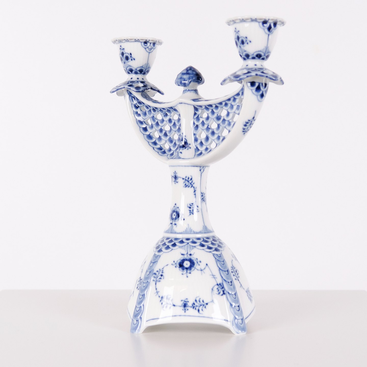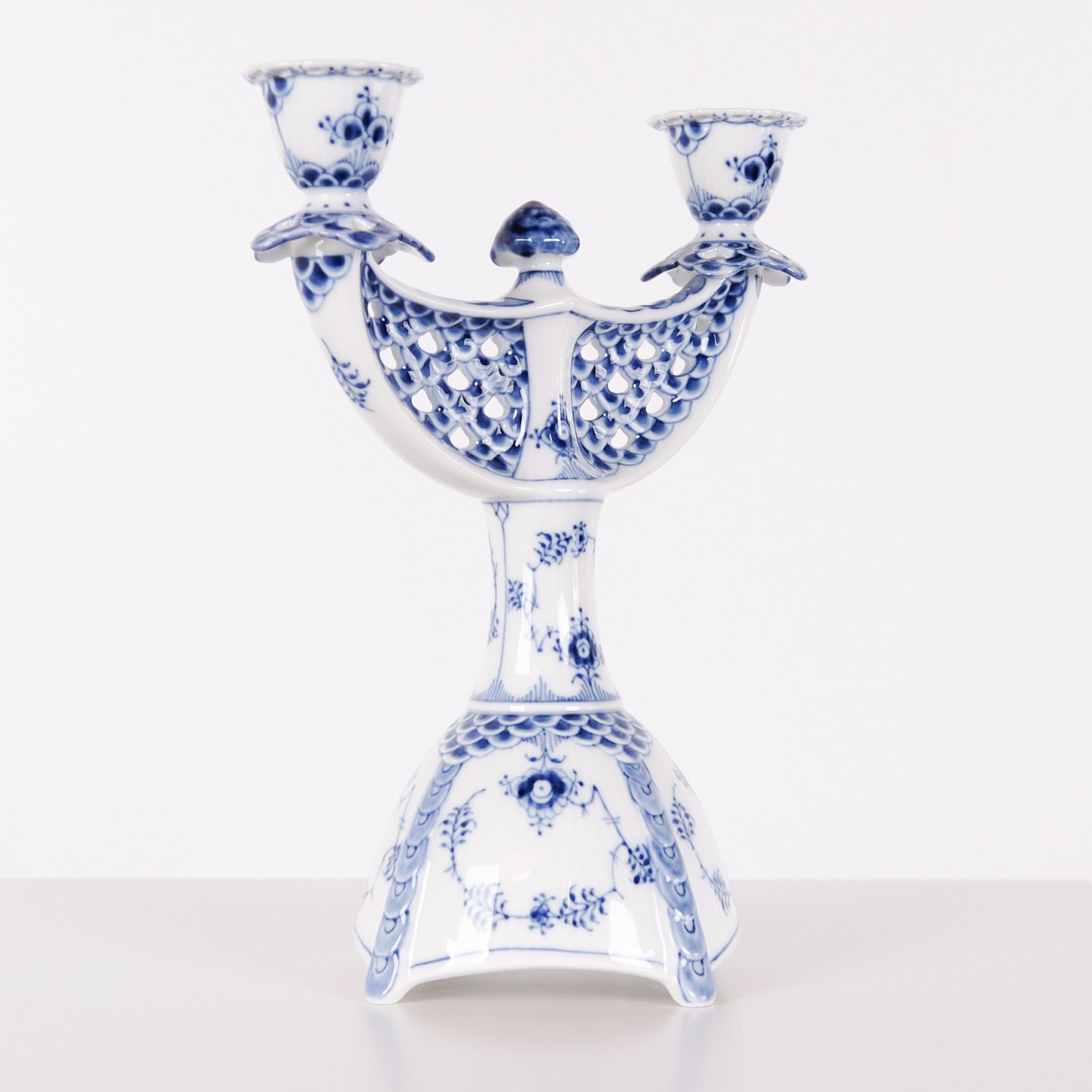 To-armet lysestage i musselmalet helblonde porcelæn, model 1169, produceret af Royal Copenhagen. Lysestagen er udført i håndmalet porcelæn med det klassiske helblonde-mønster, kendetegnet ved gennemgående gennembrudt bort og detaljeret underglasurdekoration. Modellen er produceret som 1. sortering og indgår i Royal Copenhagens traditionelle servicenproduktion.