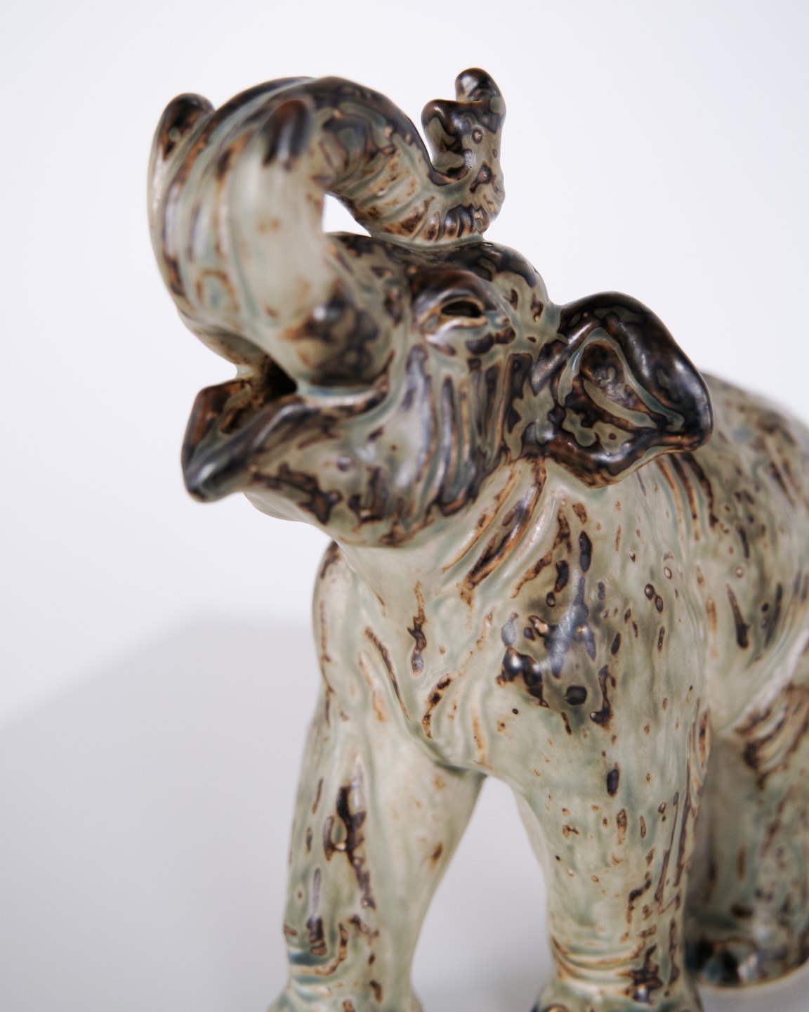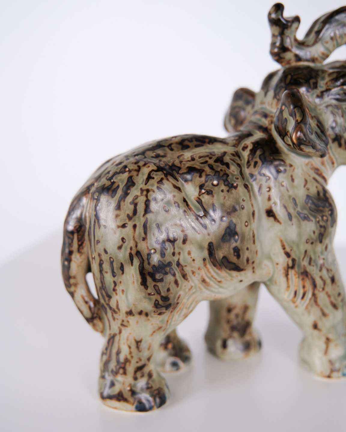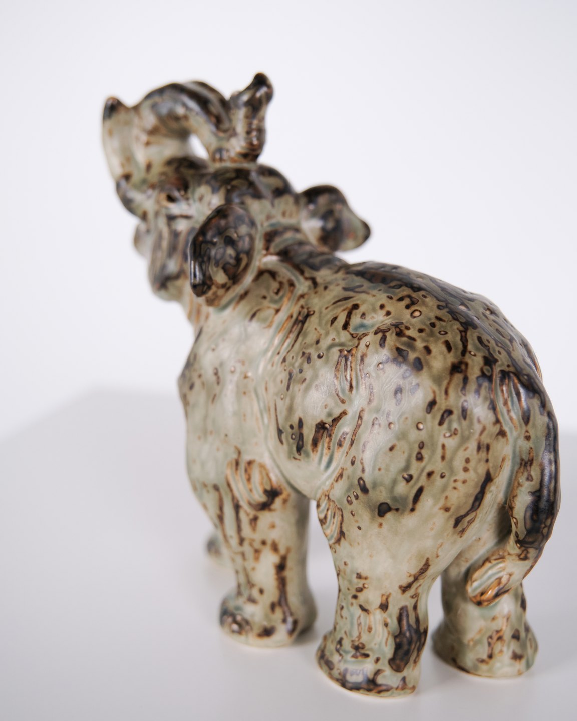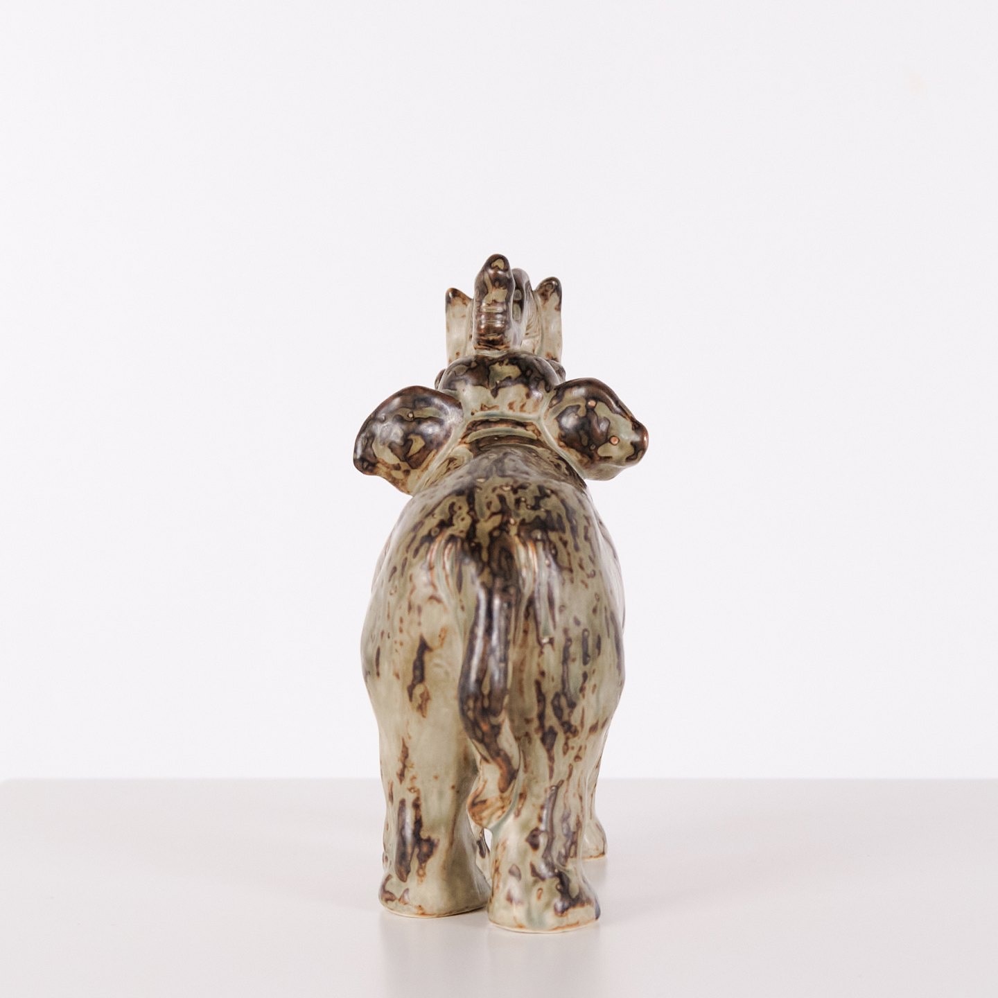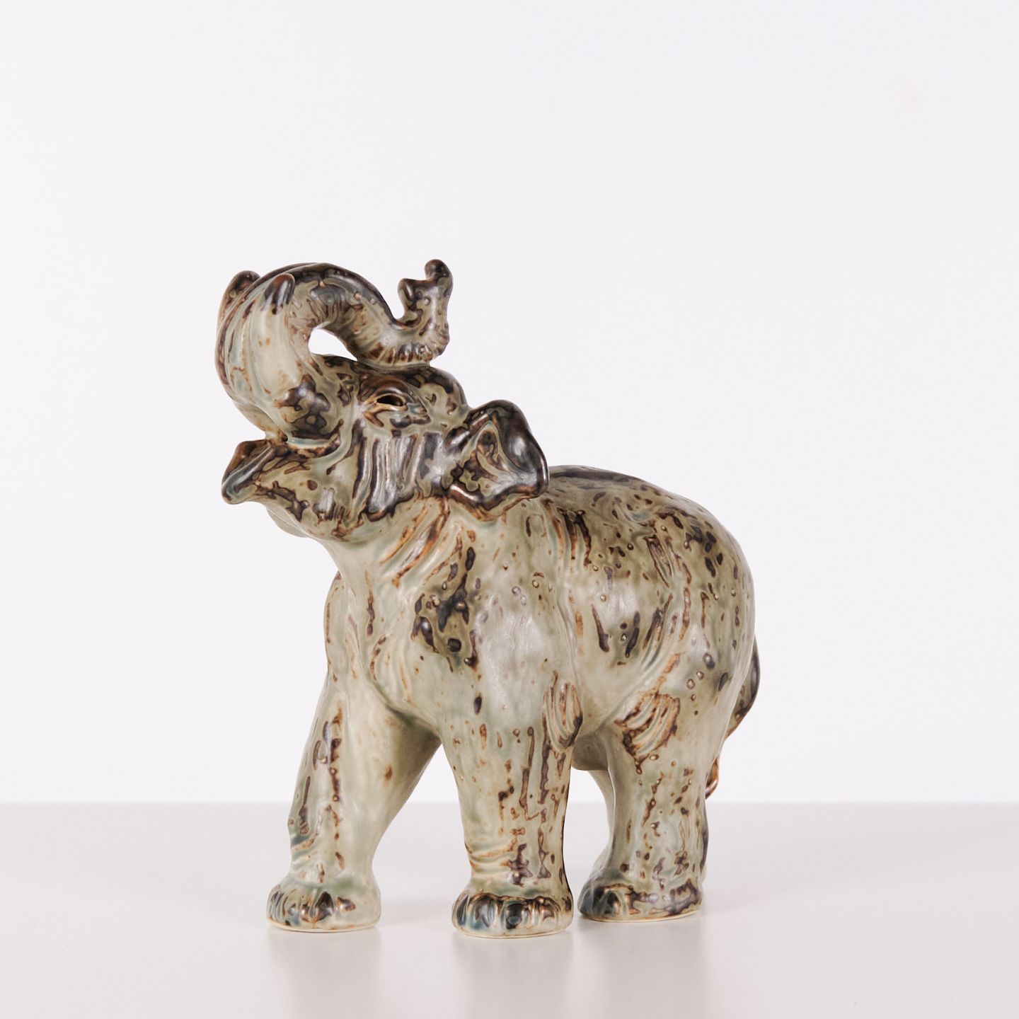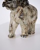 Stentøjsfigur af elefant, model 21517, designet af Knud Kyhn for Royal Copenhagen. Figuren er fremstillet i stentøj, mærket med Kyhns signatur (KK), tre bølgelinjer og modelnummeret. Kyhn arbejdede for Royal Copenhagen med dyrefigurer især i 1950’erne og 1960’erne, hvor hans motiver blev produceret i første sortering og er eftertragtede i samlermiljøer. Figuren repræsenterer dansk stentøjskunst med fokus på dyreform og proportioner.