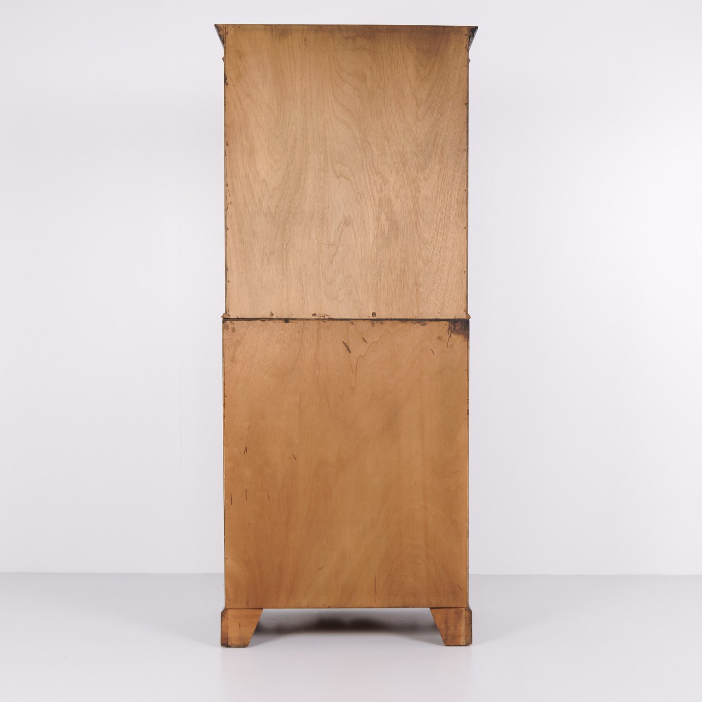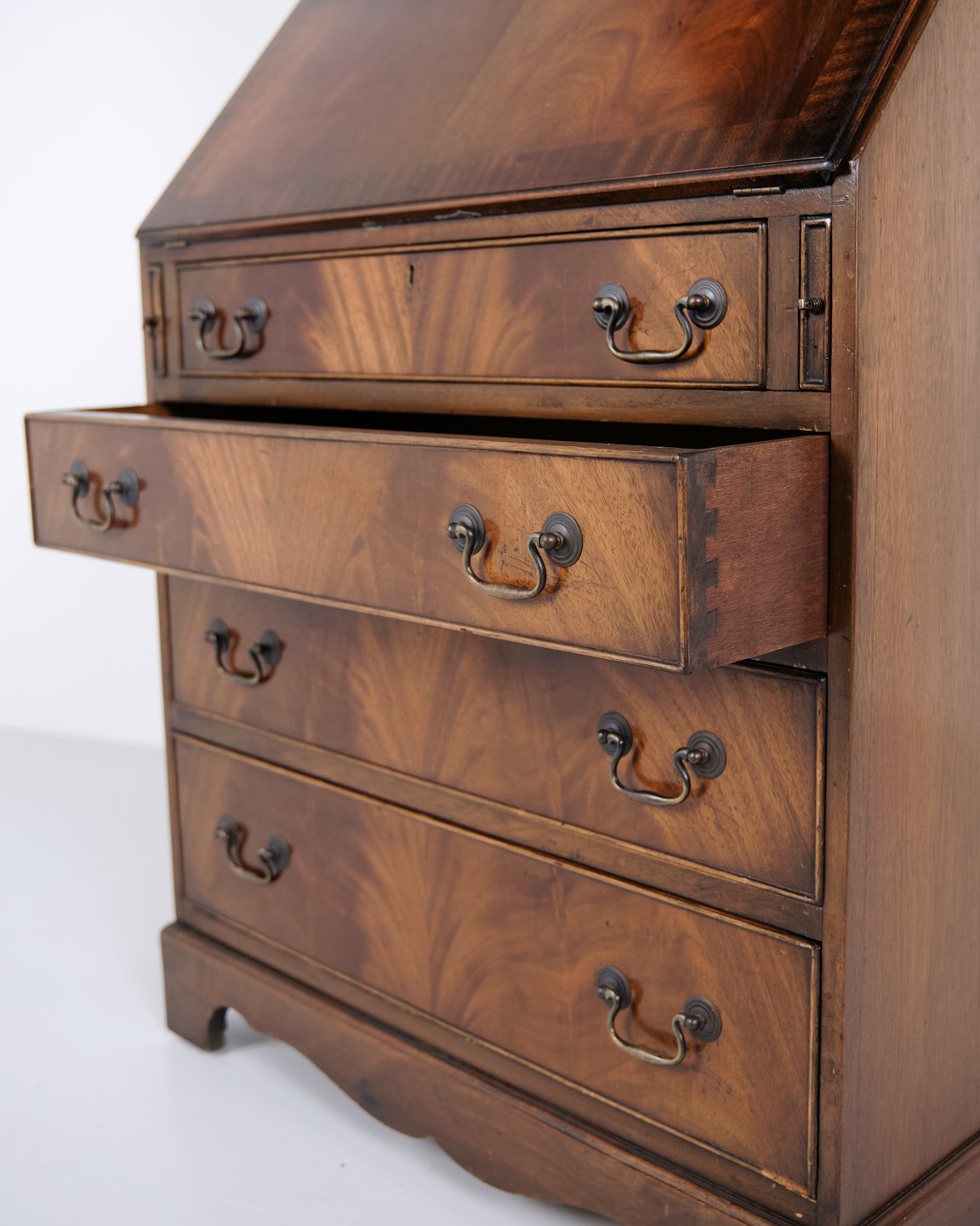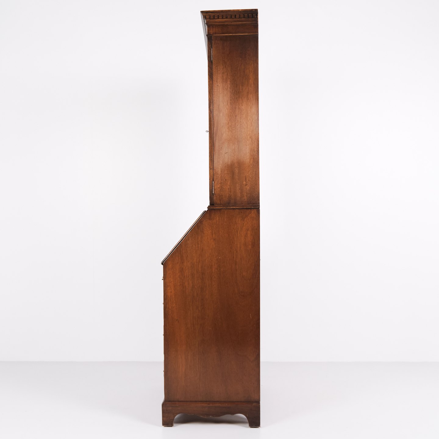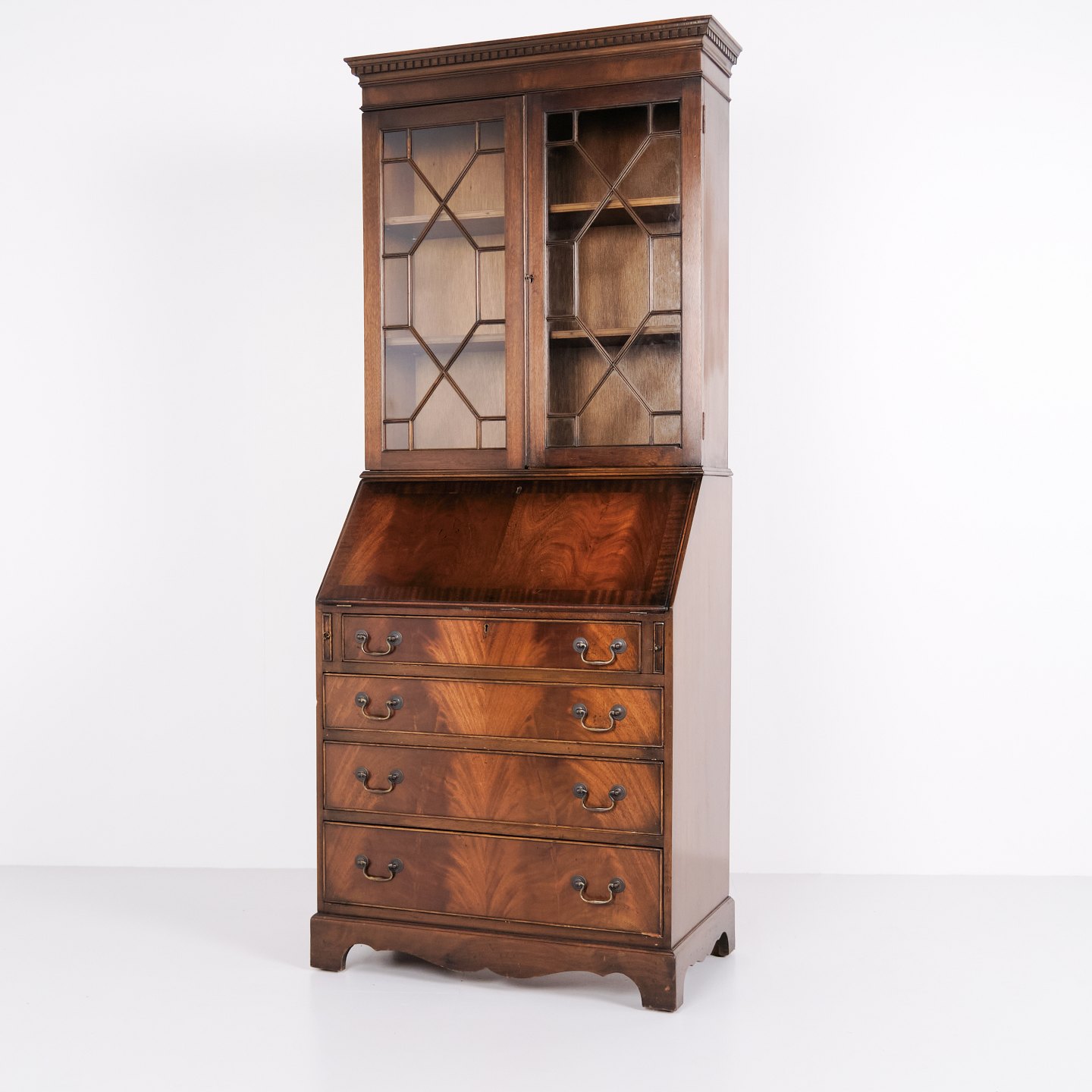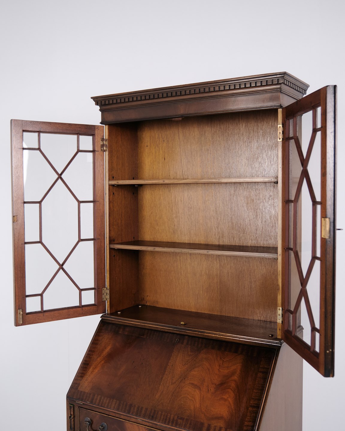 Sekretær i mahogni med skriveklap og vitrine i klassisk engelsk stil fra ca. 1890. Elegant og funktionelt antikt møbel.