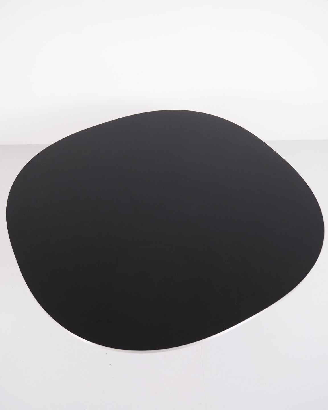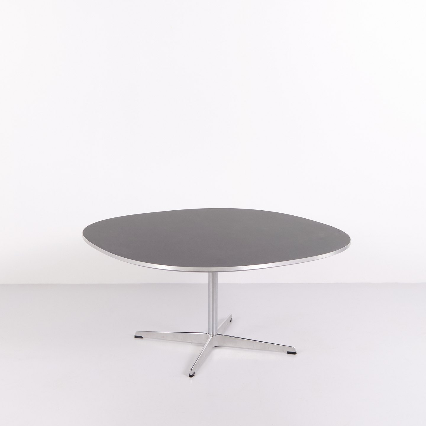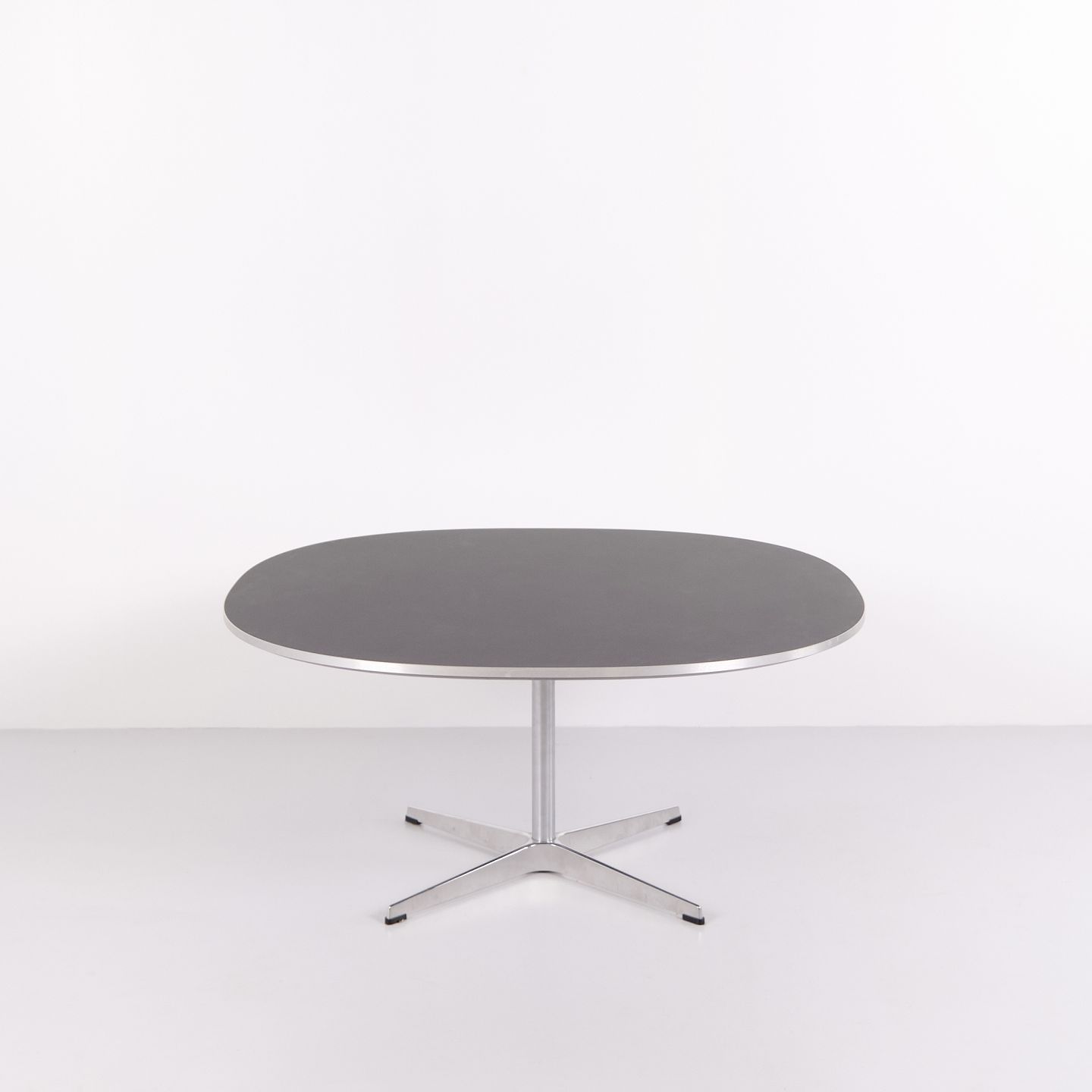 Dette eksemplar er fremstillet hos Fritz Hansen i 2023 og er udført med stel i aluminium og bordplade i sort laminat. Bordet fremstår som et nutidigt eksempel på det klassiske danske design.