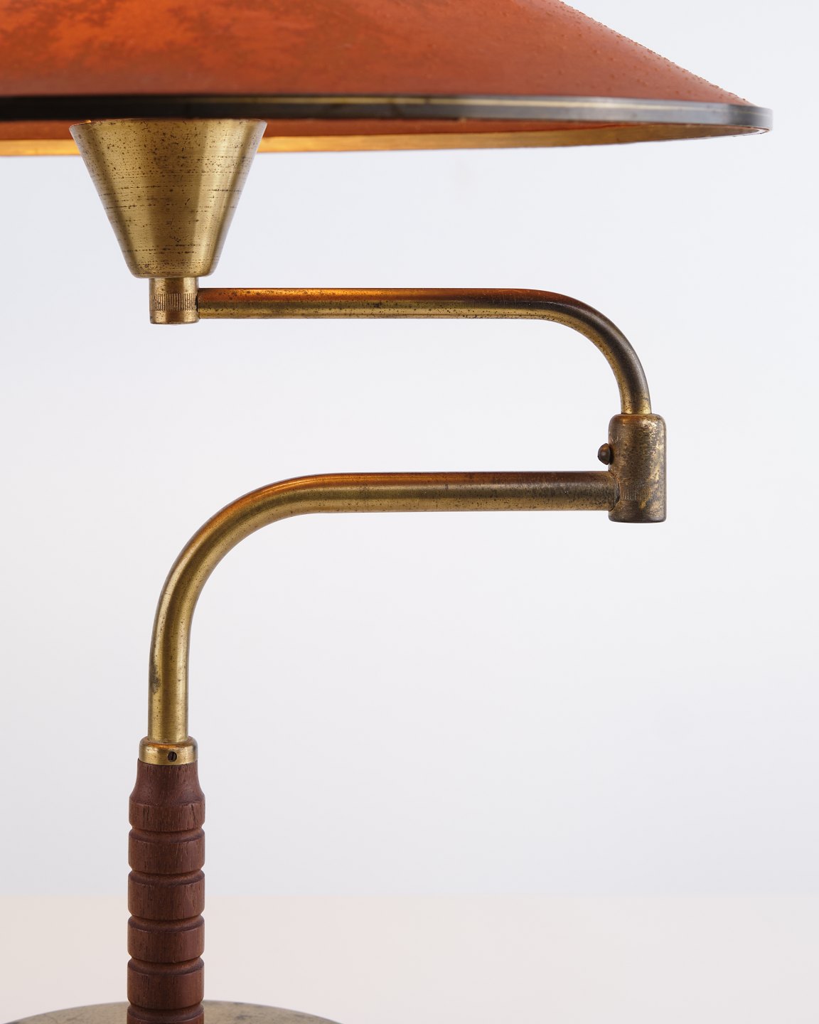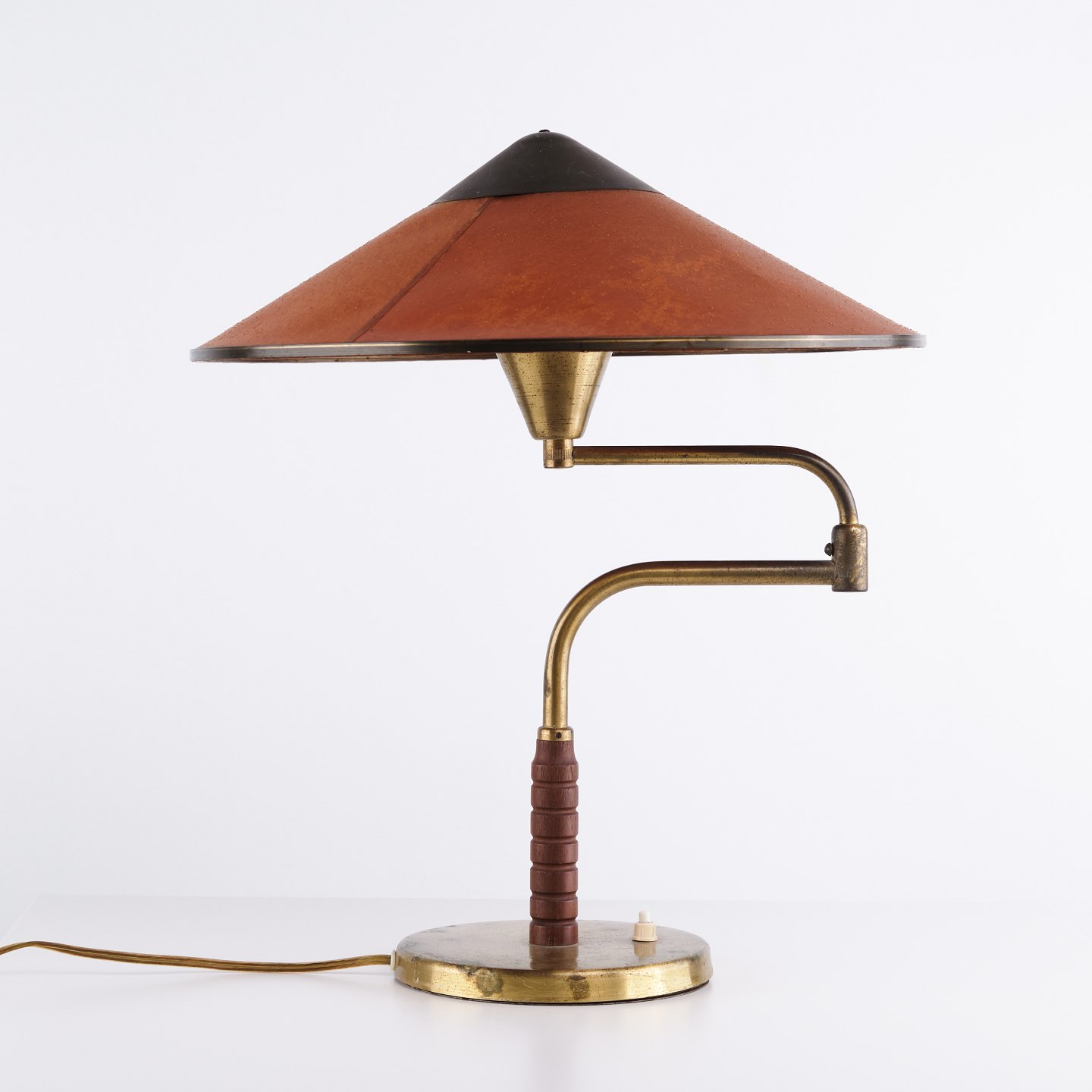 LYFA bordlampe fra 1930/40’erne i patineret messing med svingarm og original ravfarvet skærm i svinehud. Klassisk dansk belysning.